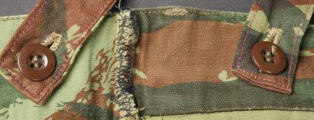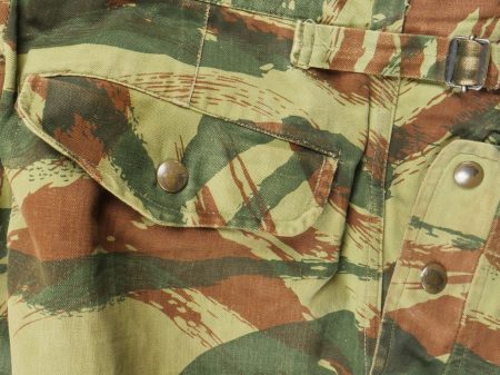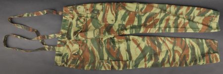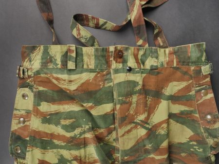 Pantalon TAP 4756 camouflé. Pantalon en toile camouflée 56, pressions, pas d’œillets aux poches. Deux poches de fesse indiquant une fabrication avant 1961, brides de serrage aux hanches,... en savoir plus