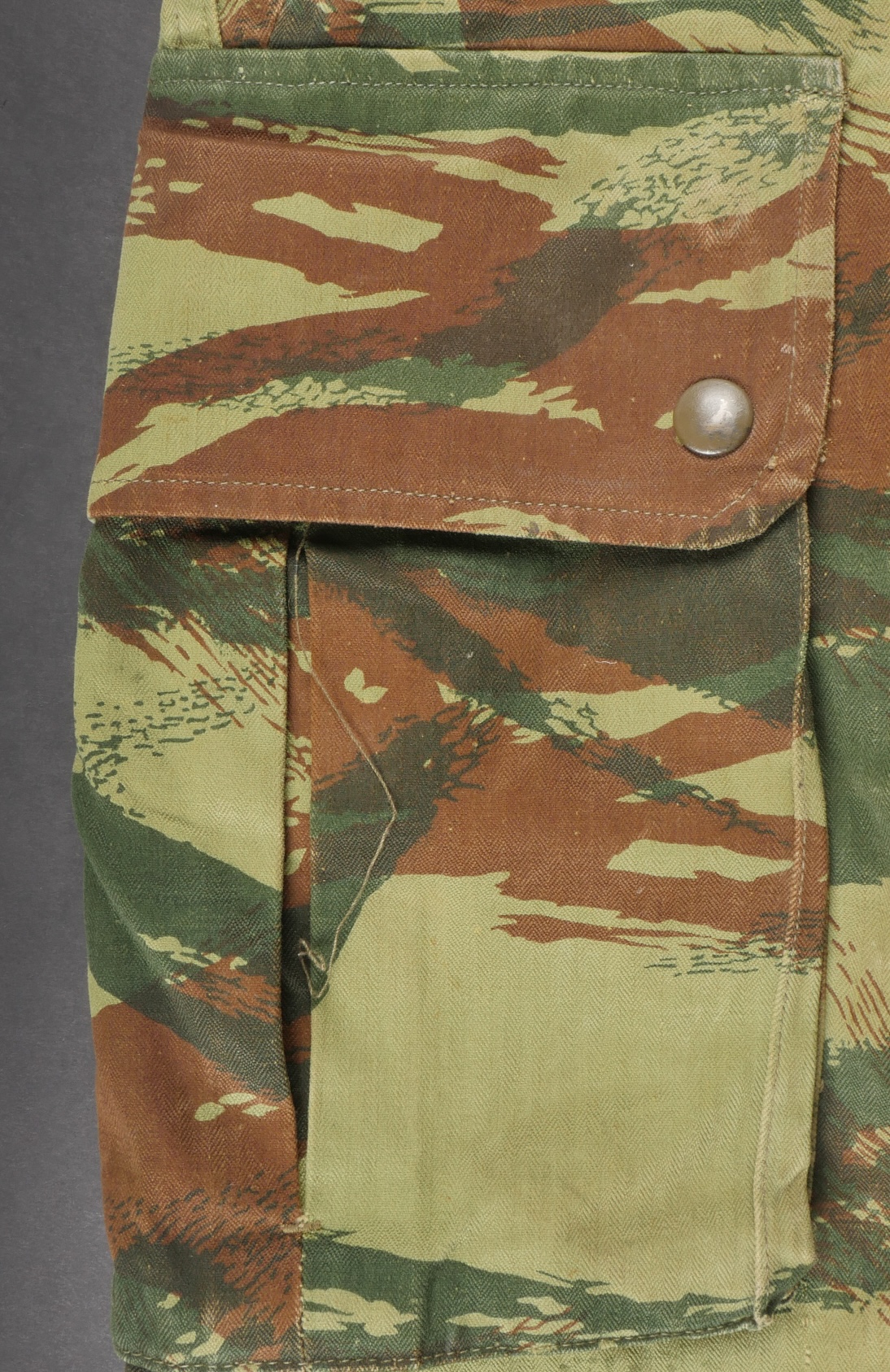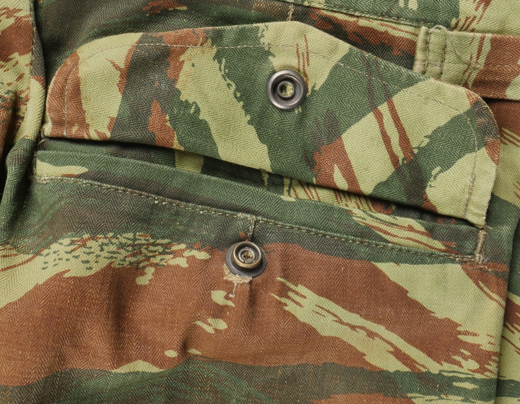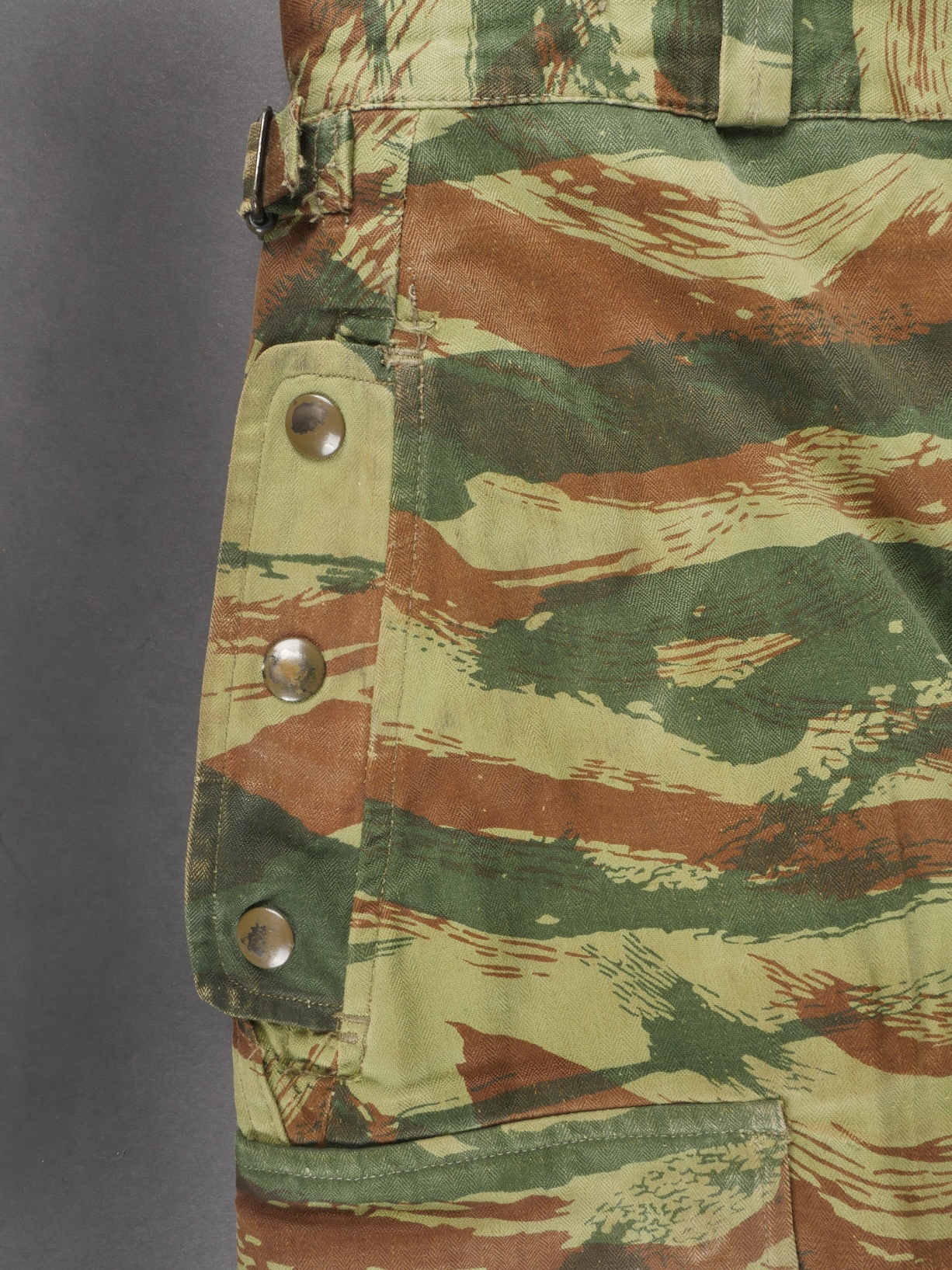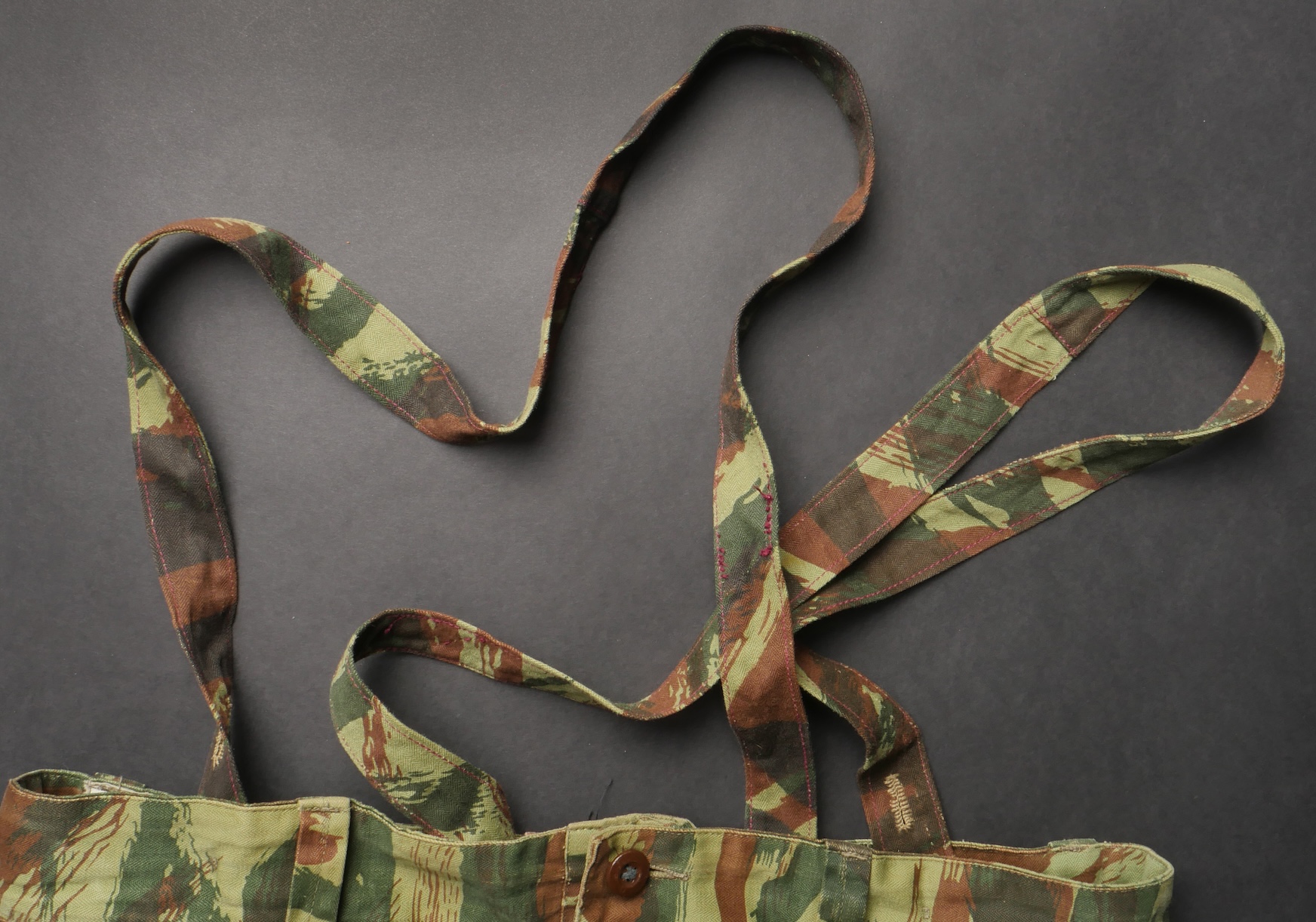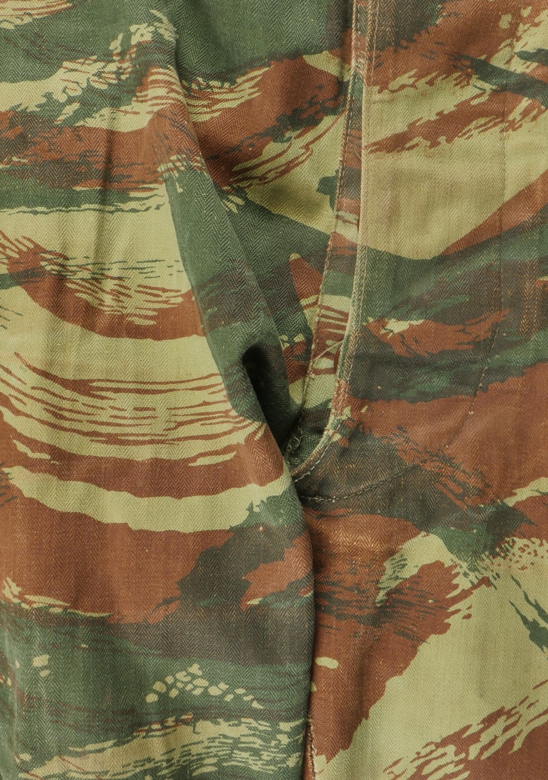 Pantalon TAP 4756 camouflé. Pantalon en toile camouflée 56, pressions, pas d’œillets aux poches. Deux poches de fesse indiquant une fabrication avant 1961, brides de serrage aux hanches,... en savoir plus