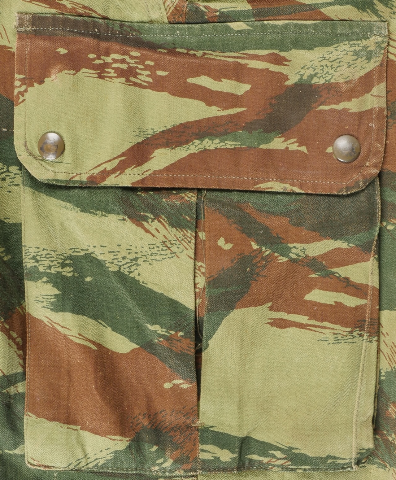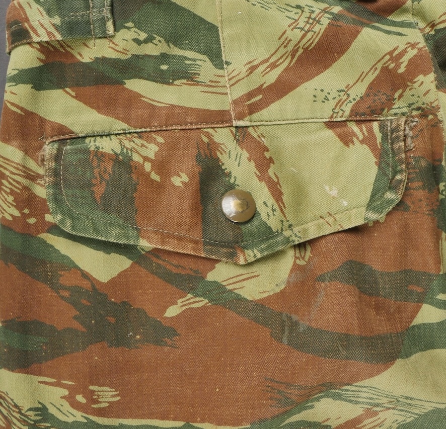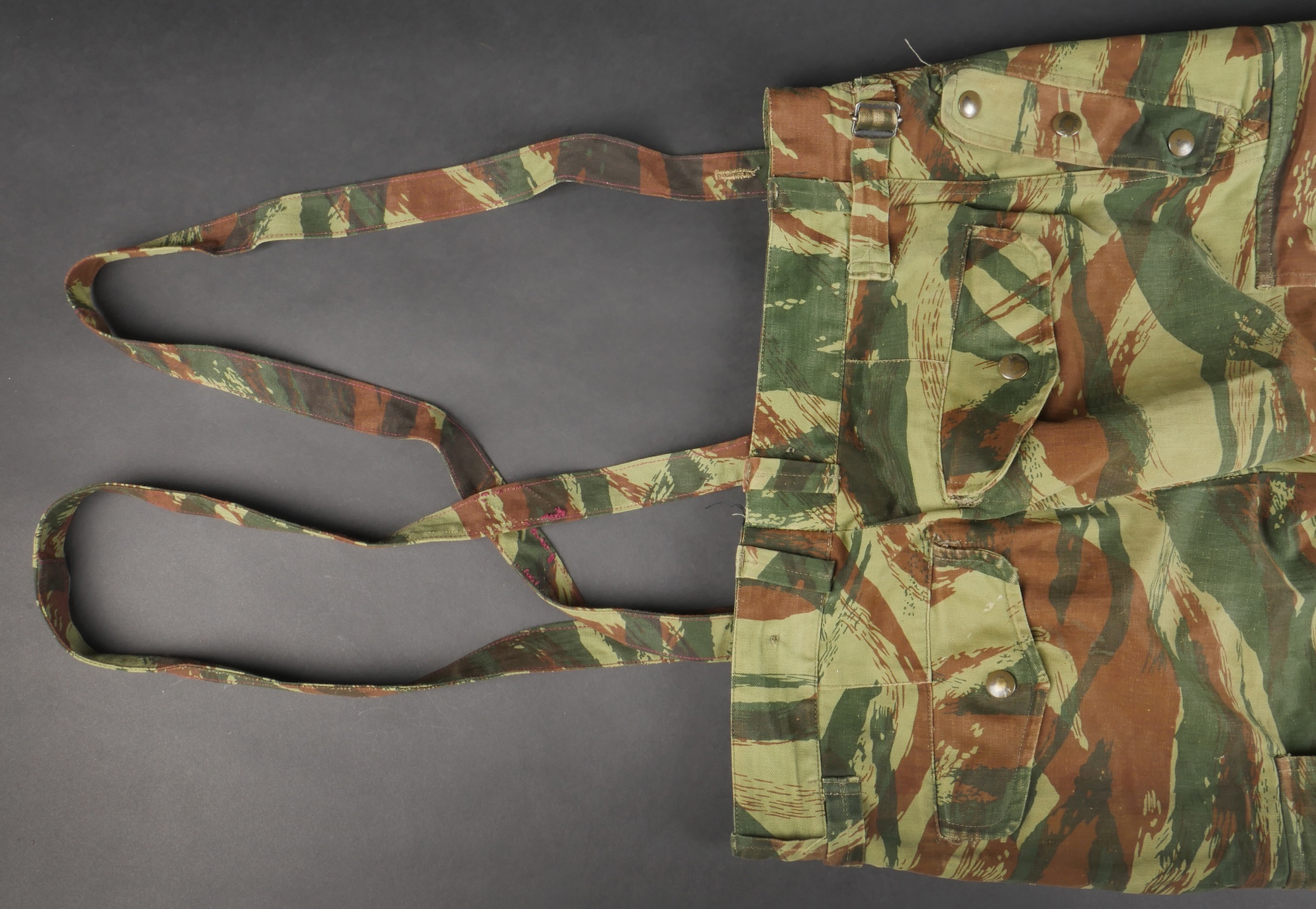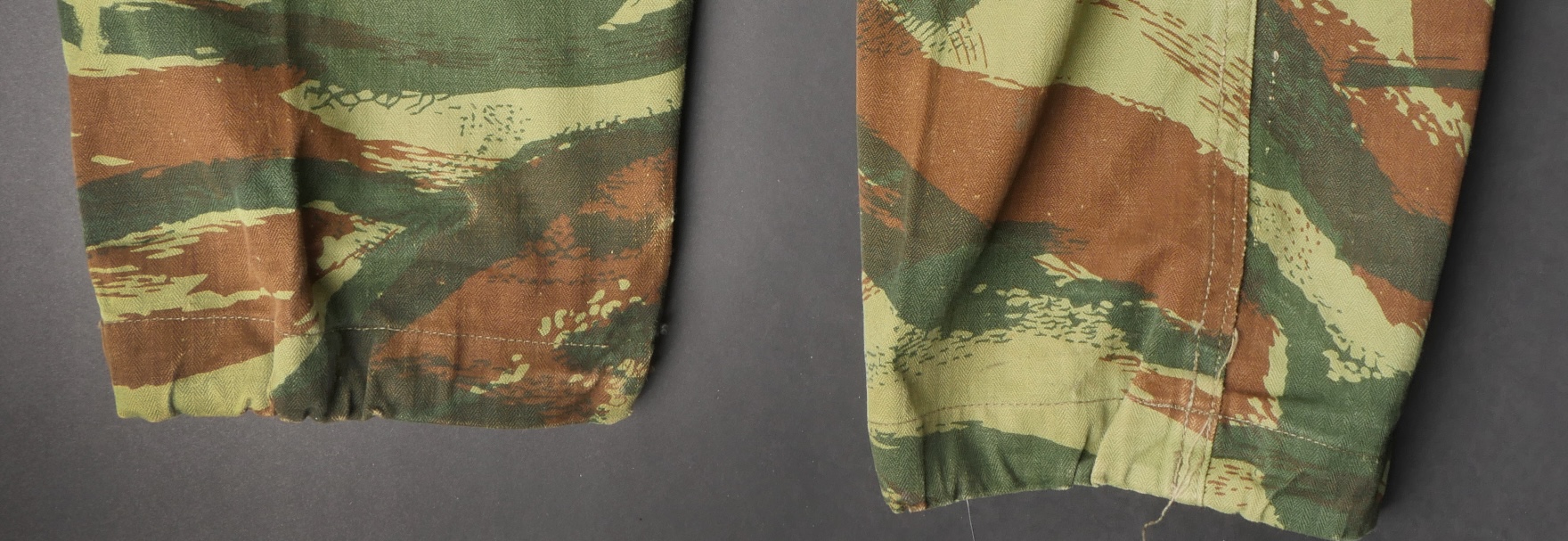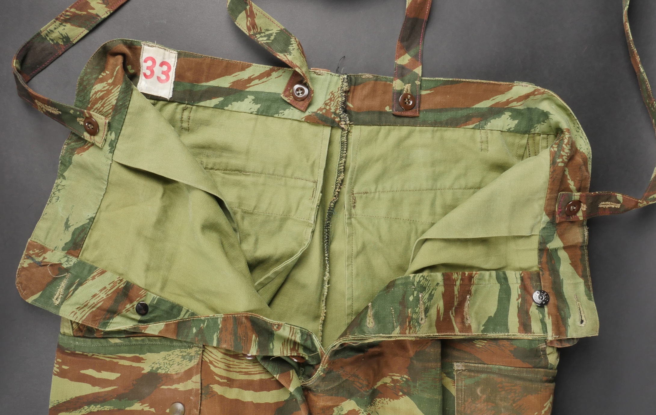 Pantalon TAP 4756 camouflé. Pantalon en toile camouflée 56, pressions, pas d’œillets aux poches. Deux poches de fesse indiquant une fabrication avant 1961, brides de serrage aux hanches,... en savoir plus