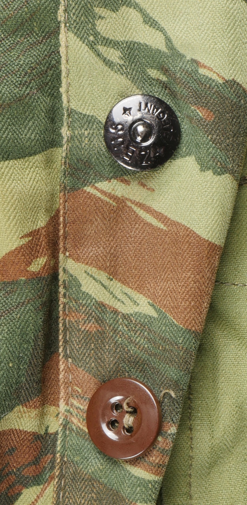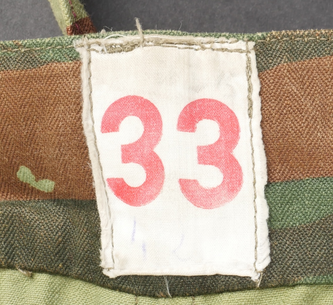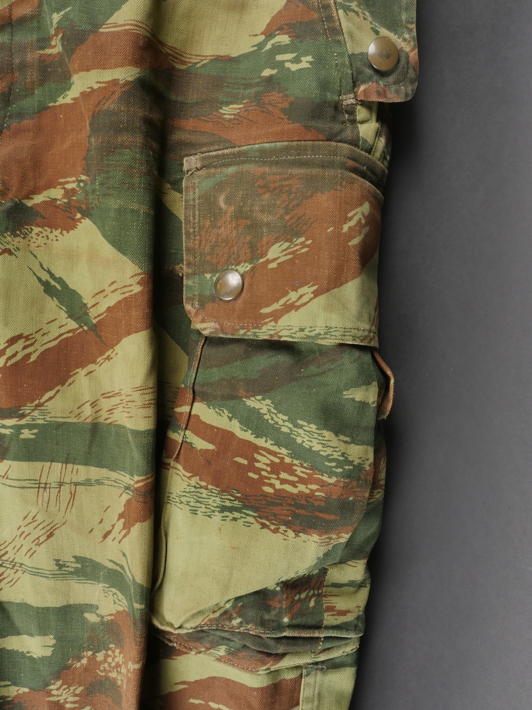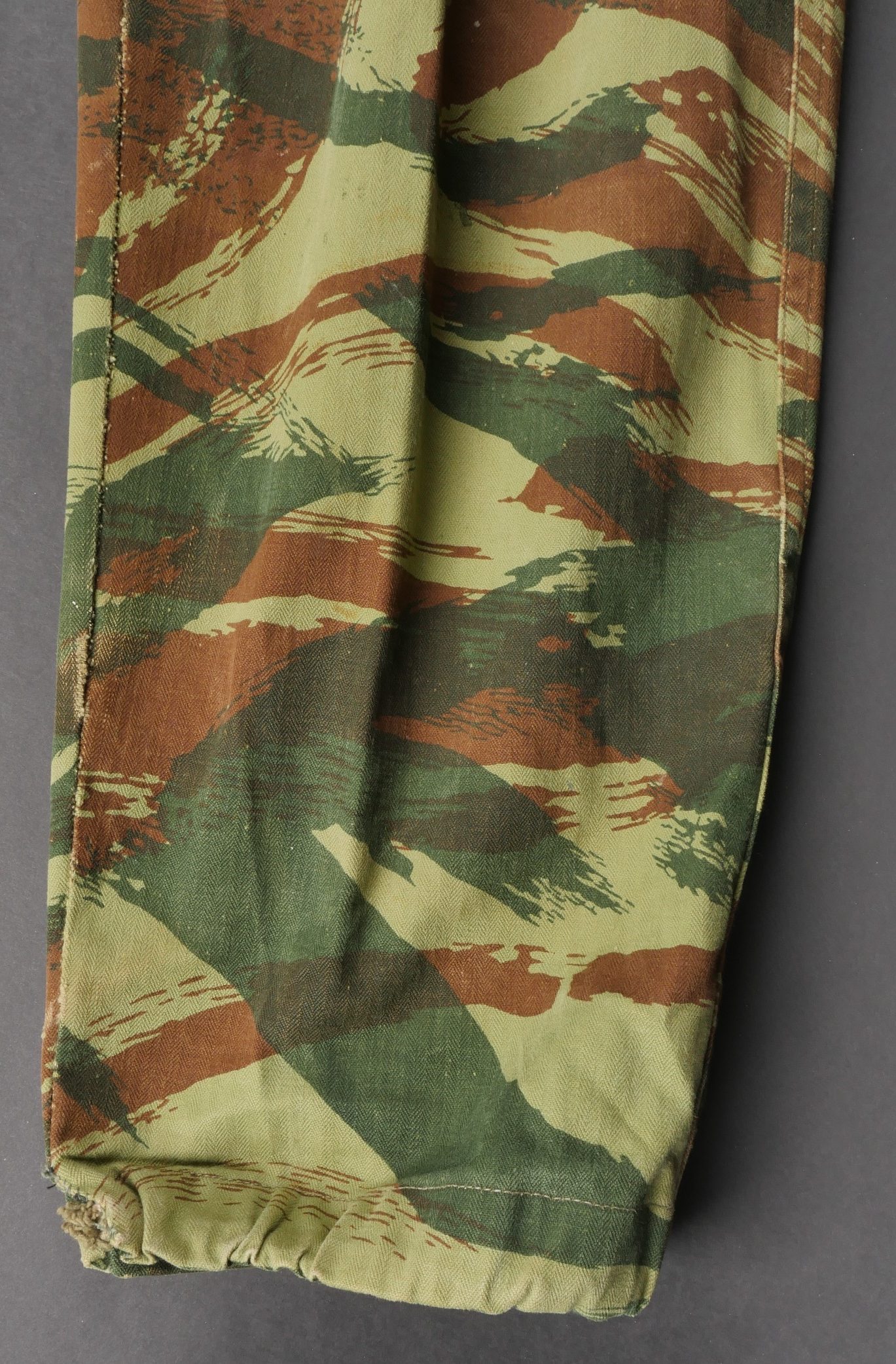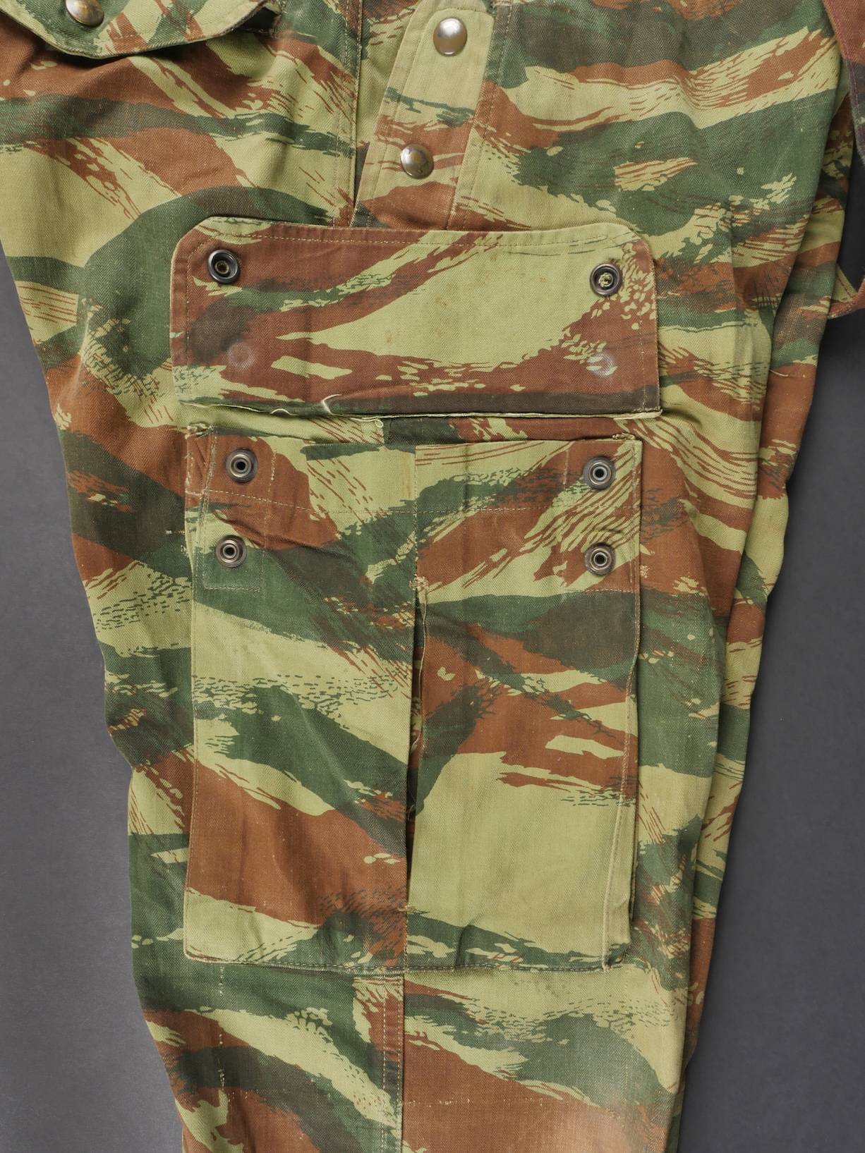 Pantalon TAP 4756 camouflé. Pantalon en toile camouflée 56, pressions, pas d’œillets aux poches. Deux poches de fesse indiquant une fabrication avant 1961, brides de serrage aux hanches,... en savoir plus