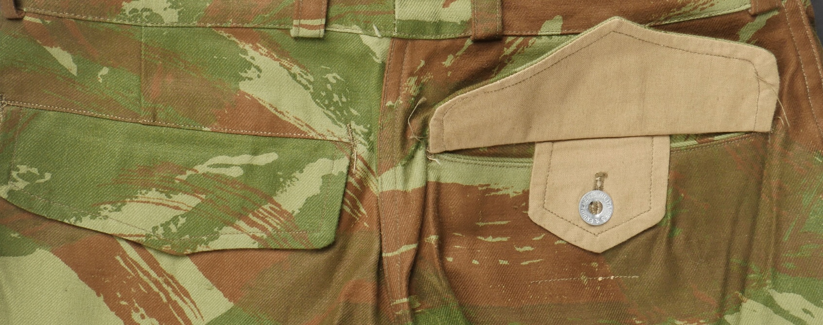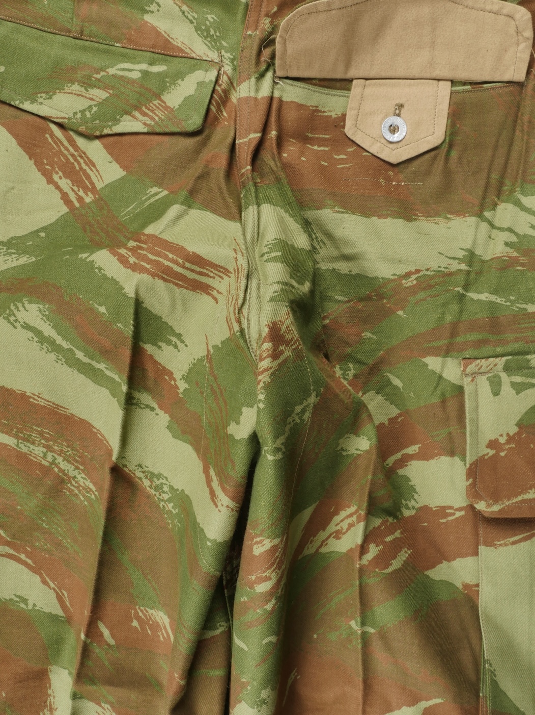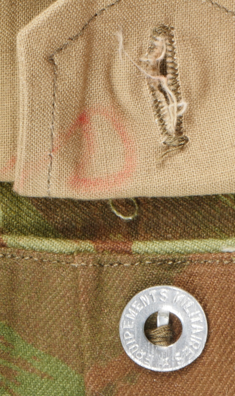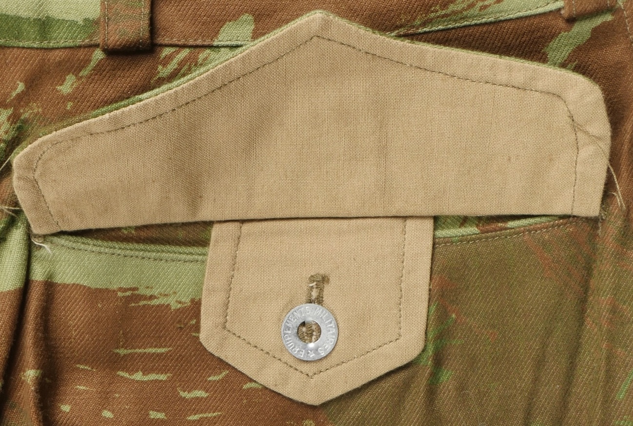 Pantalon TTA 4753. Pantalon se fermant par une série de boutons dont les deux derniers sont apparents, entièrement camouflé dans une toile type 53, doublure en coton marron, marquage fabricant... en savoir plus