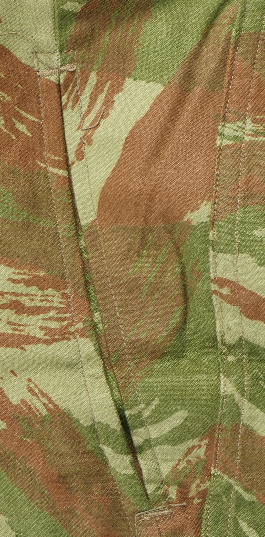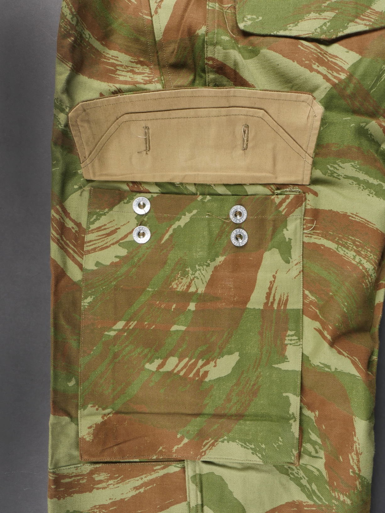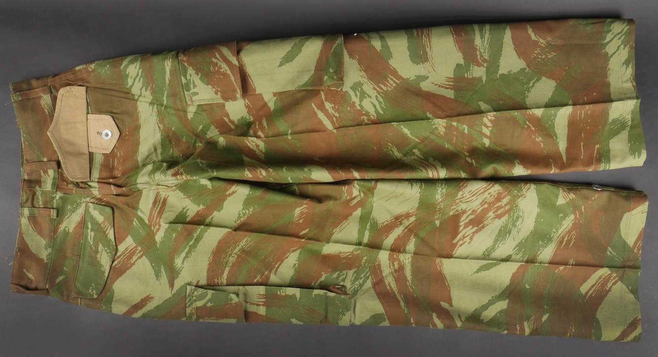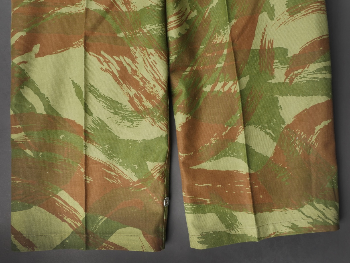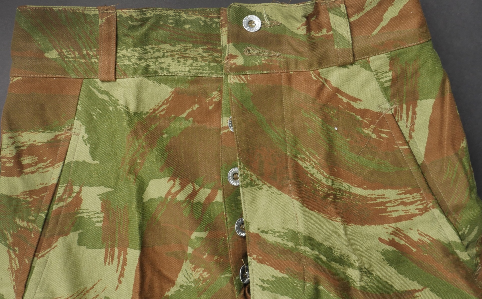 Pantalon TTA 4753. Pantalon se fermant par une série de boutons dont les deux derniers sont apparents, entièrement camouflé dans une toile type 53, doublure en coton marron, marquage fabricant... en savoir plus