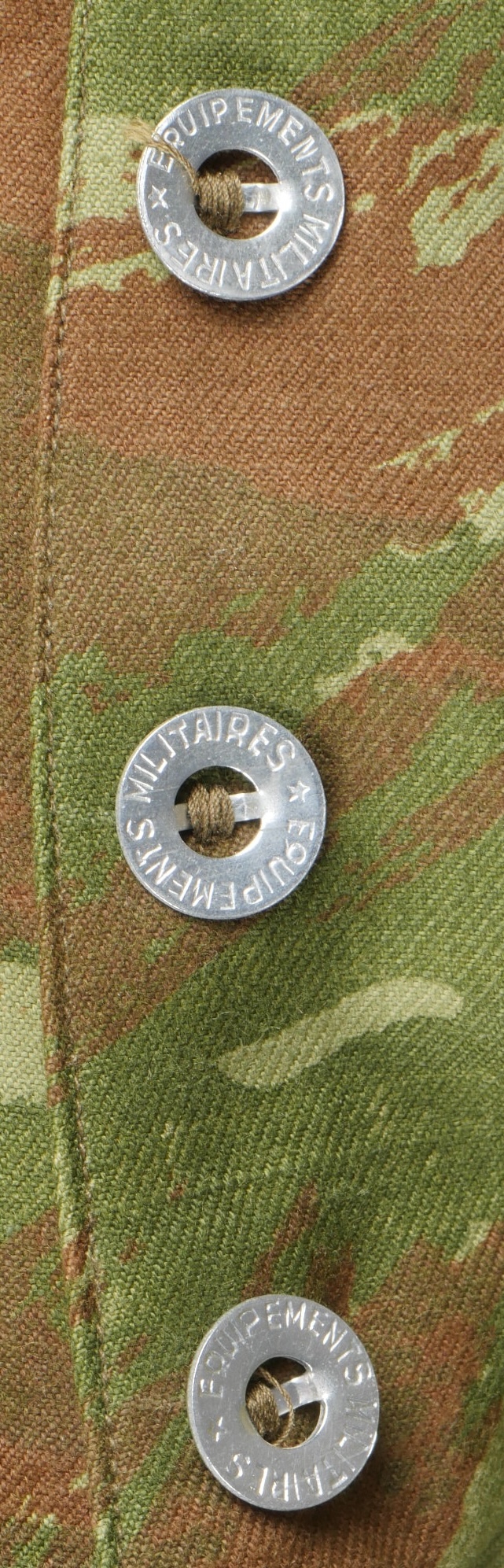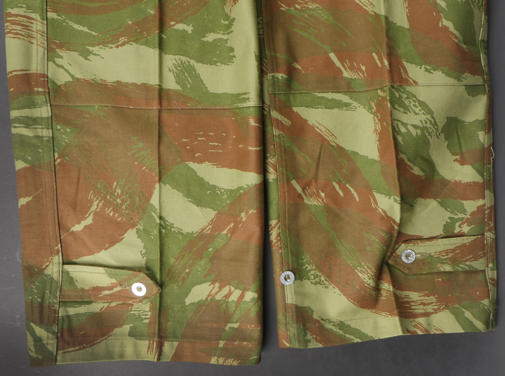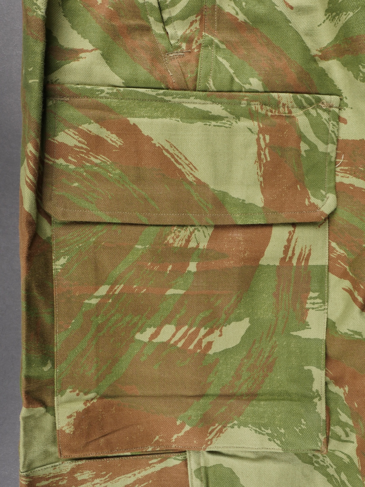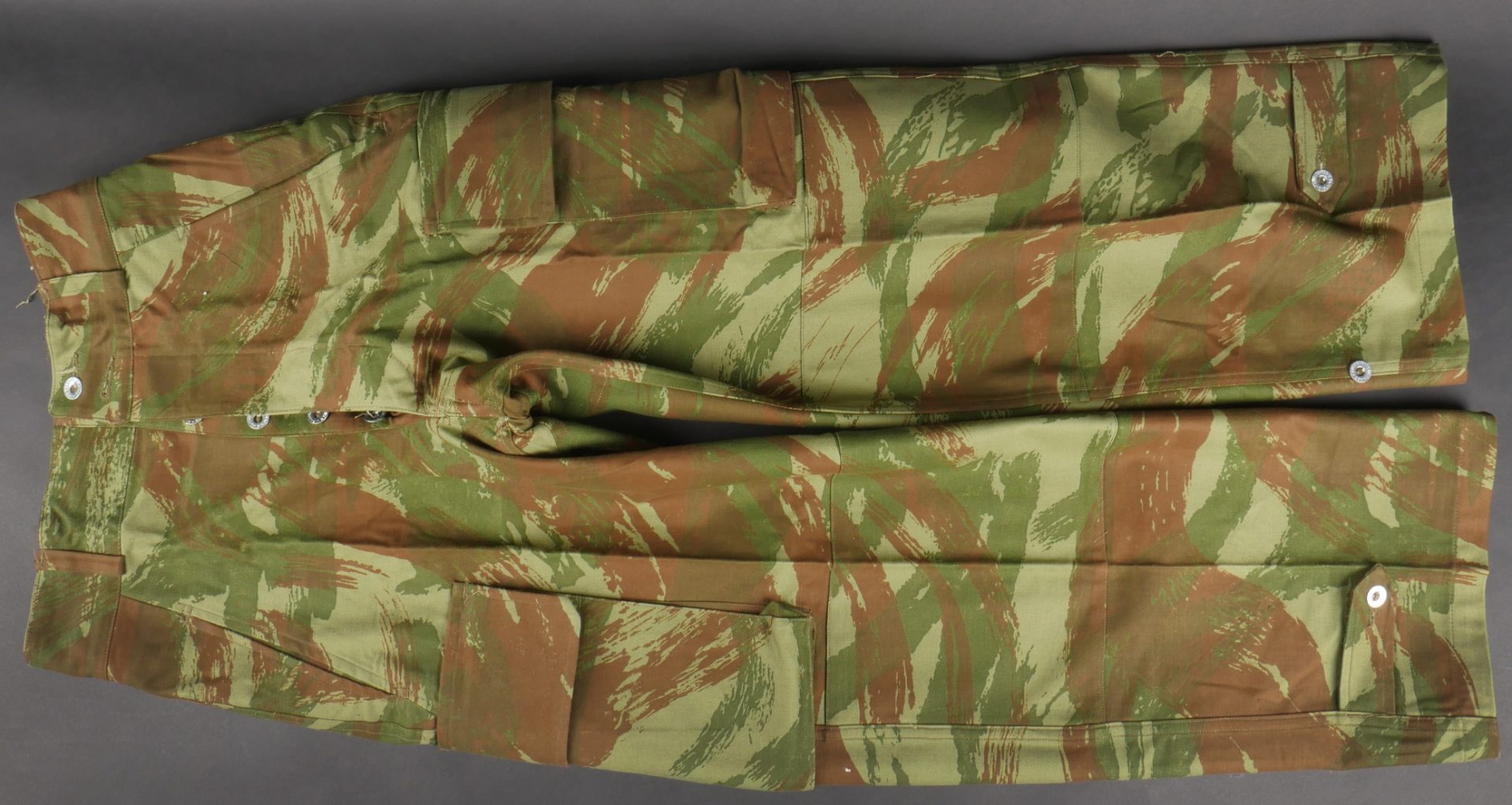 Pantalon TTA 4753. Pantalon se fermant par une série de boutons dont les deux derniers sont apparents, entièrement camouflé dans une toile type 53, doublure en coton marron, marquage fabricant... en savoir plus