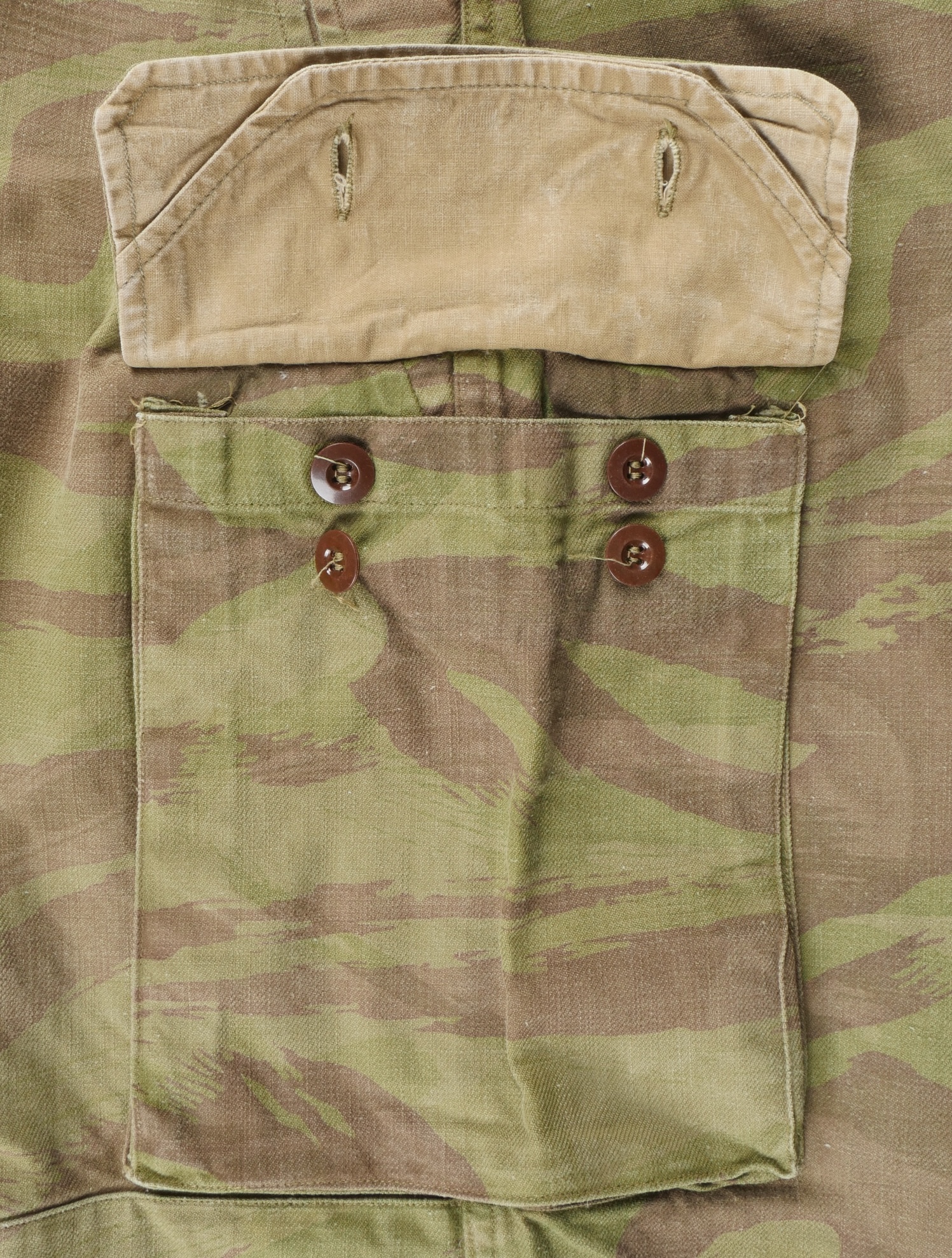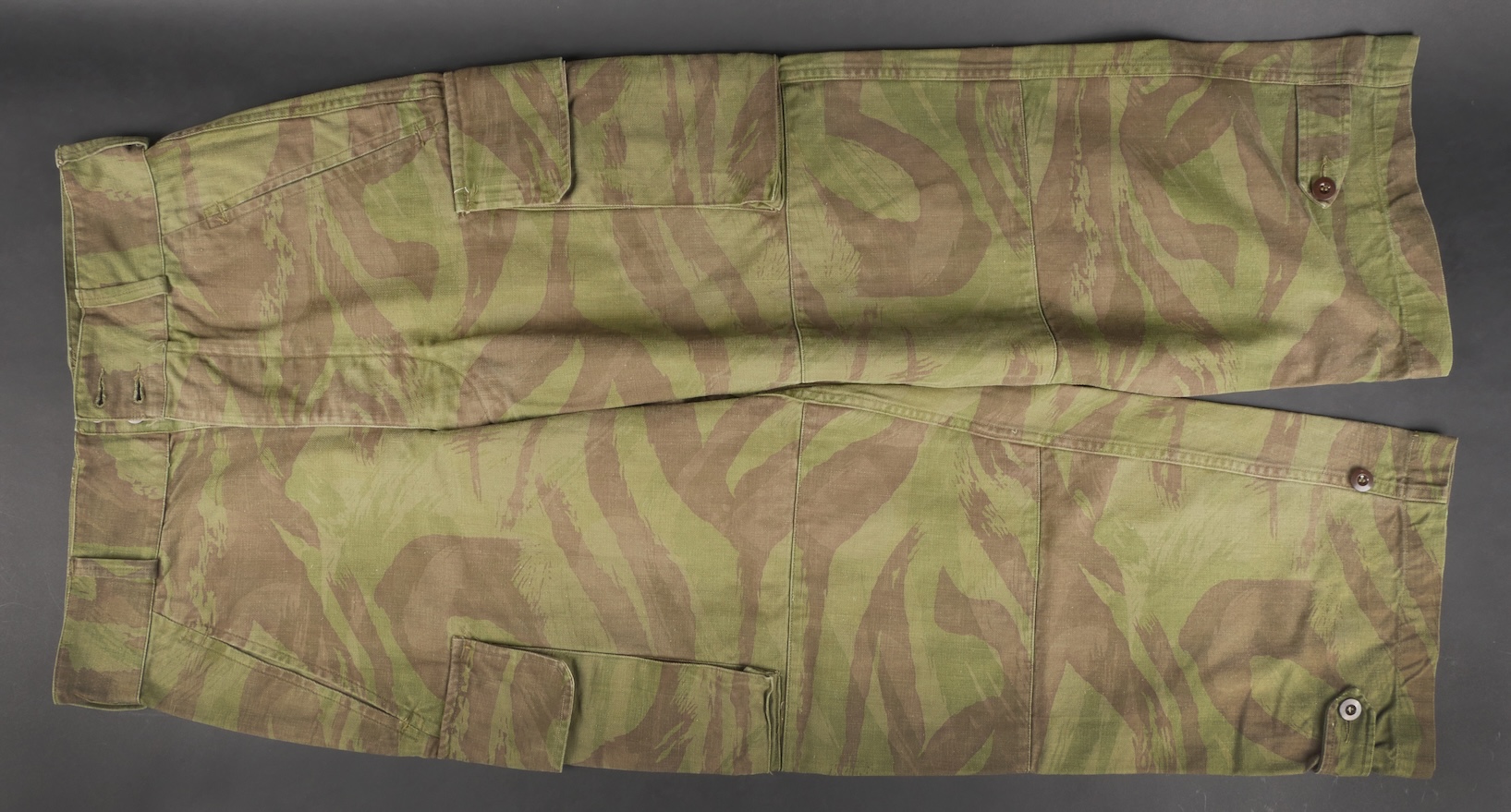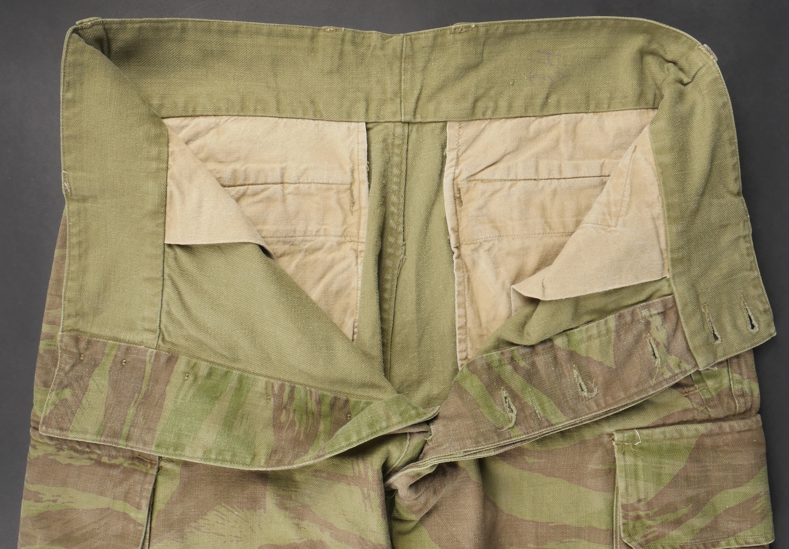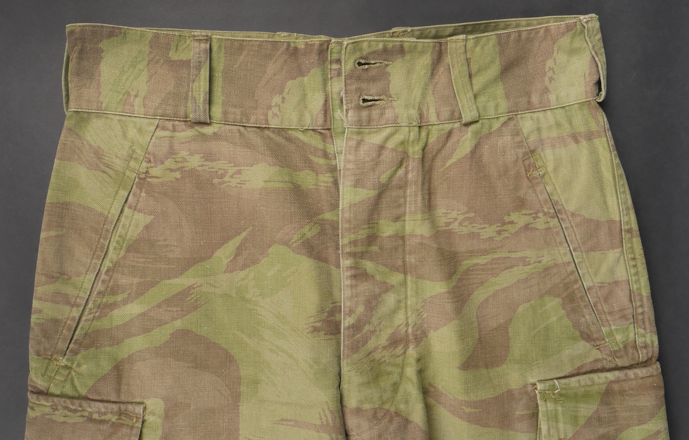 Pantalon TTA 4753. Pantalon se fermant par une série de boutons dont les deux derniers sont apparents, entièrement camouflé dans une toile type 53, doublure en coton écru, marquage fabricant... en savoir plus