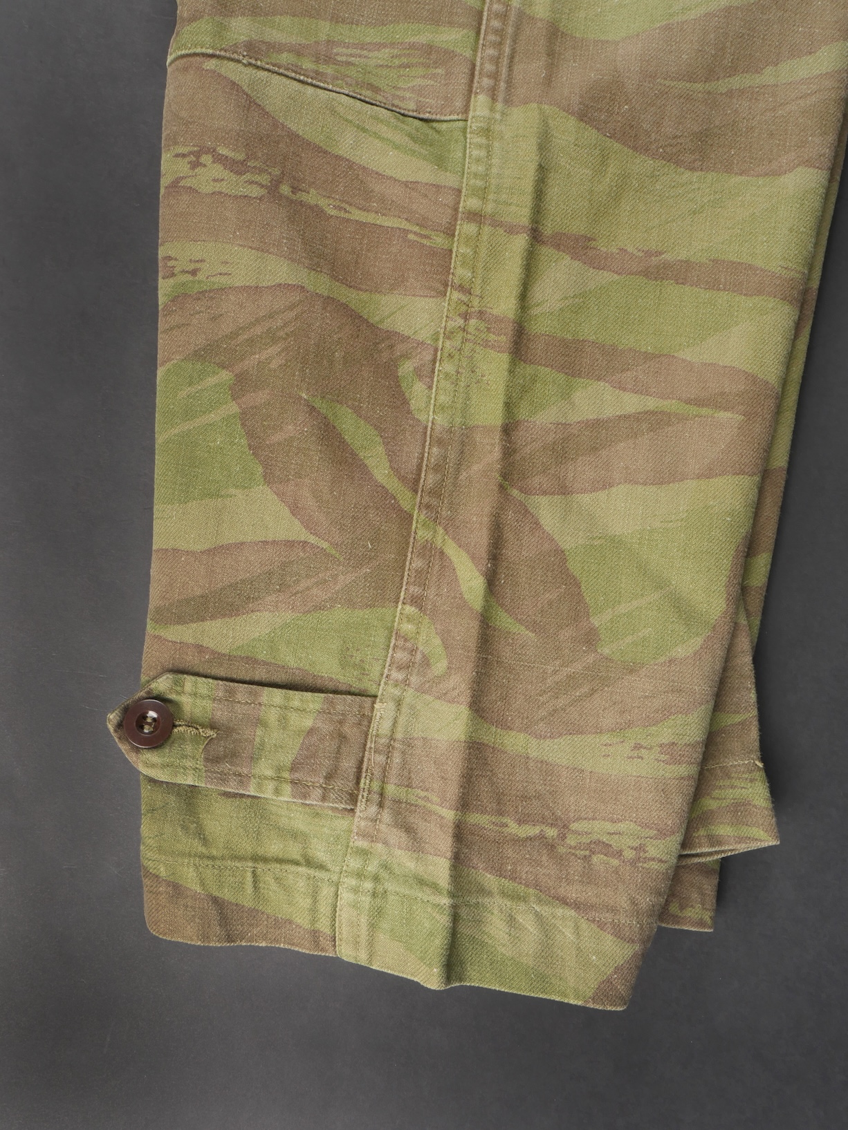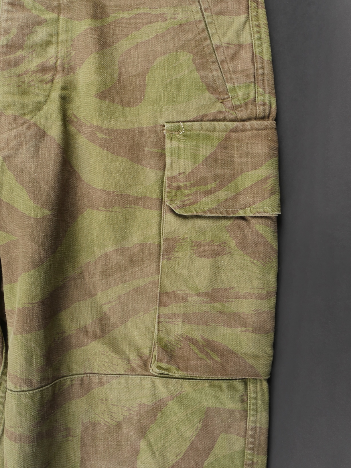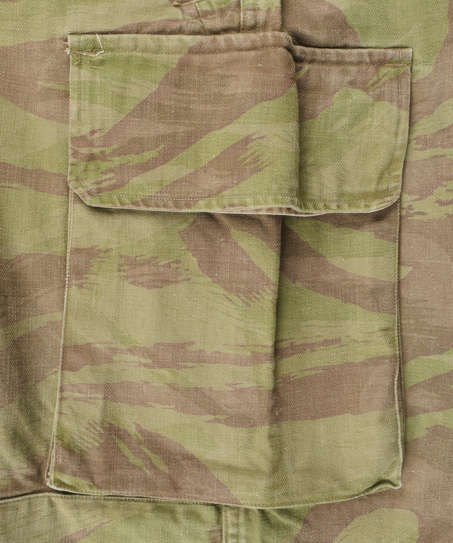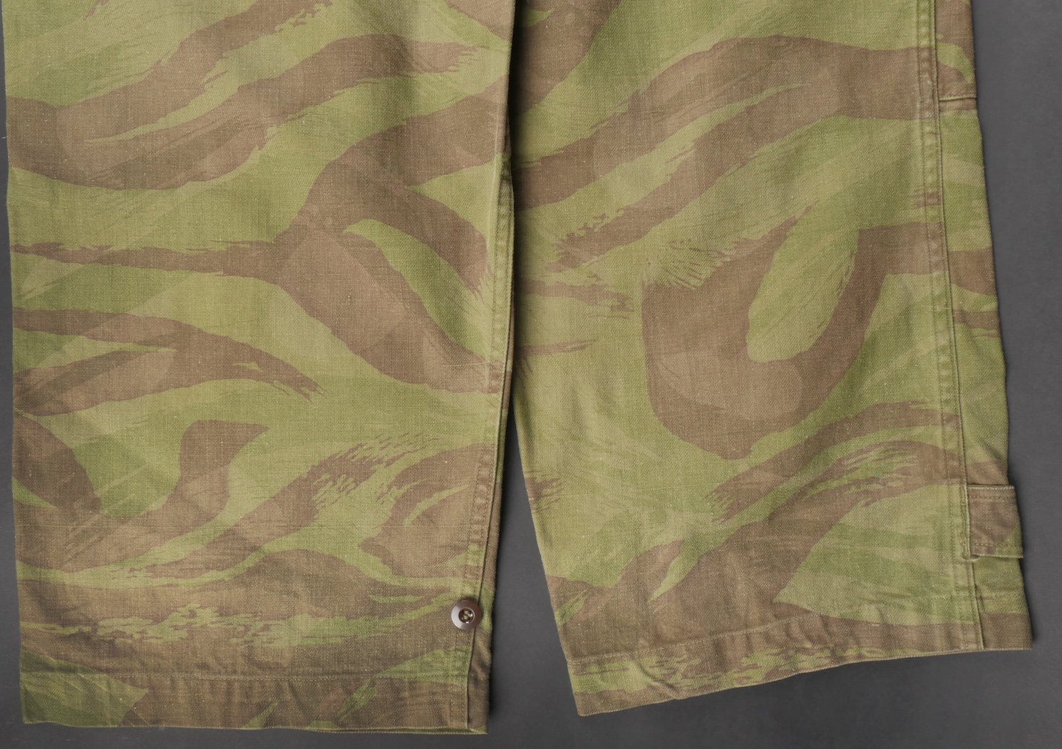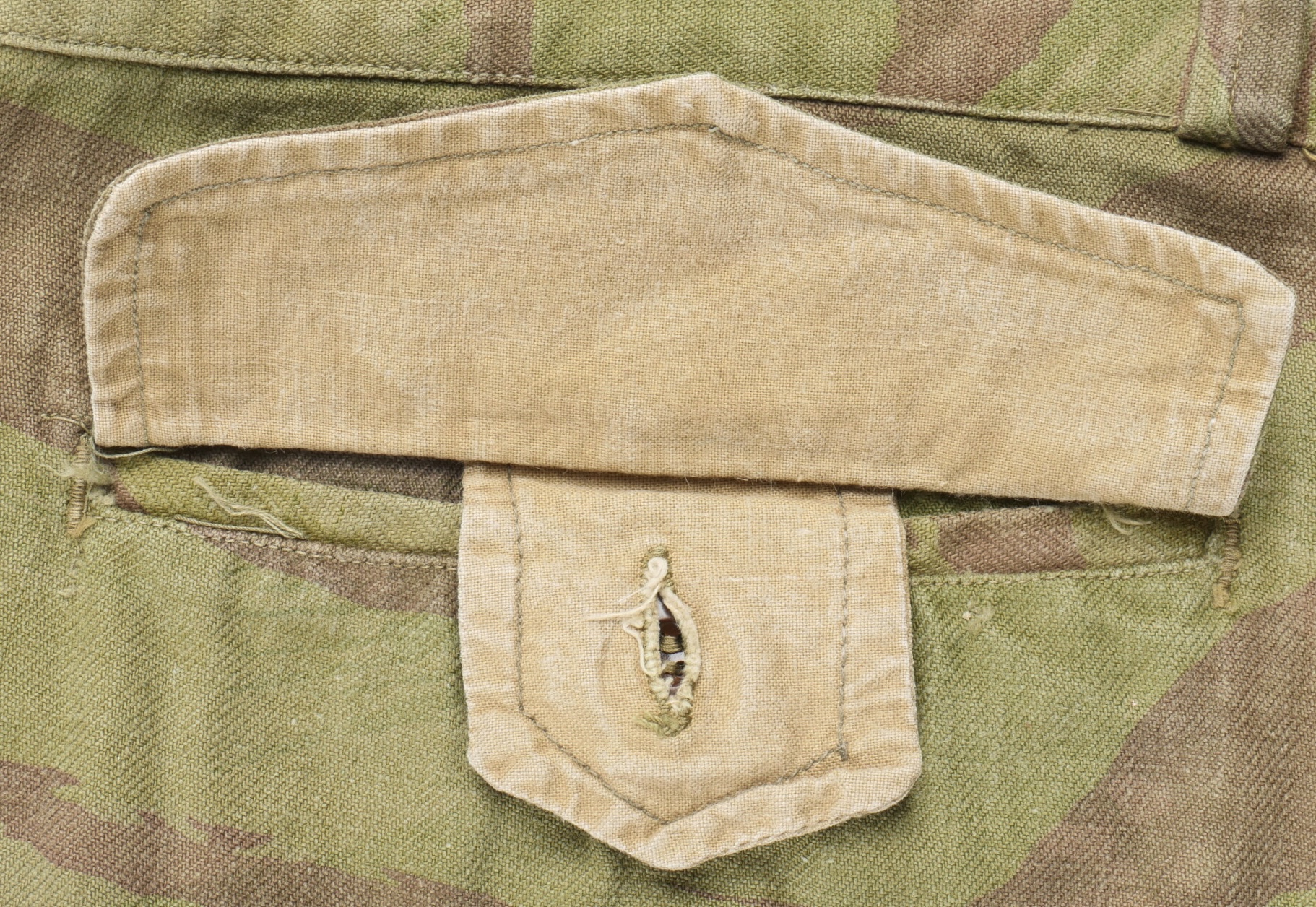 Pantalon TTA 4753. Pantalon se fermant par une série de boutons dont les deux derniers sont apparents, entièrement camouflé dans une toile type 53, doublure en coton écru, marquage fabricant... en savoir plus