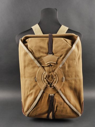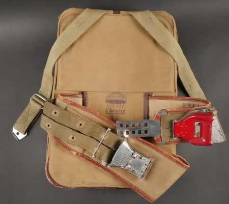 Parachute Aviorex 903. Housse en toile kaki claire, pour équipage ou pilote d’avion lent. Ceinture présente avec tampon petite taille, marquage l’Aviorex 903. Sur la face arrière... en savoir plus