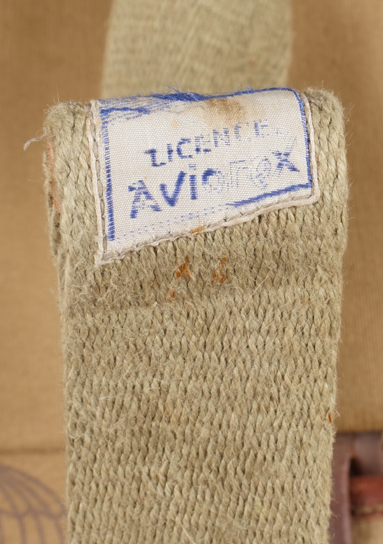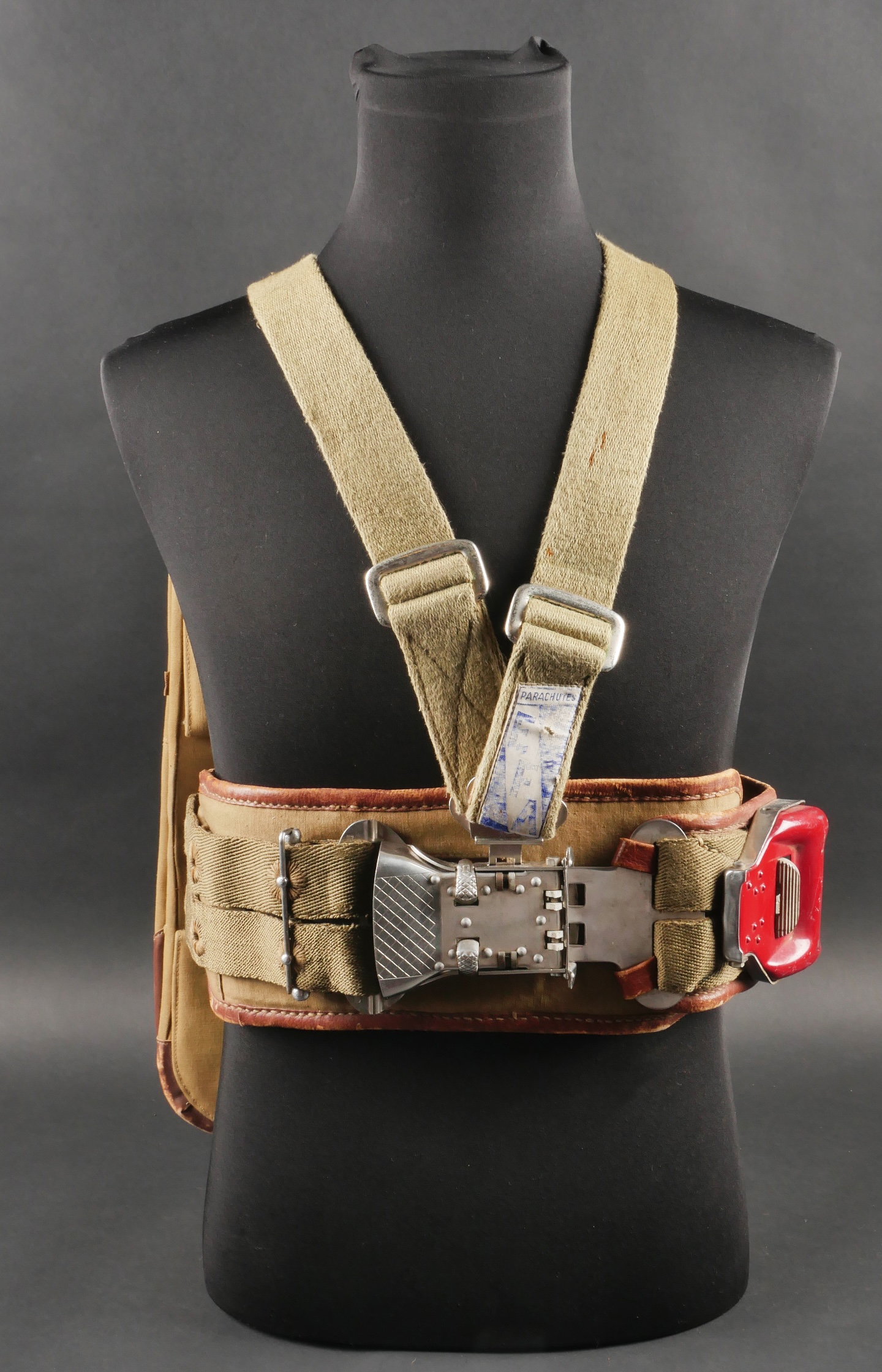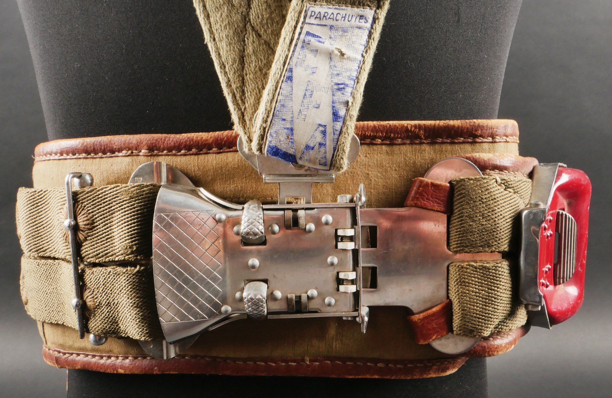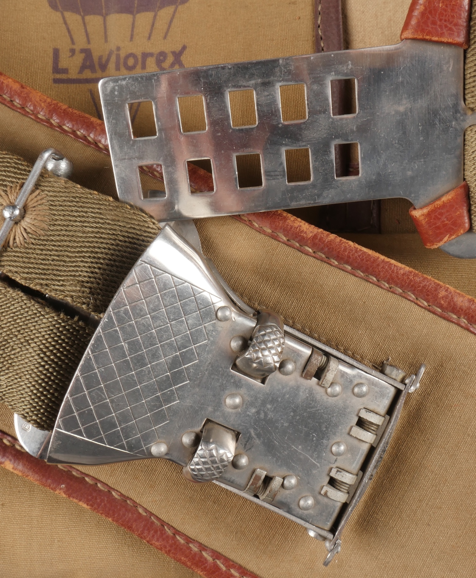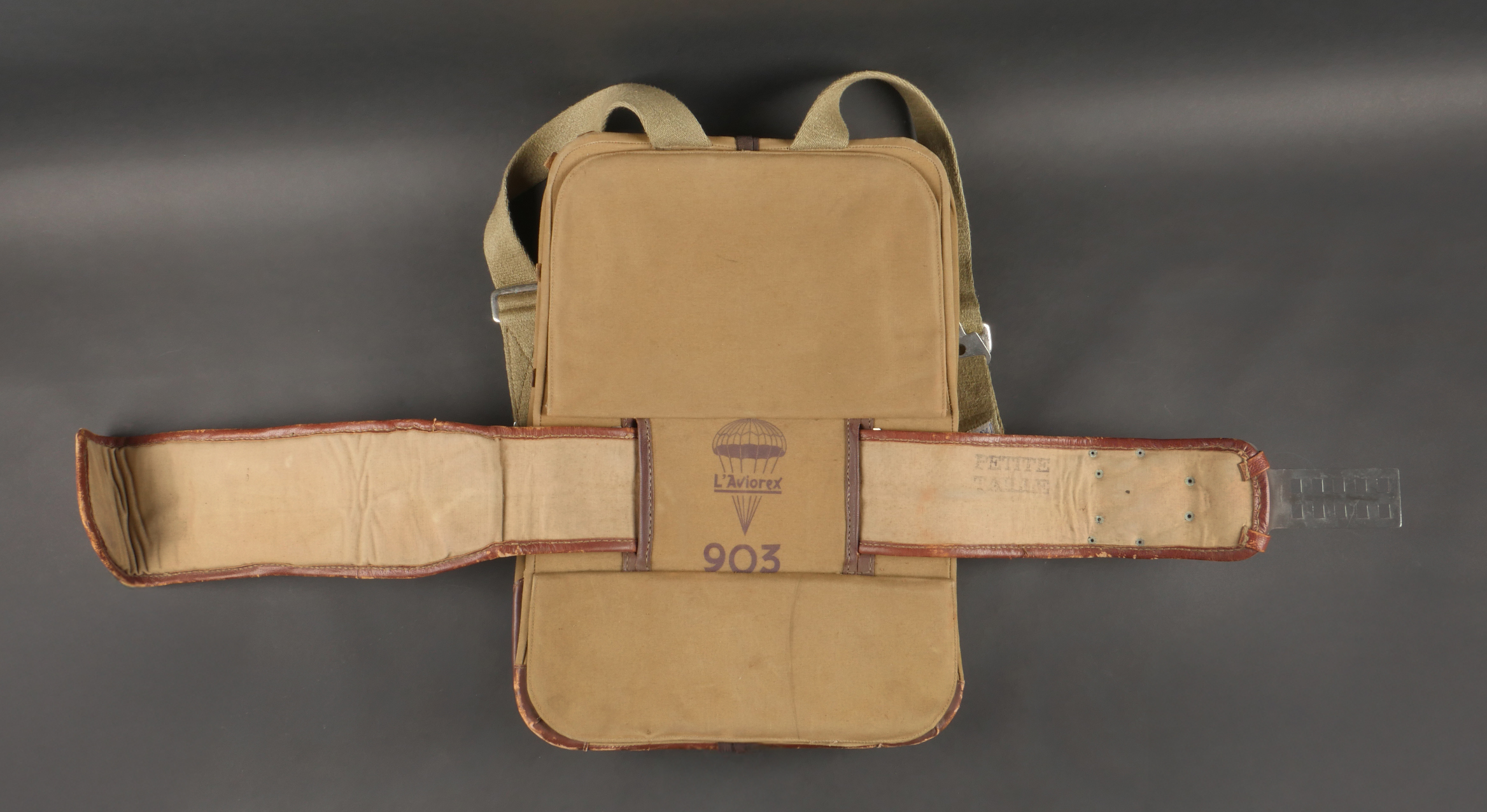 Parachute Aviorex 903. Housse en toile kaki claire, pour équipage ou pilote d’avion lent. Ceinture présente avec tampon petite taille, marquage l’Aviorex 903. Sur la face arrière... en savoir plus
