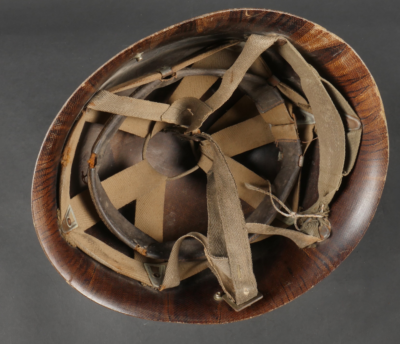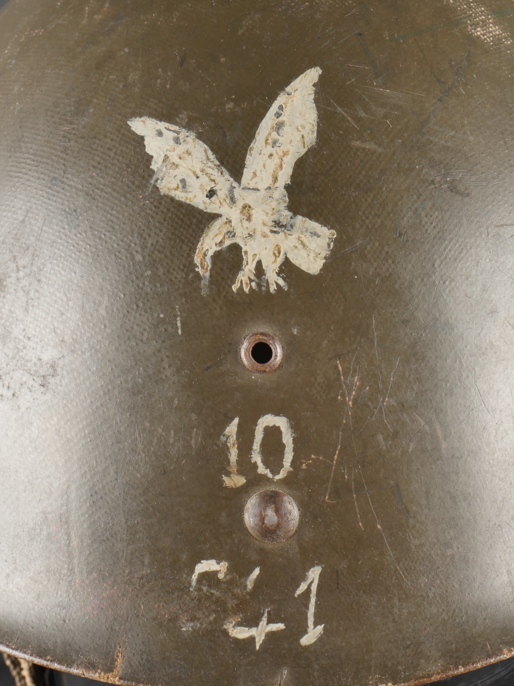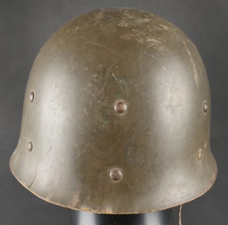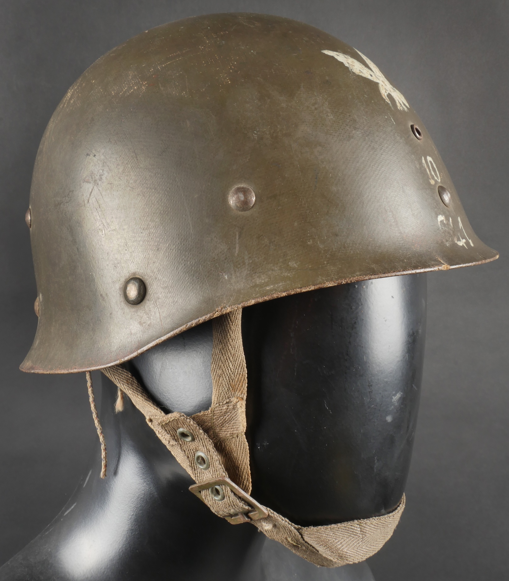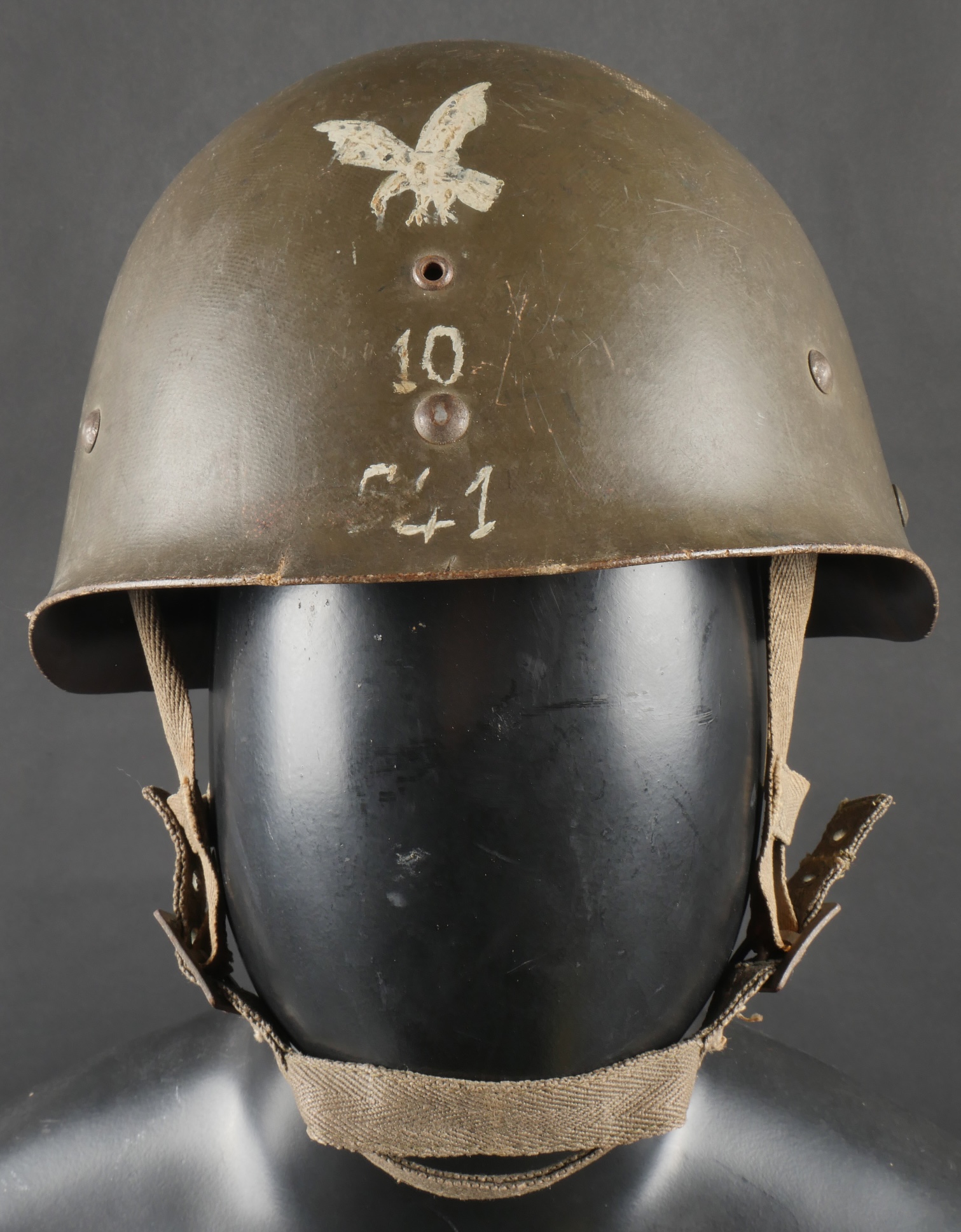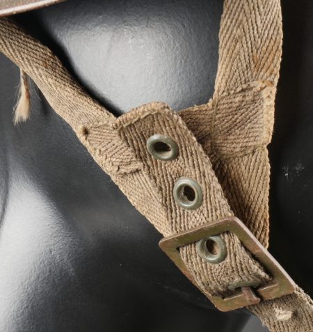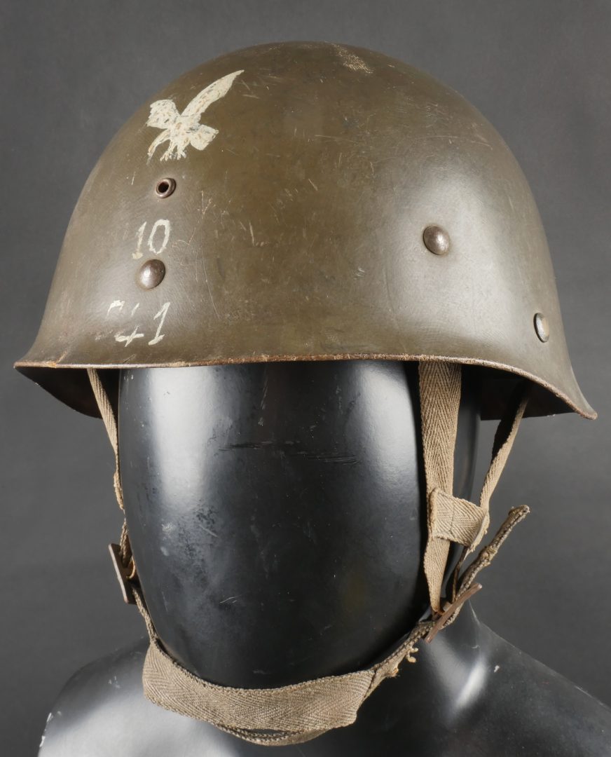 Beau sous casque modèle TAP 1951, du 2ième type portant à l’avant un aigle blanc surmontant le chiffre 10 Commando Parachutiste de l’Air 10 . Sous casque fabriqué en fibre vulcanisé celoron par la firme FD et daté 1954. Nuquière du second type, cousue possédant une petite réparation. Boucle de réglage en peinture kaki. Bandeau de cuir présent mais deux agrafes absentes. Mentonnière en toile kaki spécifique au modèle TAP. Pièce peu courante. Ce sous casque est visible dans l’ouvrage Paras Français Algérie 1954 1962, page 154. Fine TAP 1951 liner second type bearing at front a white eagle above number 10 Commando Parachutiste de l’Air 10 made of vulcanized fiber by FD dated 1954. Secondtype neckband with small period repair adjustment buckle khaki paint leather sweatband with two clips missing khaki web chinstrap specific to TAP model rare piece referenced in Paras Français Algérie 1954–1962 page 154.