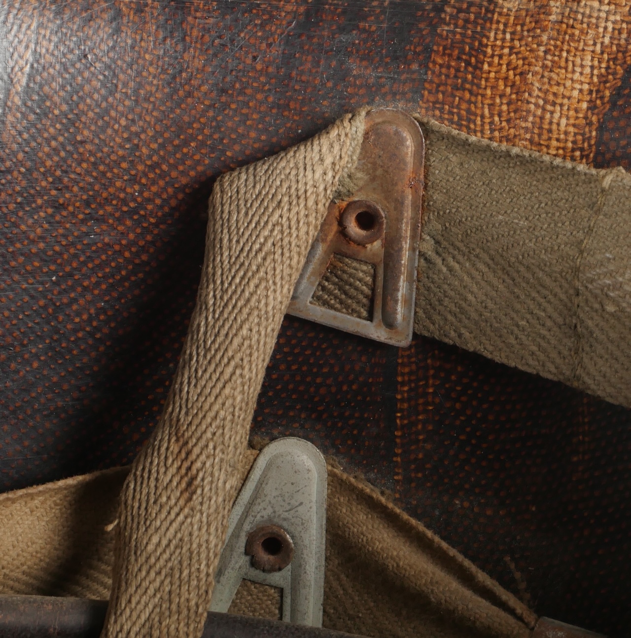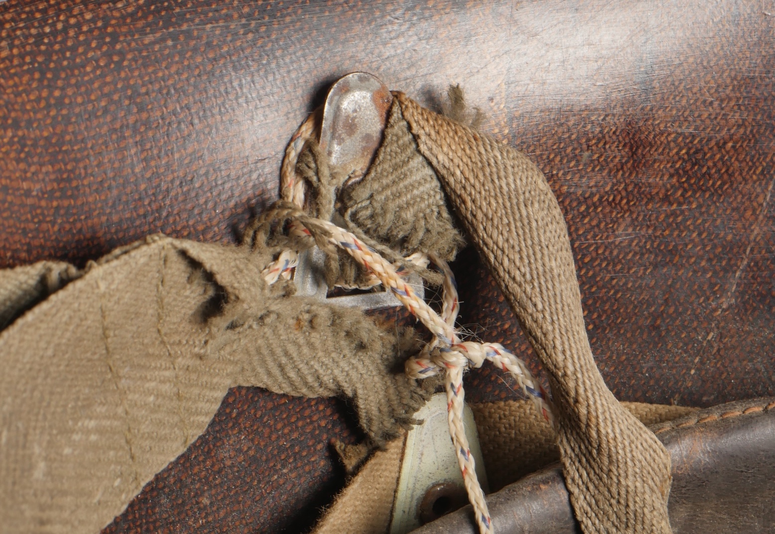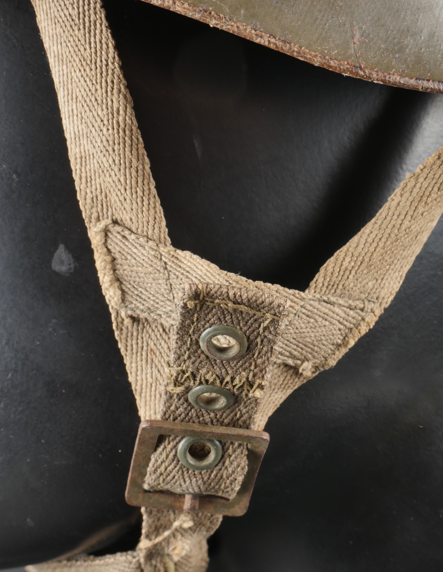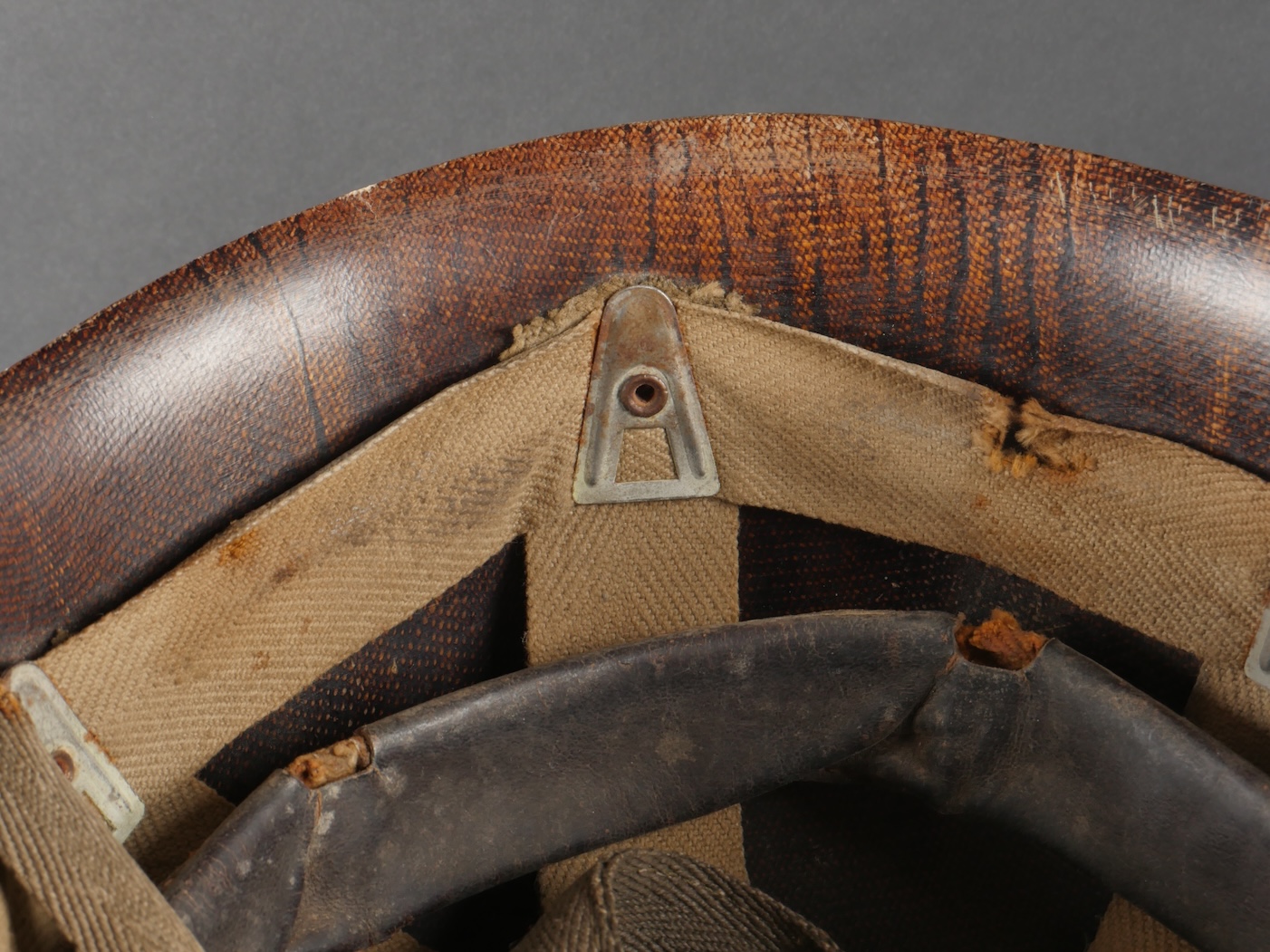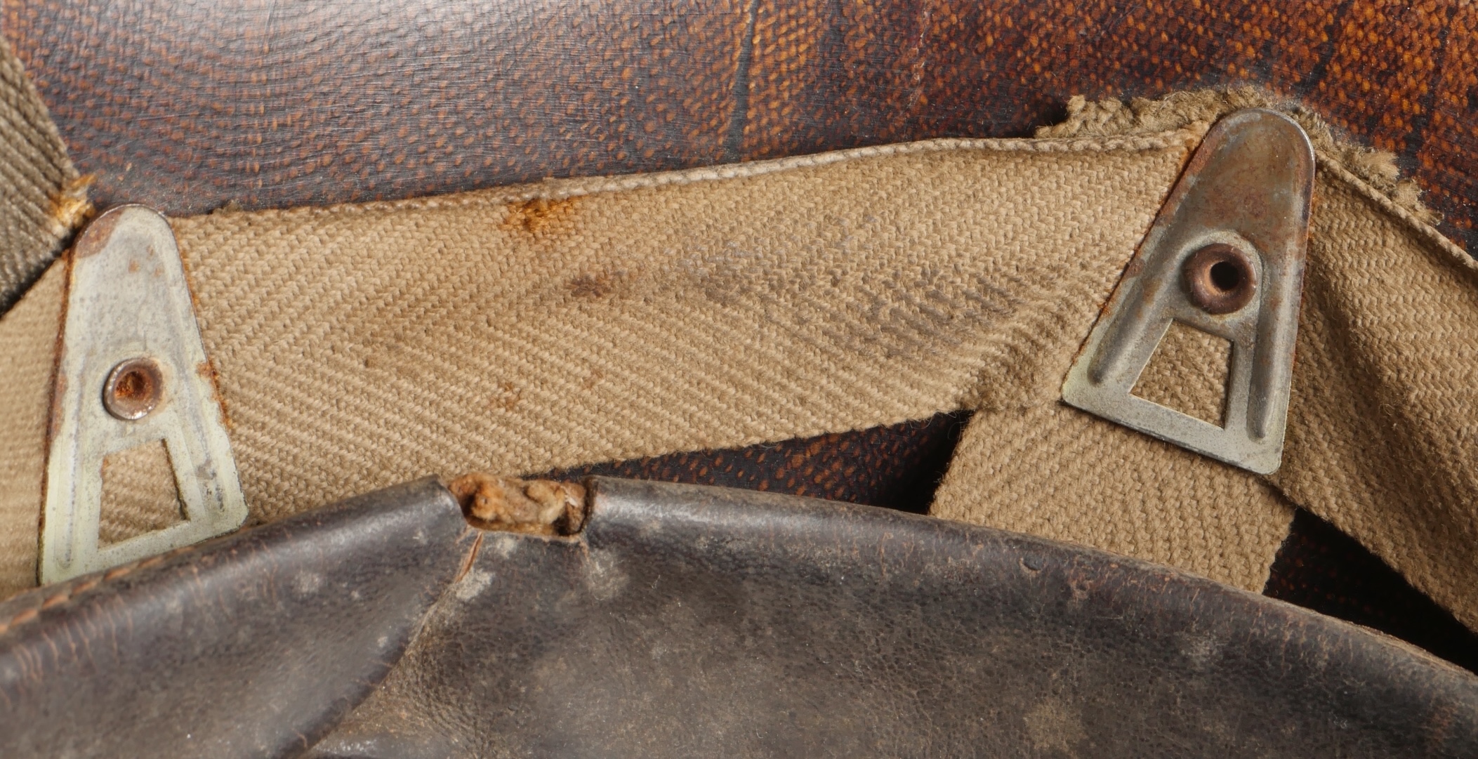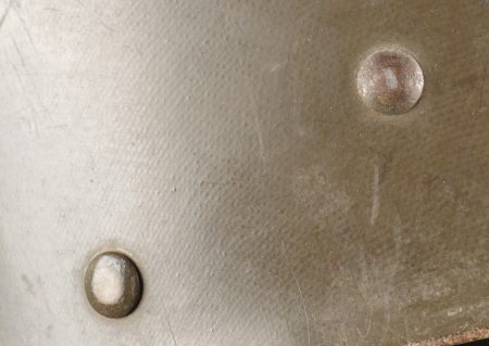 Beau sous casque modèle TAP 1951, du 2ième type portant à l’avant un aigle blanc surmontant le chiffre 10 Commando Parachutiste de l’Air 10 . Sous casque fabriqué en fibre vulcanisé celoron par la firme FD et daté 1954. Nuquière du second type, cousue possédant une petite réparation. Boucle de réglage en peinture kaki. Bandeau de cuir présent mais deux agrafes absentes. Mentonnière en toile kaki spécifique au modèle TAP. Pièce peu courante. Ce sous casque est visible dans l’ouvrage Paras Français Algérie 1954 1962, page 154. Fine TAP 1951 liner second type bearing at front a white eagle above number 10 Commando Parachutiste de l’Air 10 made of vulcanized fiber by FD dated 1954. Secondtype neckband with small period repair adjustment buckle khaki paint leather sweatband with two clips missing khaki web chinstrap specific to TAP model rare piece referenced in Paras Français Algérie 1954–1962 page 154.