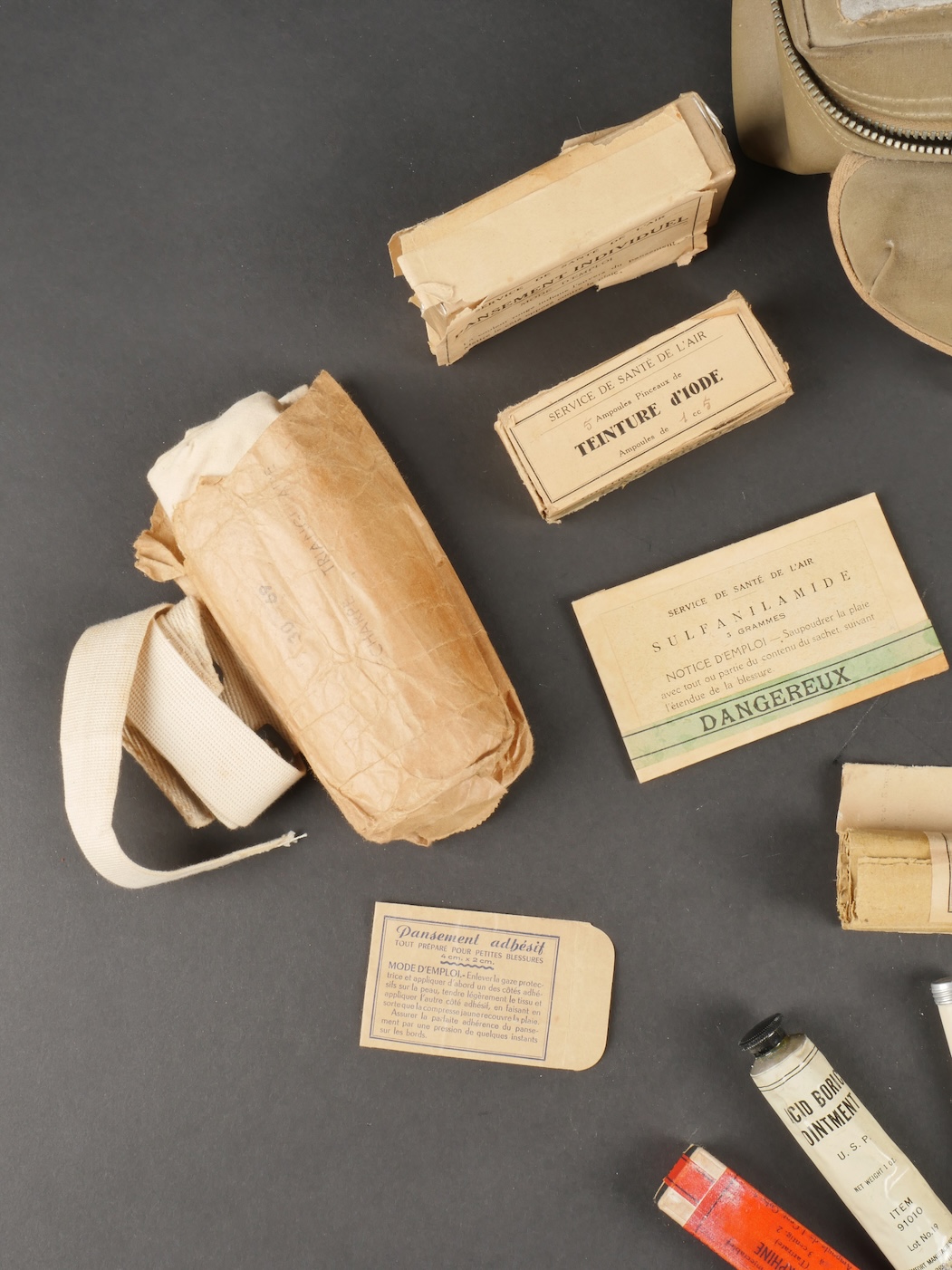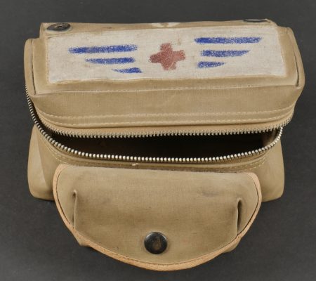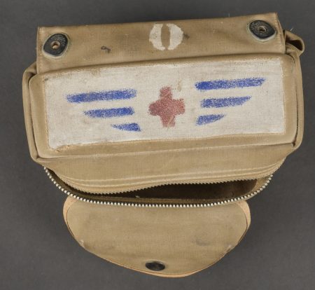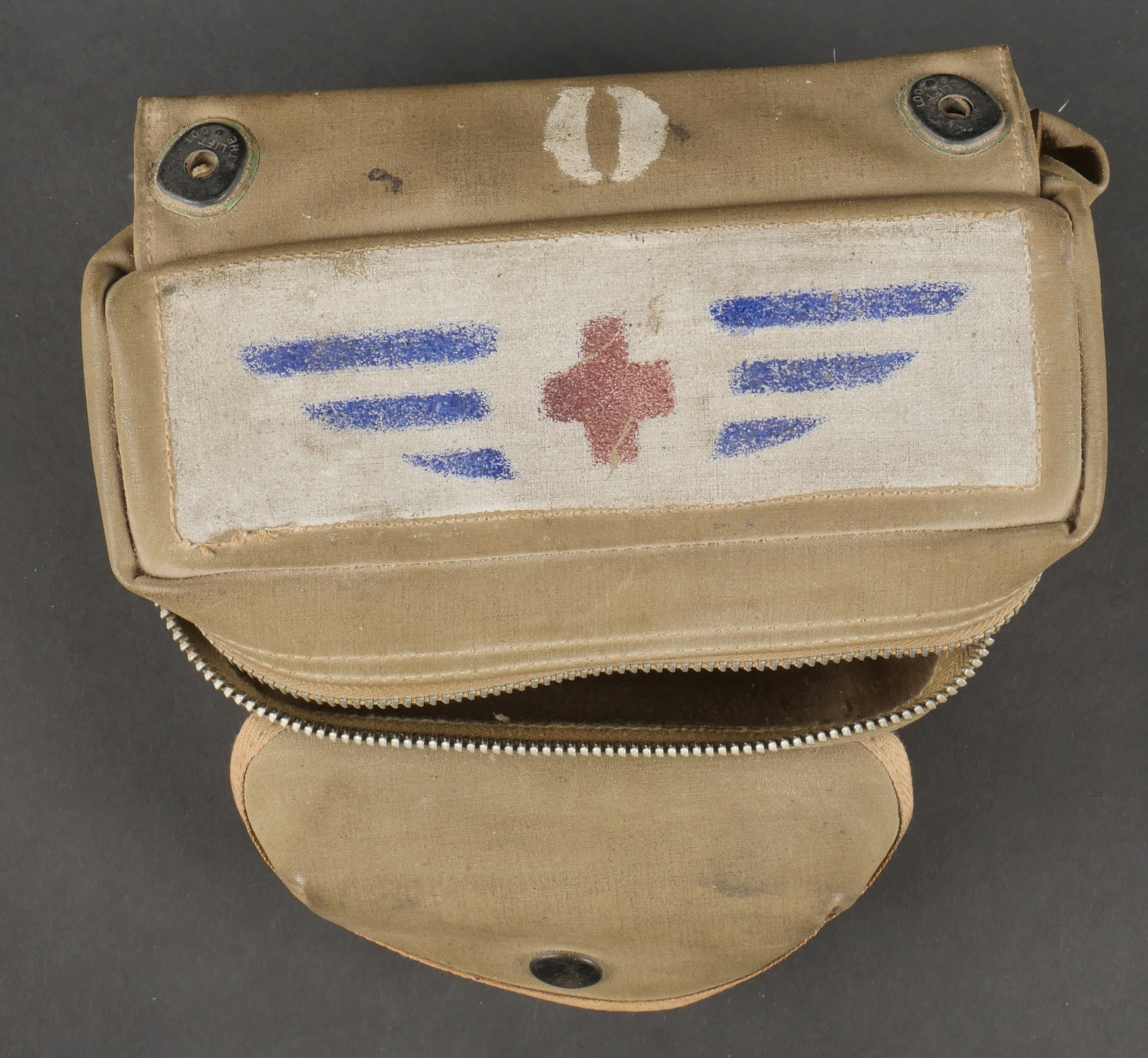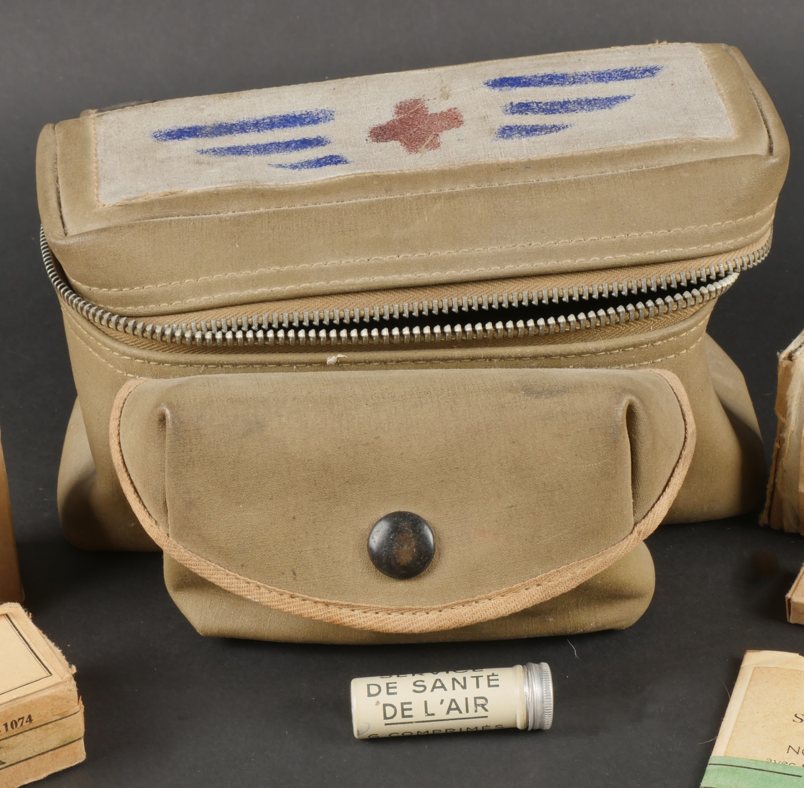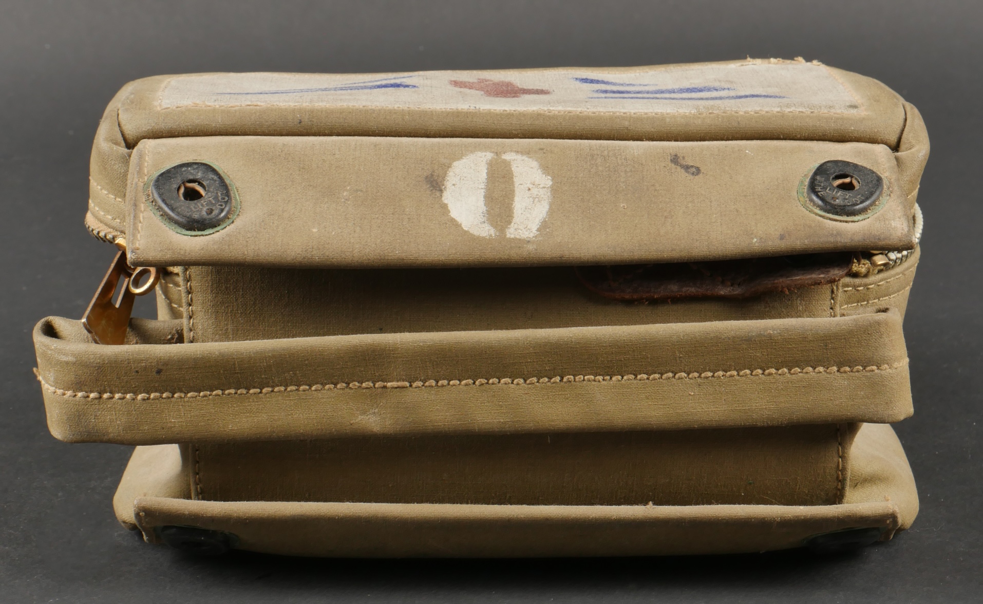 Trousse USAAF réutilisée. Trousse réglementaire USAAF en toile de coton kaki fabrication Travins Leather, fermeture éclaire de marque Talon. Le service sanctuaire de l’armée de l’air a peint un insigne sur le dessus de la trousse. Avec trois sachets de sulfanilamides, divers comprimés, un garrot, divers pansements, une écharpe triangulaire, iode. On y joint une seringue dans sa boîte. Reused USAAF kit. Regulation USAAF canvas kit bag by Travins Leather with Talon zipper. The Air Force Sanctuary Service painted an insignia on the lid. Contents include three packets of sulfanilamide various tablets a tourniquet various dressings a triangular bandage iodine and a syringe in its box.