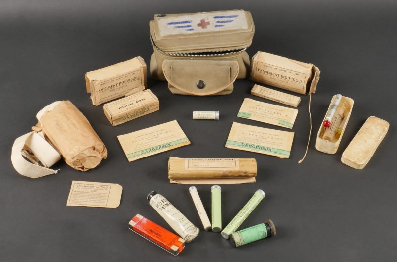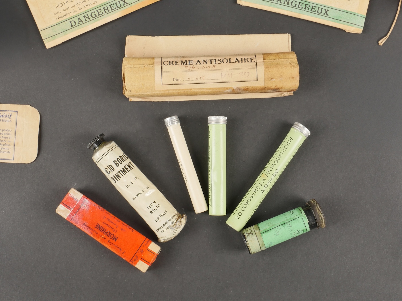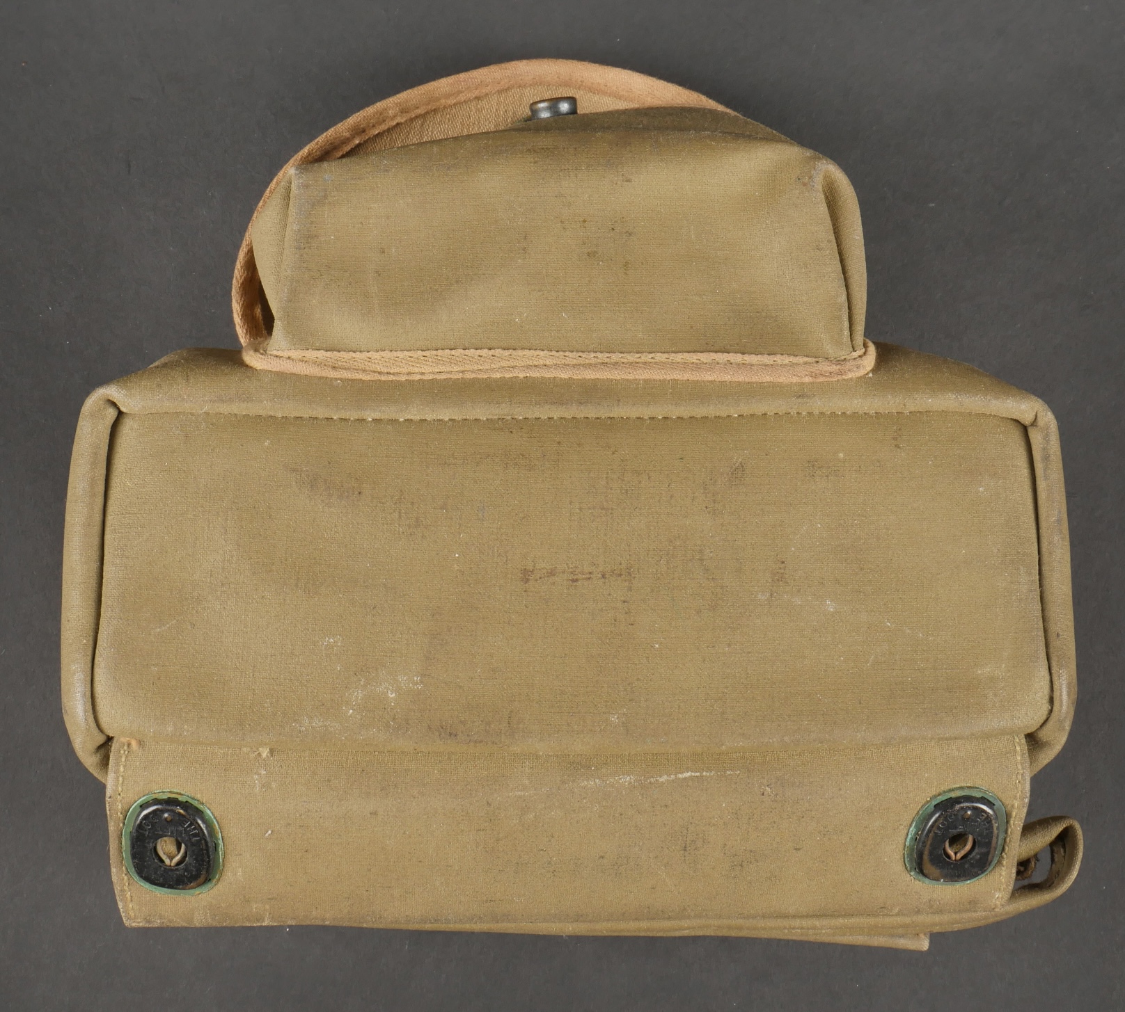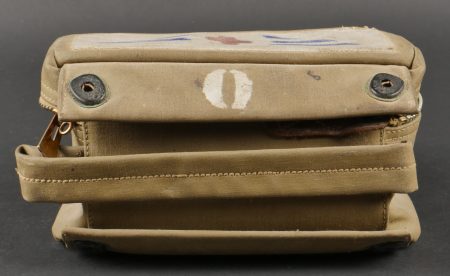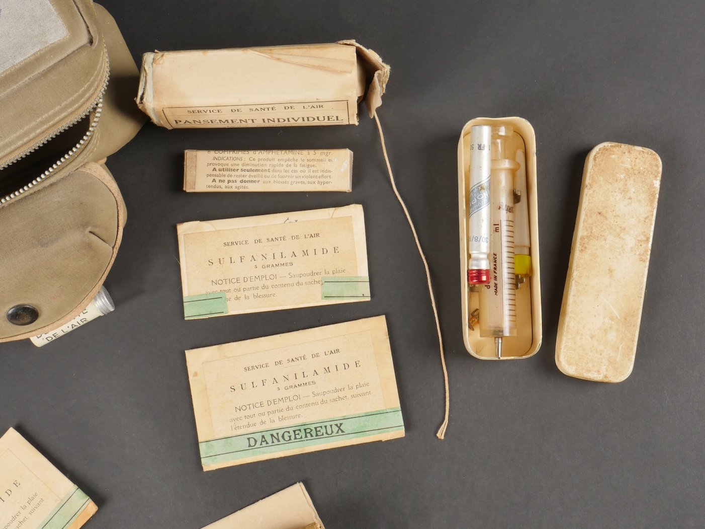 Trousse USAAF réutilisée. Trousse réglementaire USAAF en toile de coton kaki fabrication Travins Leather, fermeture éclaire de marque Talon. Le service sanctuaire de l’armée de l’air a peint un insigne sur le dessus de la trousse. Avec trois sachets de sulfanilamides, divers comprimés, un garrot, divers pansements, une écharpe triangulaire, iode. On y joint une seringue dans sa boîte. Reused USAAF kit. Regulation USAAF canvas kit bag by Travins Leather with Talon zipper. The Air Force Sanctuary Service painted an insignia on the lid. Contents include three packets of sulfanilamide various tablets a tourniquet various dressings a triangular bandage iodine and a syringe in its box.