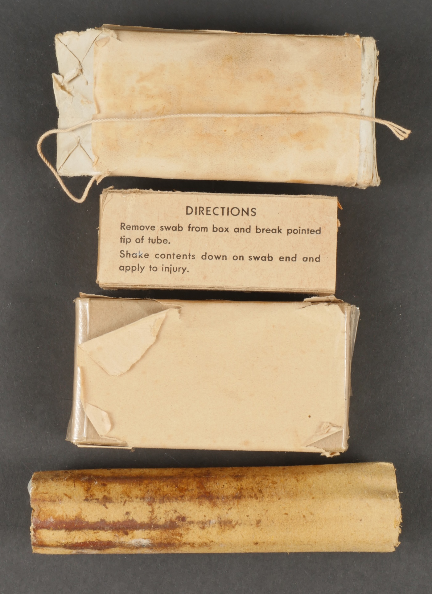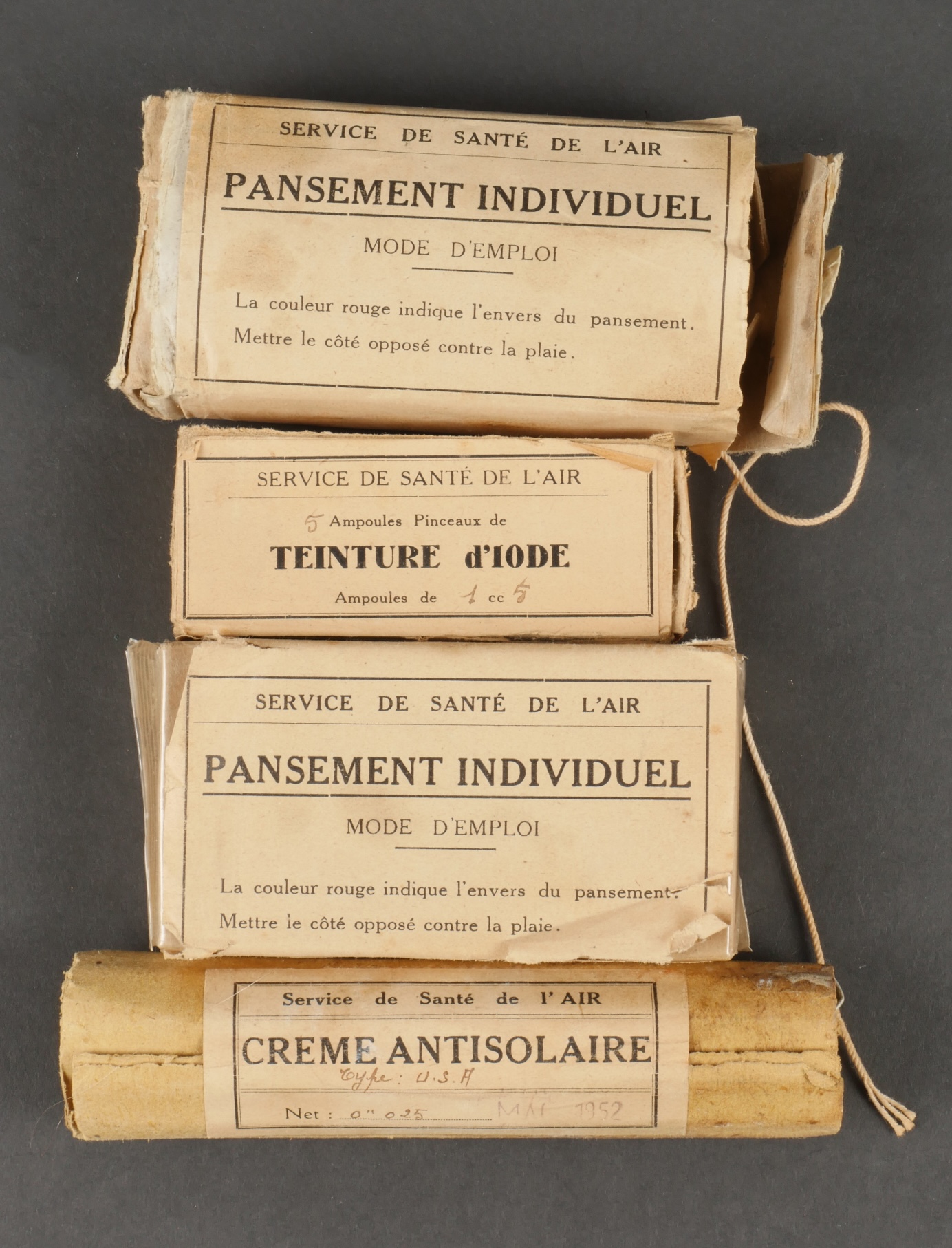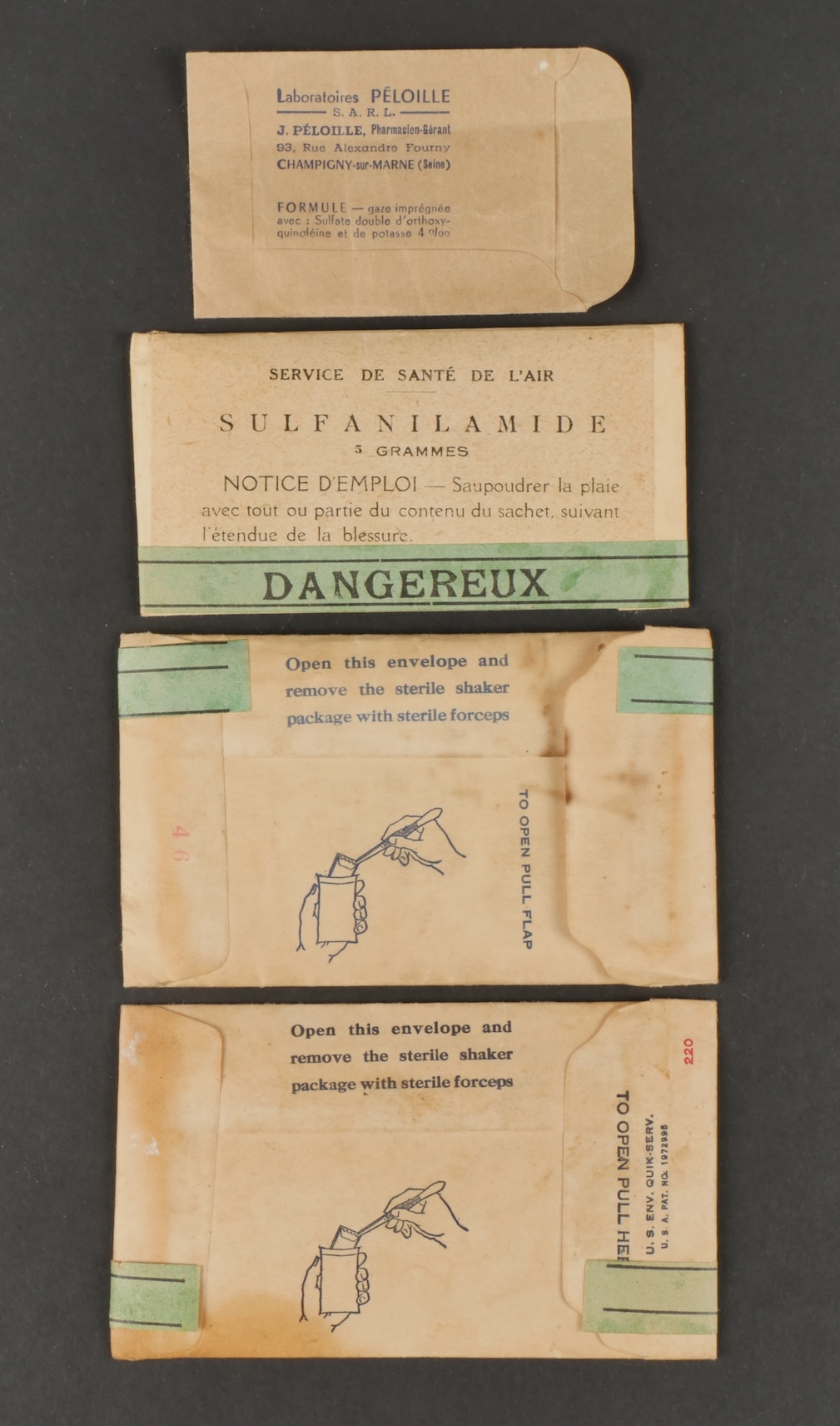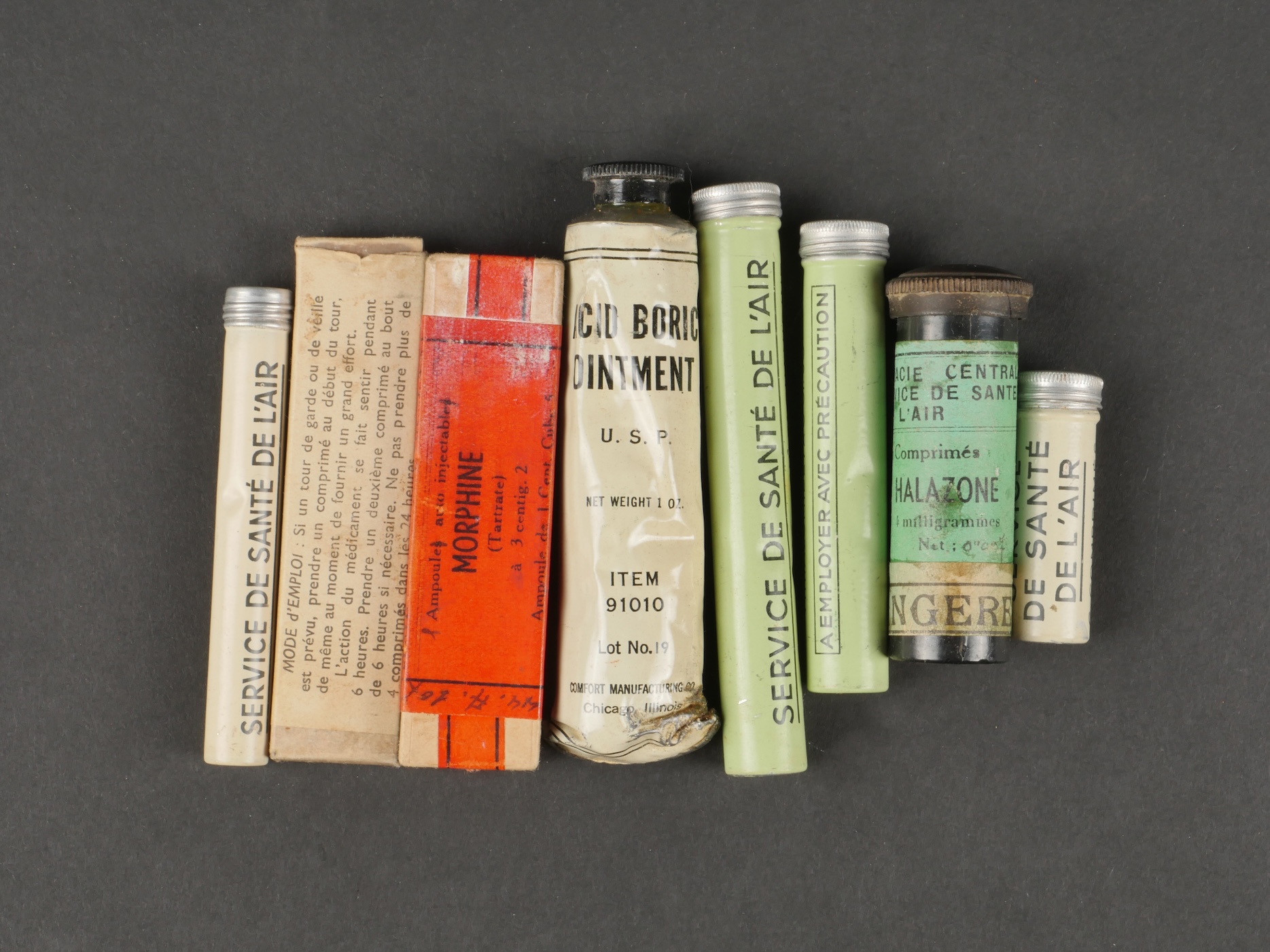 Trousse USAAF réutilisée. Trousse réglementaire USAAF en toile de coton kaki fabrication Travins Leather, fermeture éclaire de marque Talon. Le service sanctuaire de l’armée de l’air a peint un insigne sur le dessus de la trousse. Avec trois sachets de sulfanilamides, divers comprimés, un garrot, divers pansements, une écharpe triangulaire, iode. On y joint une seringue dans sa boîte. Reused USAAF kit. Regulation USAAF canvas kit bag by Travins Leather with Talon zipper. The Air Force Sanctuary Service painted an insignia on the lid. Contents include three packets of sulfanilamide various tablets a tourniquet various dressings a triangular bandage iodine and a syringe in its box.
