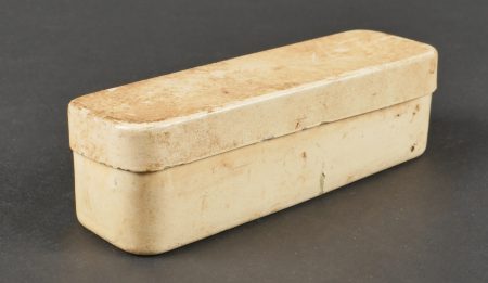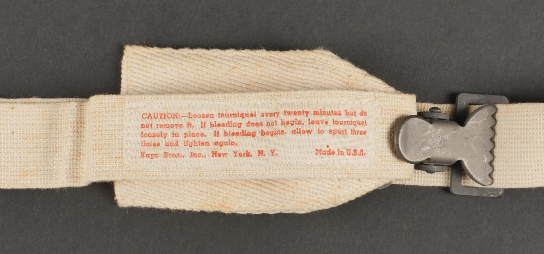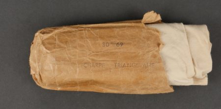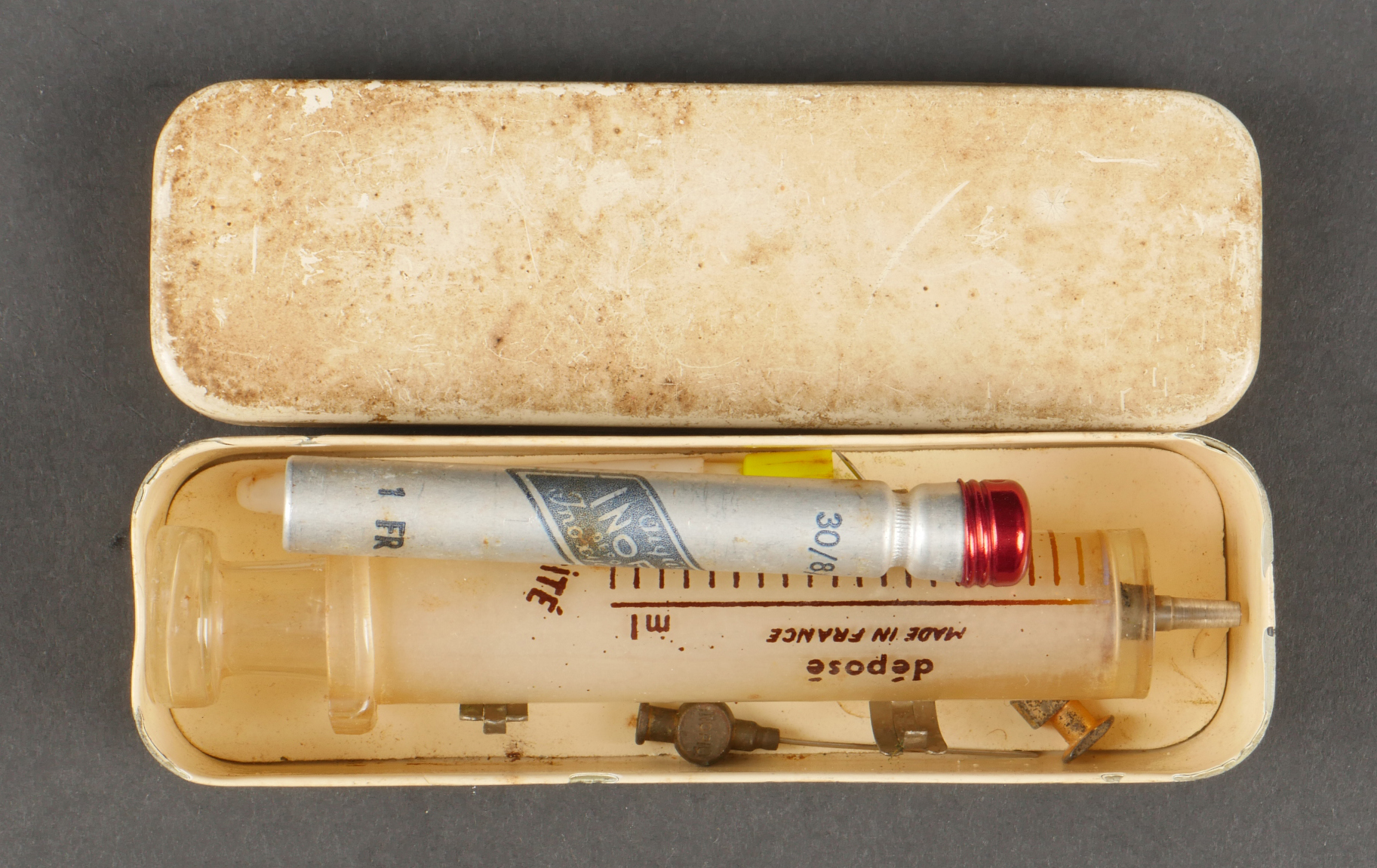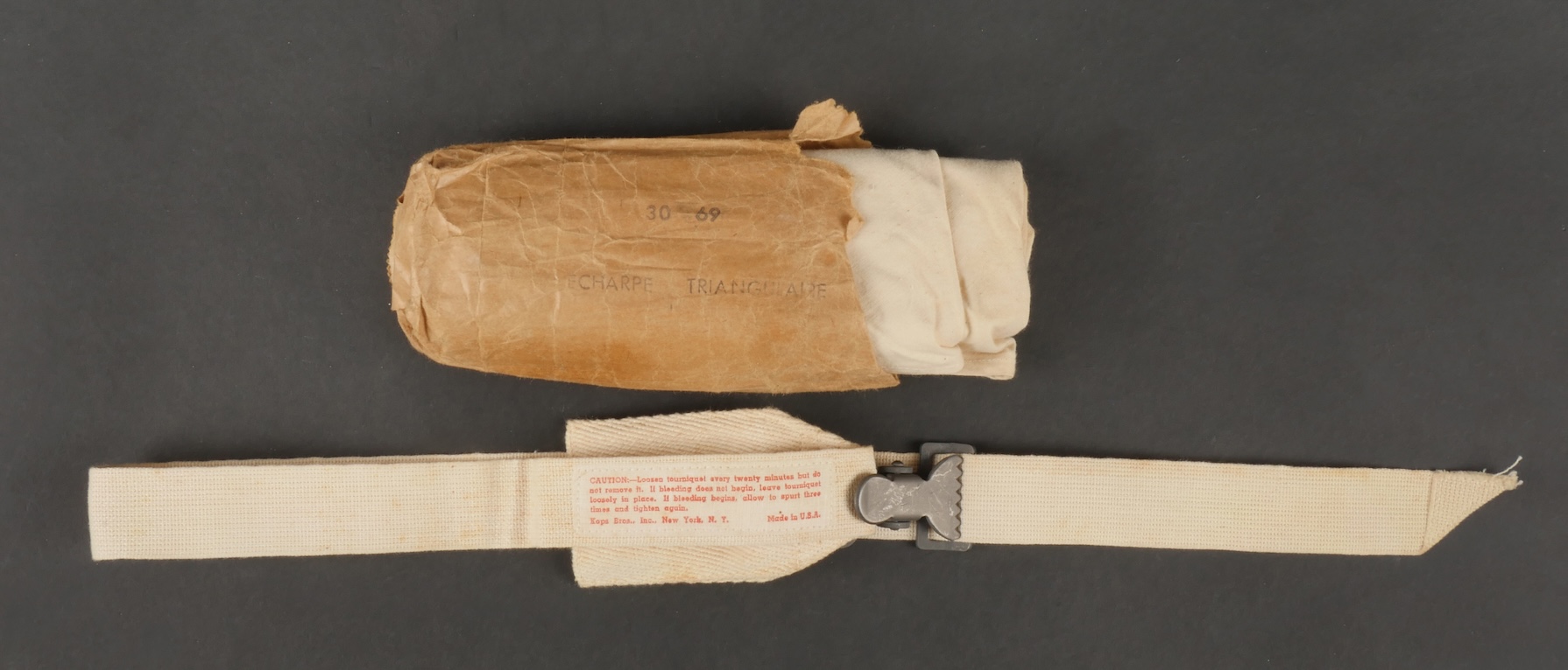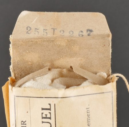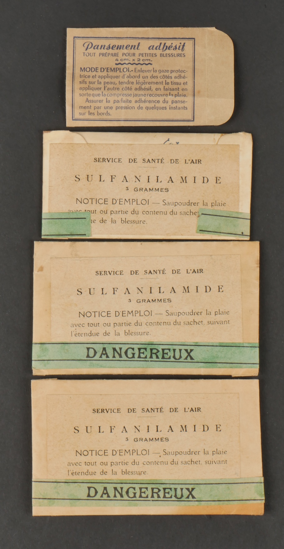 Trousse USAAF réutilisée. Trousse réglementaire USAAF en toile de coton kaki fabrication Travins Leather, fermeture éclaire de marque Talon. Le service sanctuaire de l’armée de l’air a peint un insigne sur le dessus de la trousse. Avec trois sachets de sulfanilamides, divers comprimés, un garrot, divers pansements, une écharpe triangulaire, iode. On y joint une seringue dans sa boîte. Reused USAAF kit. Regulation USAAF canvas kit bag by Travins Leather with Talon zipper. The Air Force Sanctuary Service painted an insignia on the lid. Contents include three packets of sulfanilamide various tablets a tourniquet various dressings a triangular bandage iodine and a syringe in its box.