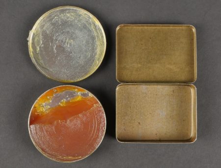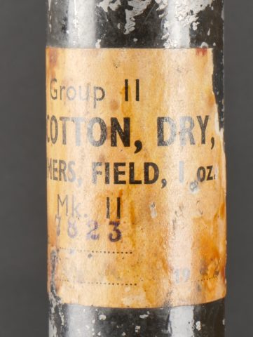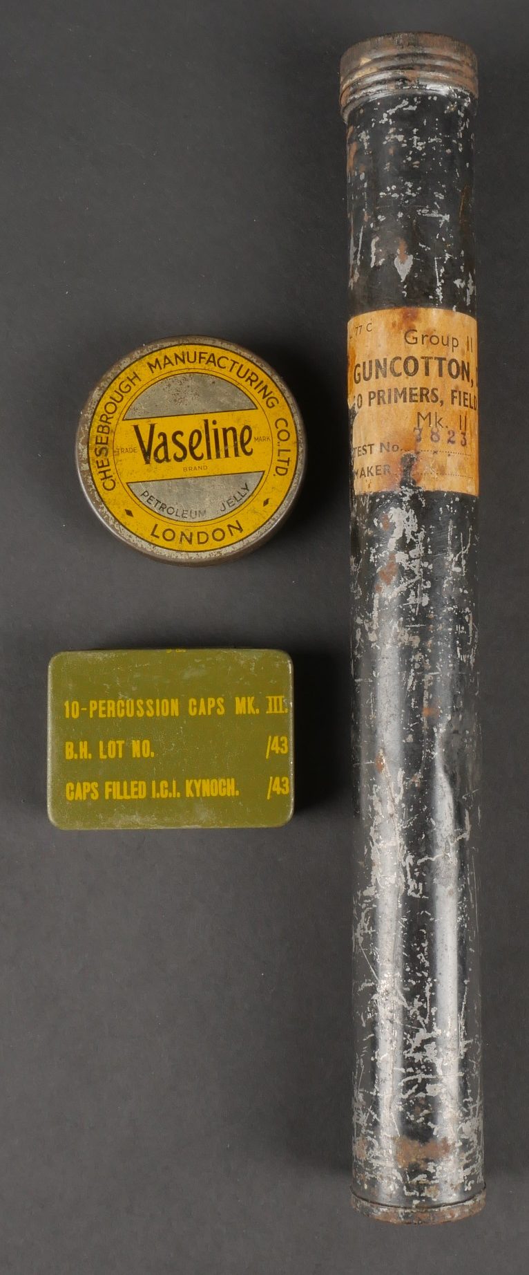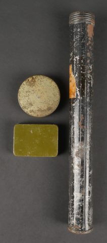 Tube pour charge primaire. Tube V1 en métal et en peinture noir d’origine, bien marqué sur le fond et possédant l’étiquette papier où l’on peut lire Group 2 Guncotton Dry 10 Primers Field I oz, datée 1942.Une boîte en métal pour 10 capuchons de percussion MK3. On y joint une boîte à vaseline également parachutée à la résistance. Tube for primary charge. Metal V1 tube in original black paint clearly marked on the base with paper label reading Group 2 Guncotton Dry 10 Primers Field 1 oz dated 1942. A metal box for 10 percussion caps MK3. Includes a small vaseline tin also parachuted to the Resistance.