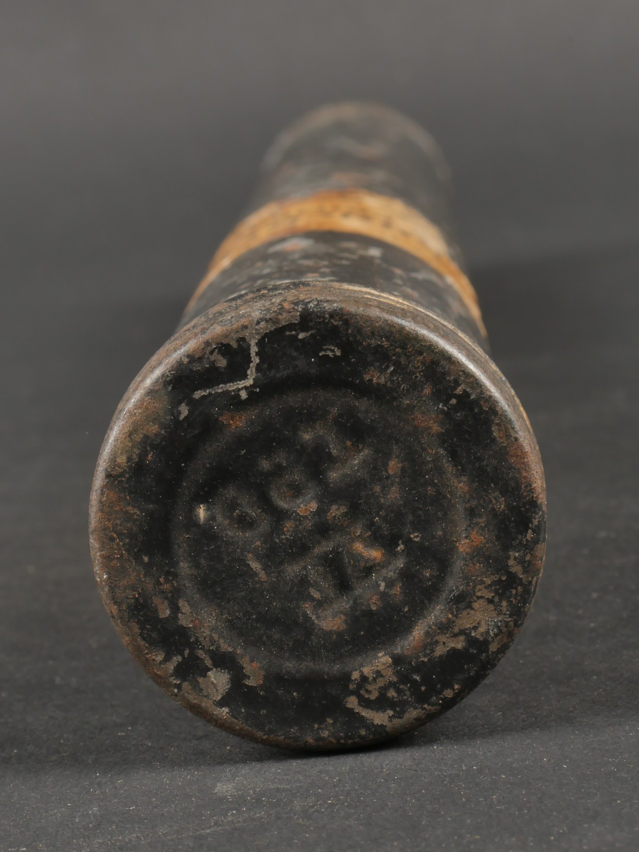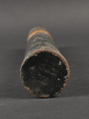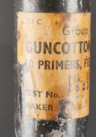 Tube pour charge primaire. Tube V1 en métal et en peinture noir d’origine, bien marqué sur le fond et possédant l’étiquette papier où l’on peut lire Group 2 Guncotton Dry ... en savoir plus