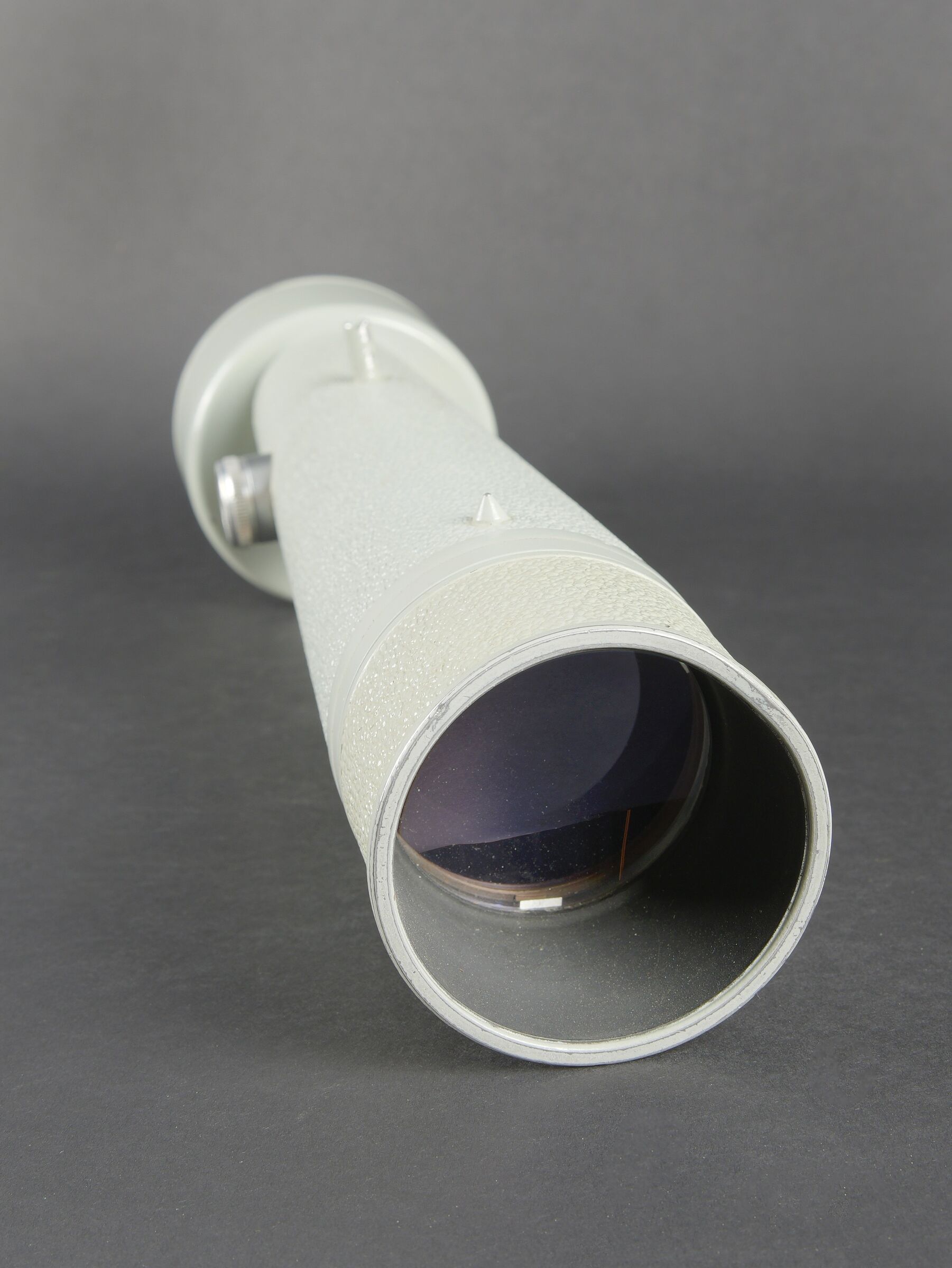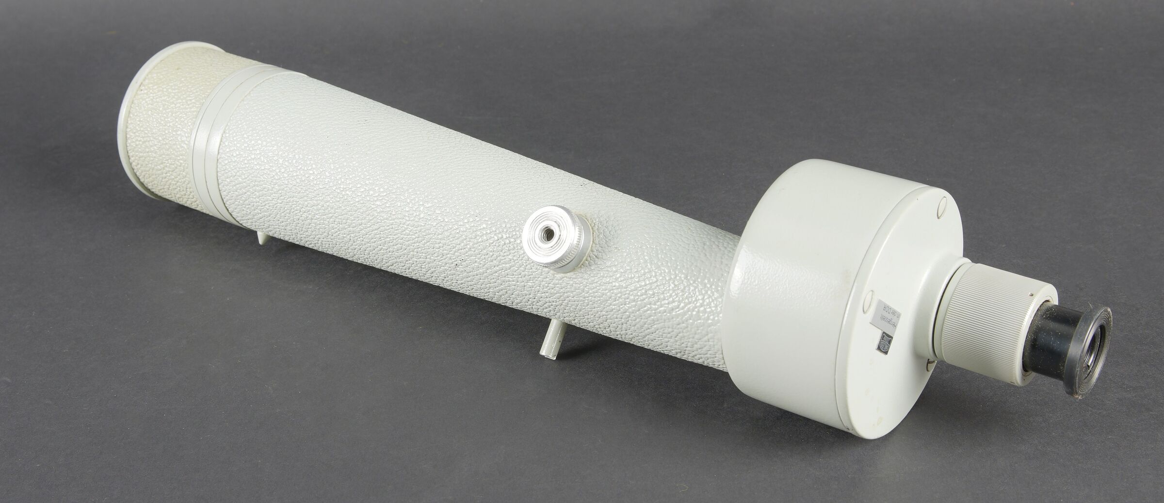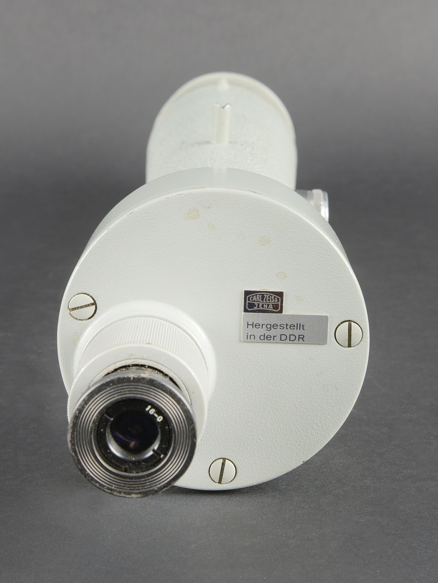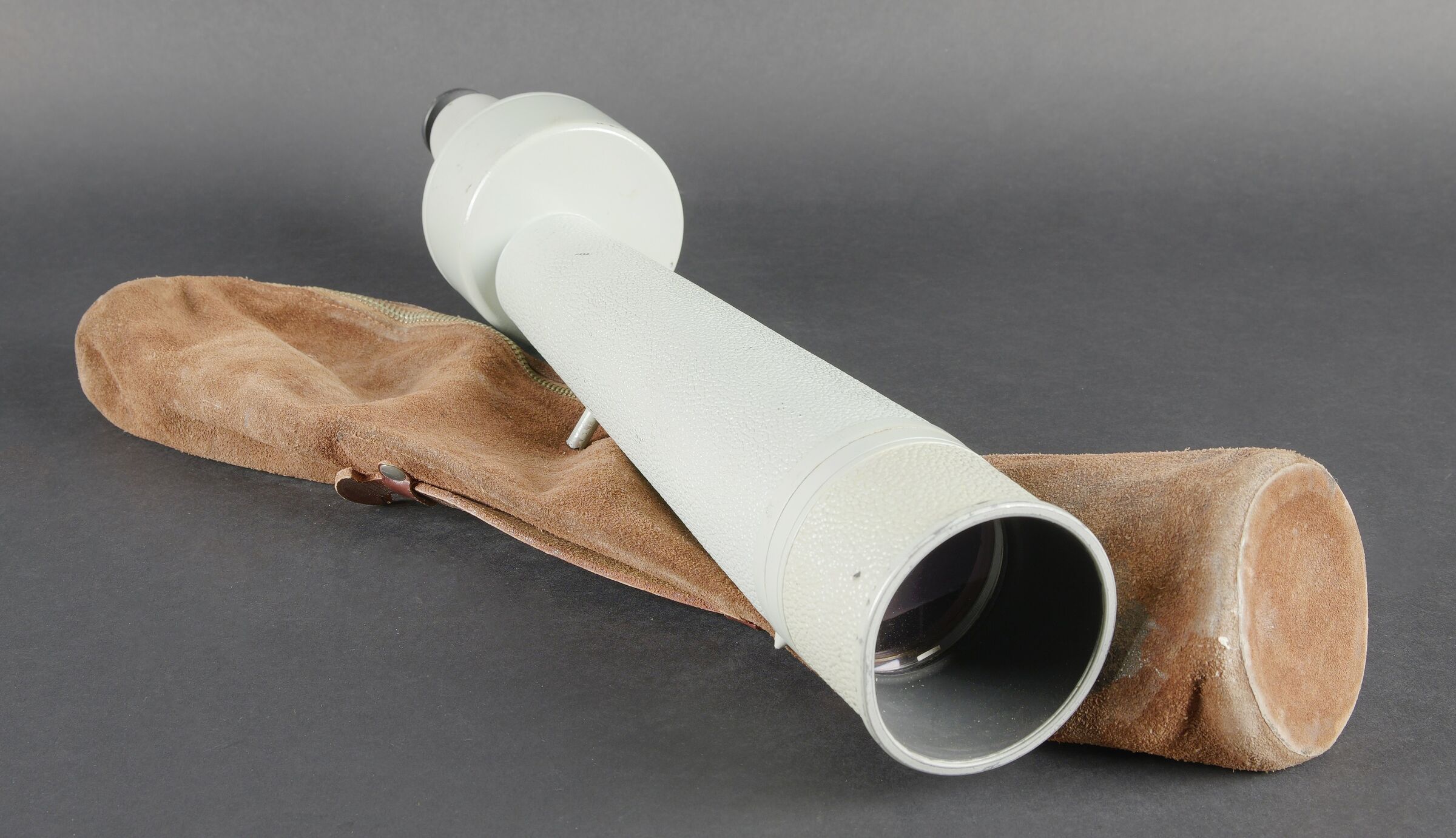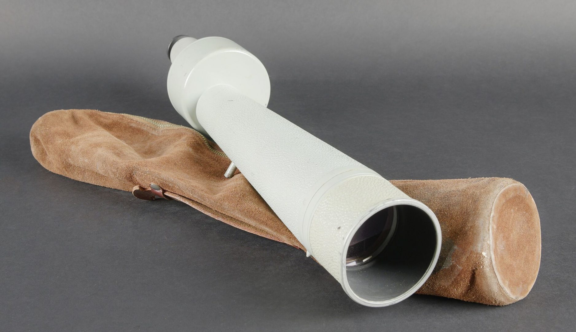 Monoculaire Carl Zeiss. En métal. Peinture grise à 90%. Fabrication Carl Zeiss Jena Hergestellt in der DDR. Optique claire présentant quelques tâches. Grossissement X 10. Housse en cuir retourné marron. Fermeture éclaire fonctionnelle. Quelques réparations et tâches sur l’ensemble de la housse. A noter une certaine usure et patine de la pièce. Etat II+. Carl Zeiss monocular Metal construction. Grey paint 90% preserved. Manufactured by Carl Zeiss Jena, Hergestellt in der DDR. Clear optics with some spotting. Magnification ×10. Brown reversed leather carrying case with functional zipper. Several repairs and stains to the case. Note some wear and patina to the piece. Condition II+.
