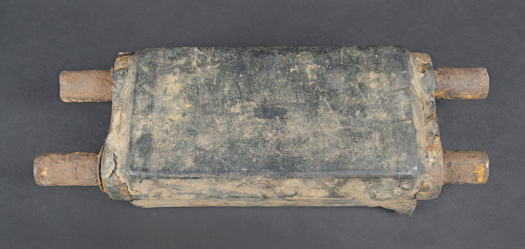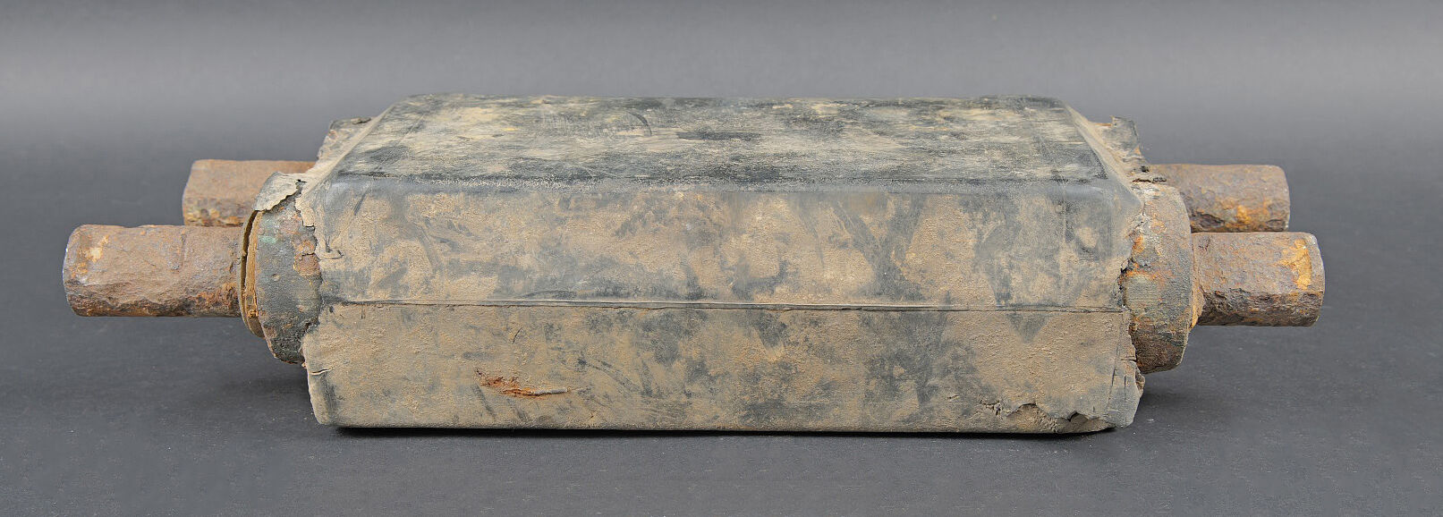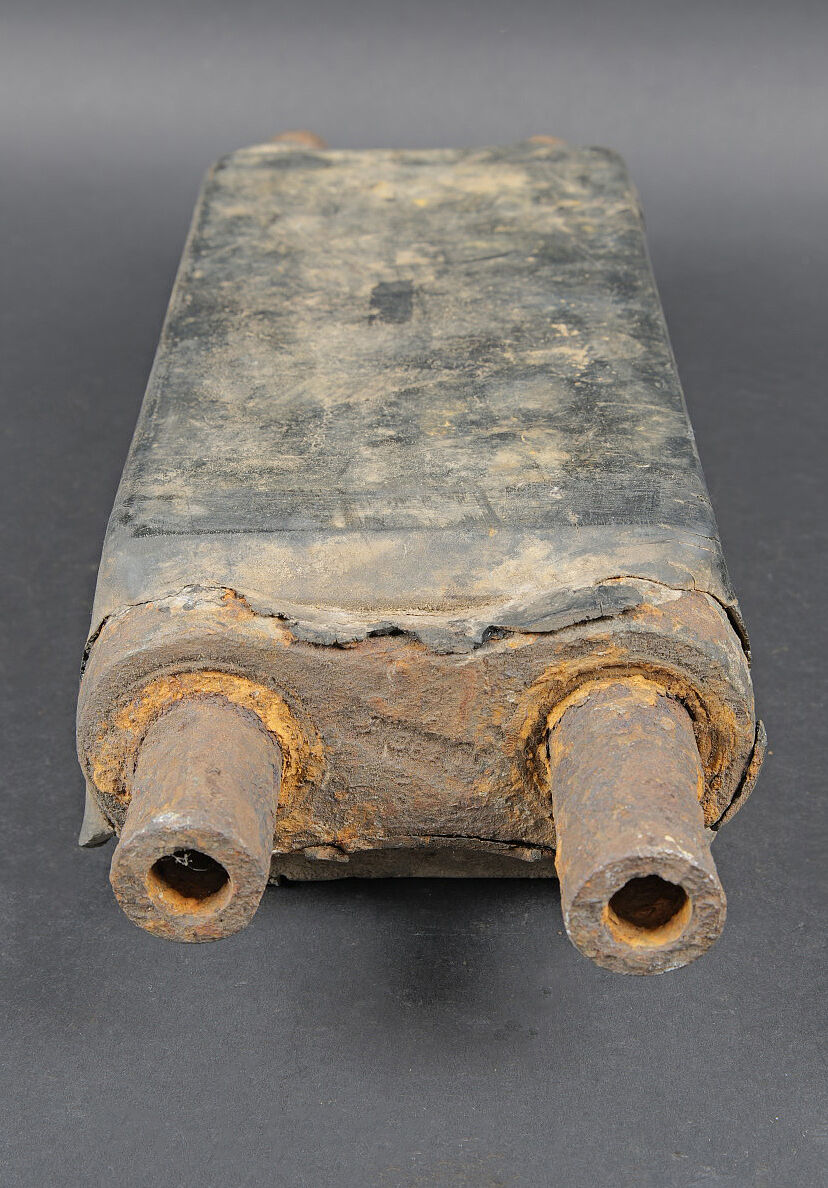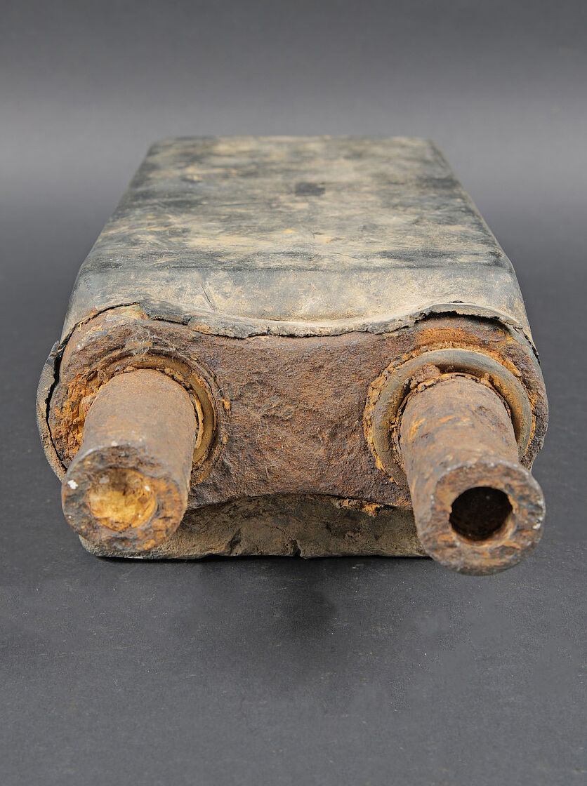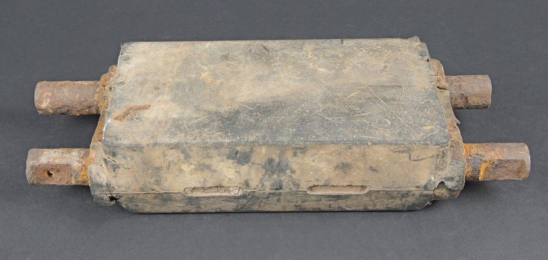 Patin de char Shermann. Modèle en caoutchouc et métal. Environ 8kg. Le caoutchouc est fortement abîmé. Le métal est oxydé. A noter une certaine usure et patine de la pièce. Etat II+. Sherman tank track shoe Rubber and metal construction, approximately 8 kg. Rubber heavily damaged. Metal oxidised. Note some wear and patina to the piece. Condition II+.