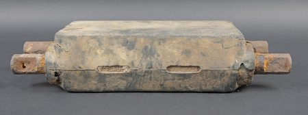 Détails de la vente >Patin de char Shermann. Modèle en caoutchouc et métal. Environ 8kg. Le caoutchouc est fortement abîmé. Le métal est oxydé. A noter une certaine usure et patine de la pièce. Etat II+.... en savoir plus