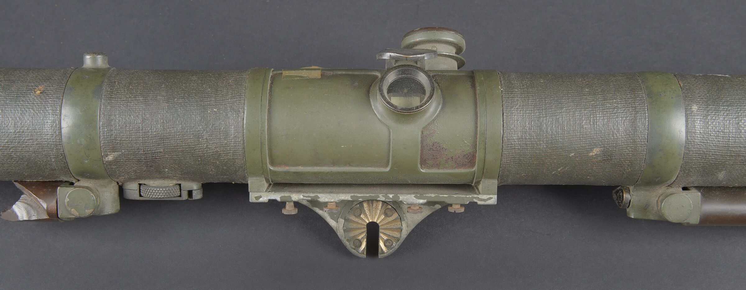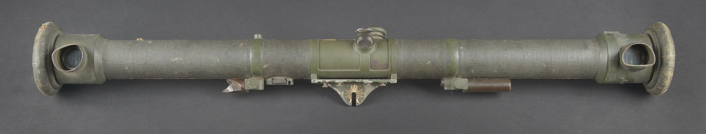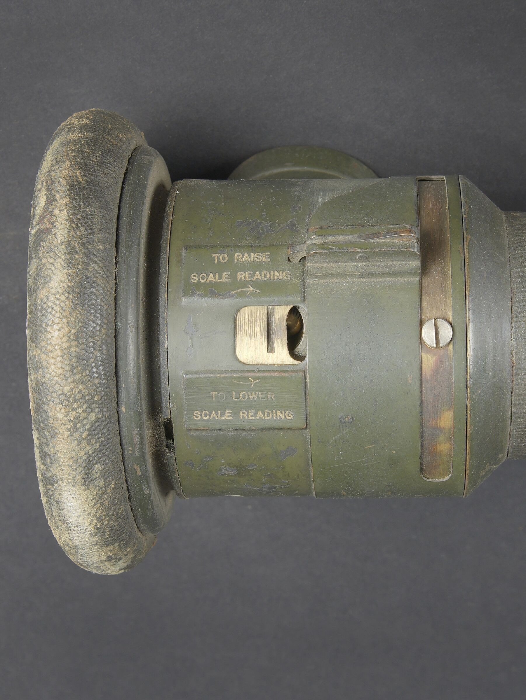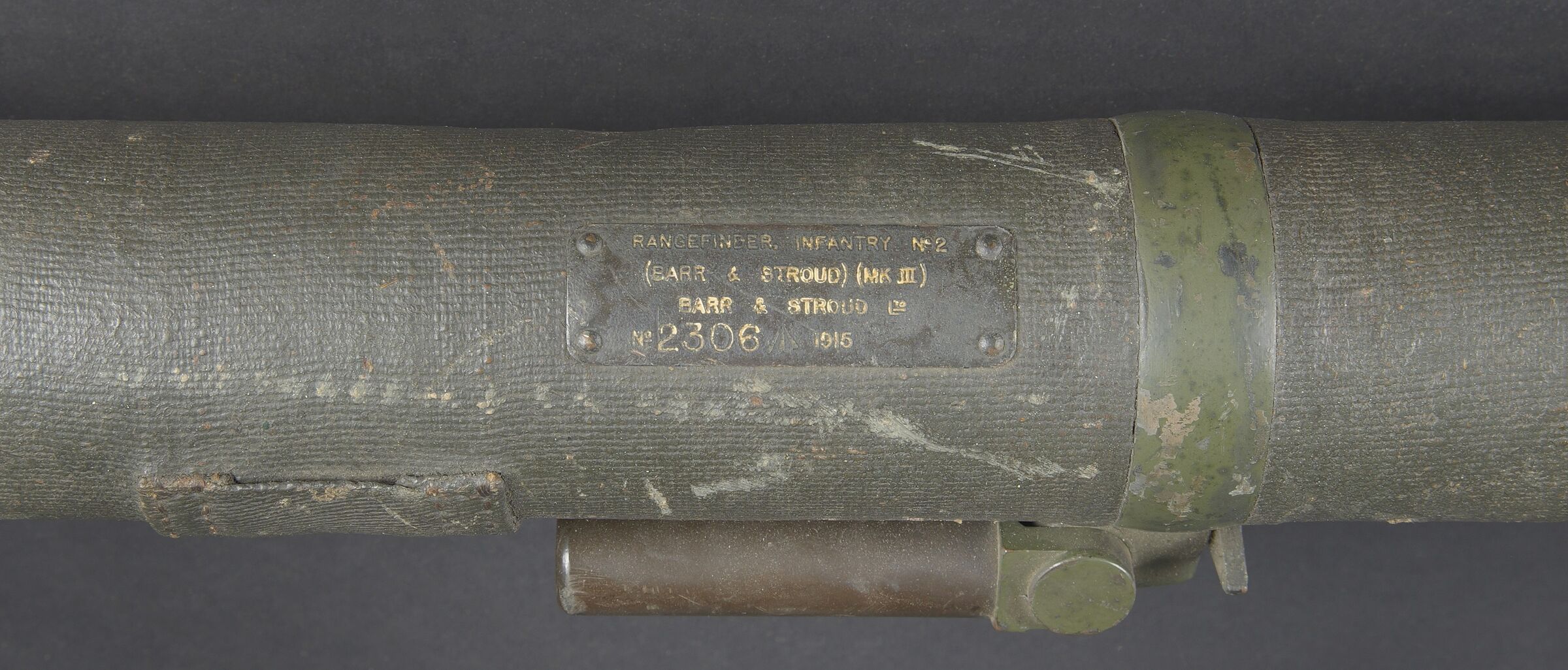 Télémètre anglais Barr and Stoud 1915. Peint en vert, avec ses plaques signalétiques, bien daté 1915. Un œilleton manquant, quelques coups, optique non clair. Usure d’usage. British Barr & Stroud rangefinder, dated 1915. Green-painted finish, retaining its maker’s data plates and clearly dated 1915. One eyepiece missing. Showing minor dents and impacts; optics cloudy. Service wear.