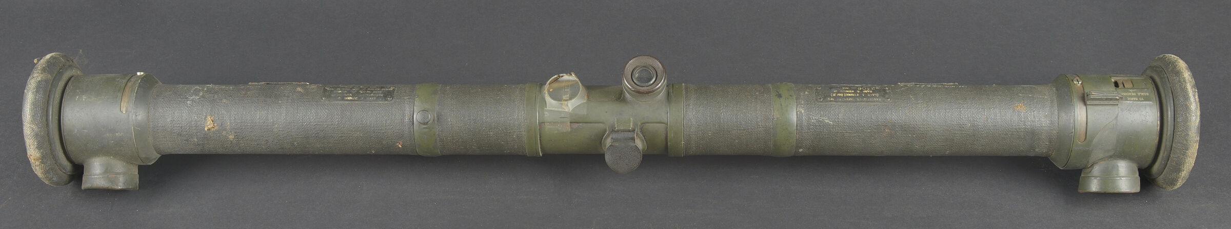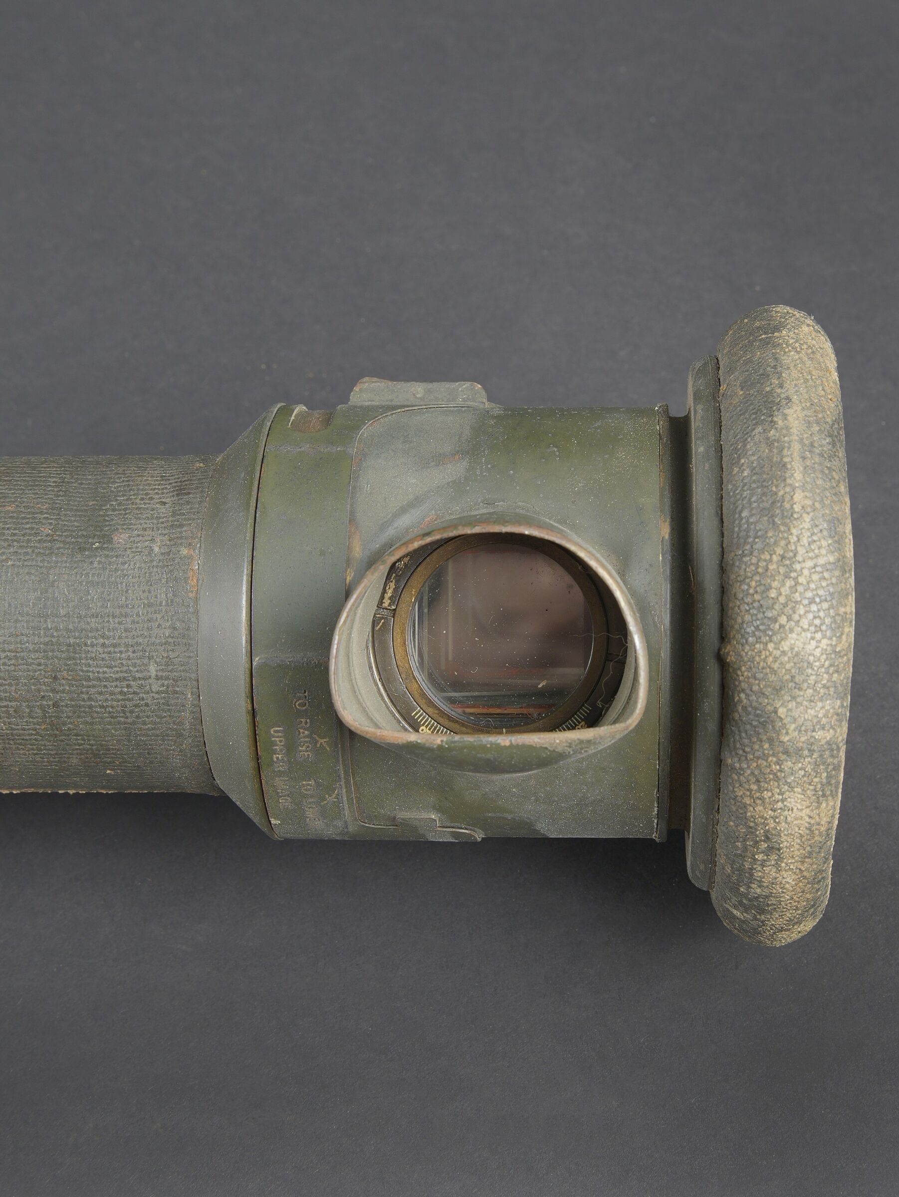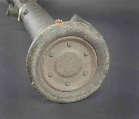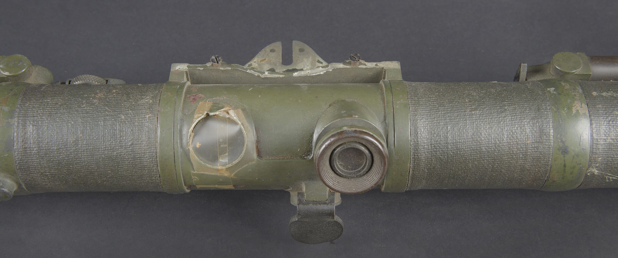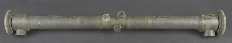 Télémètre anglais Barr and Stoud 1915. Peint en vert, avec ses plaques signalétiques, bien daté 1915. Un œilleton manquant, quelques coups, optique non clair. Usure d’usage. British Barr & Stroud rangefinder, dated 1915. Green-painted finish, retaining its maker’s data plates and clearly dated 1915. One eyepiece missing. Showing minor dents and impacts; optics cloudy. Service wear.