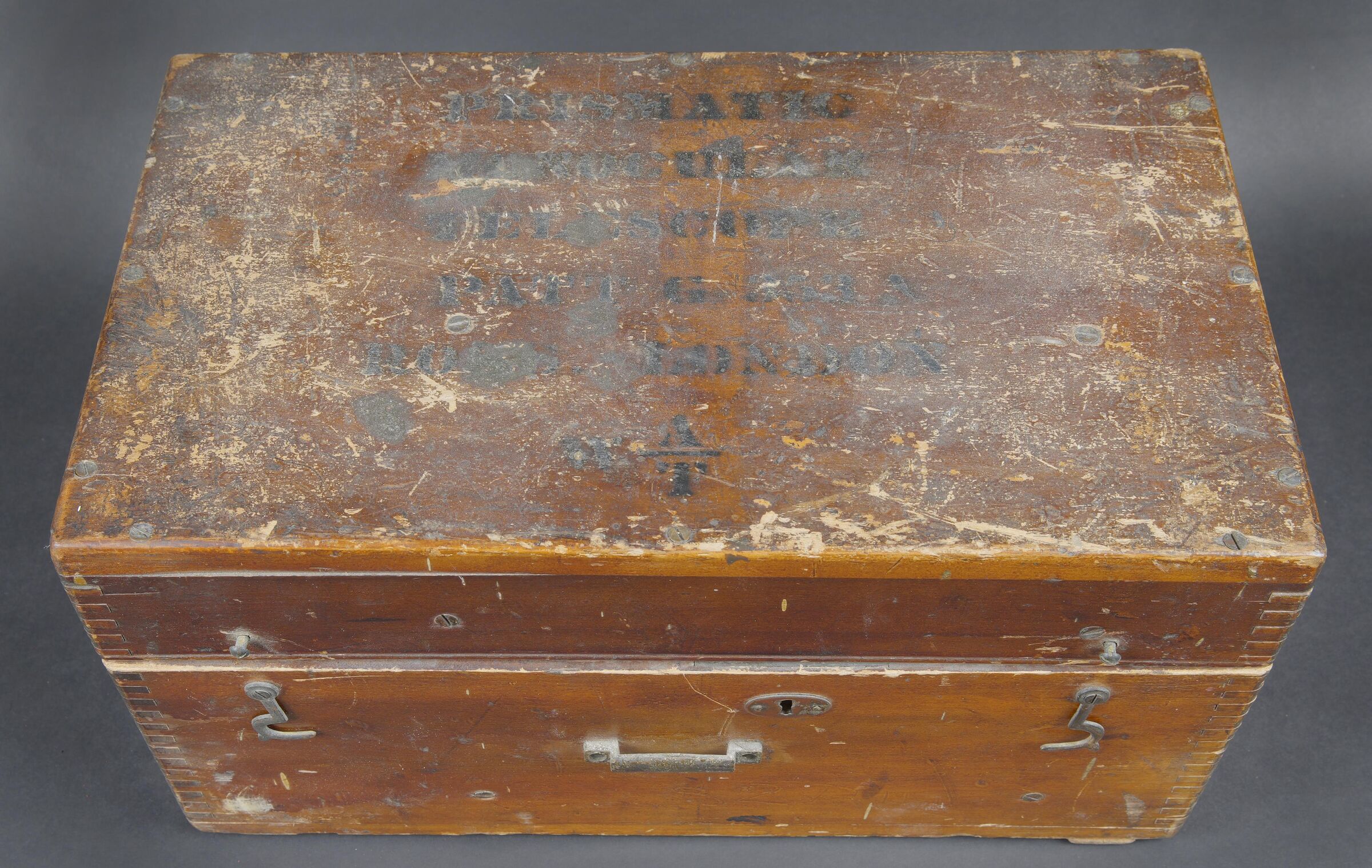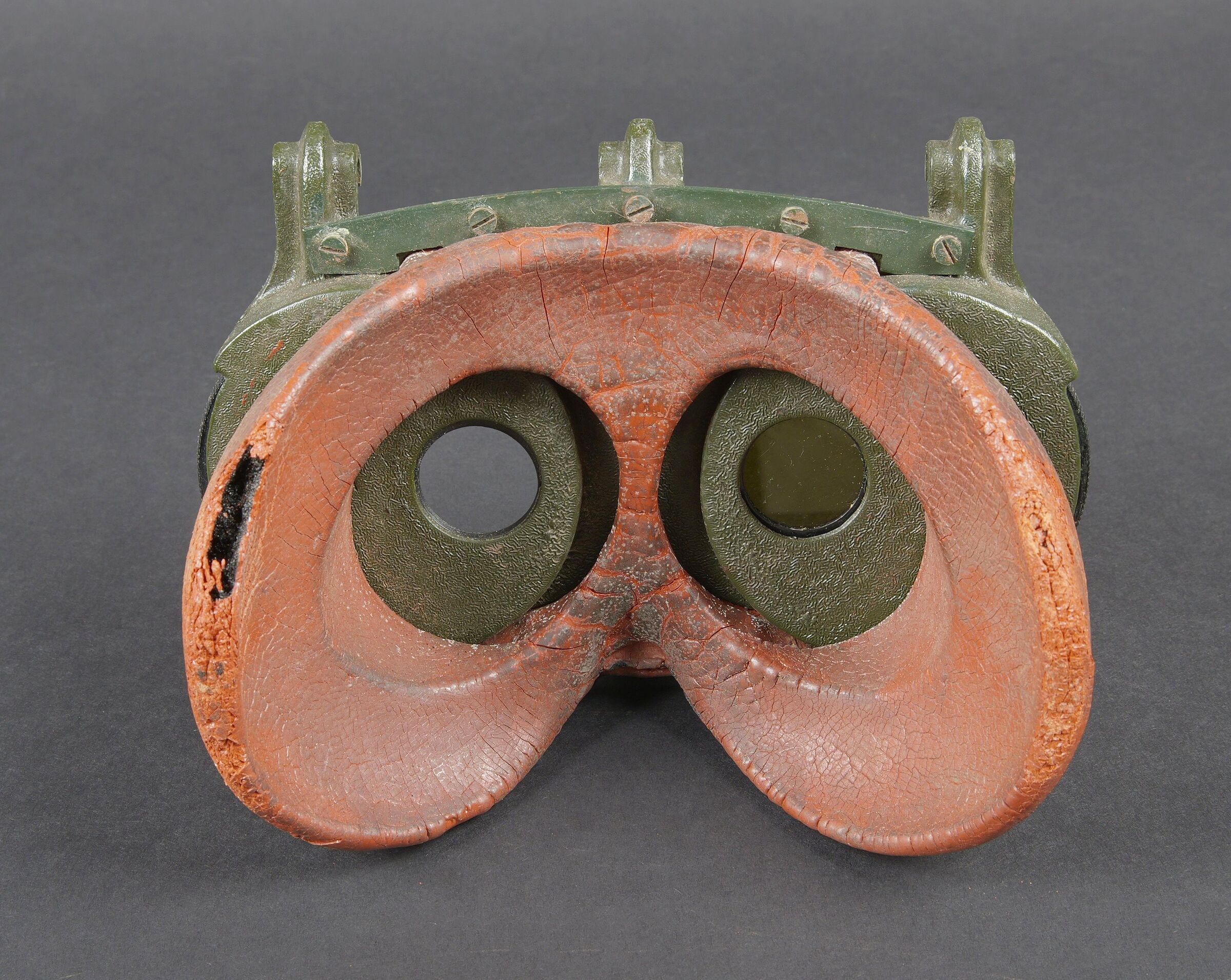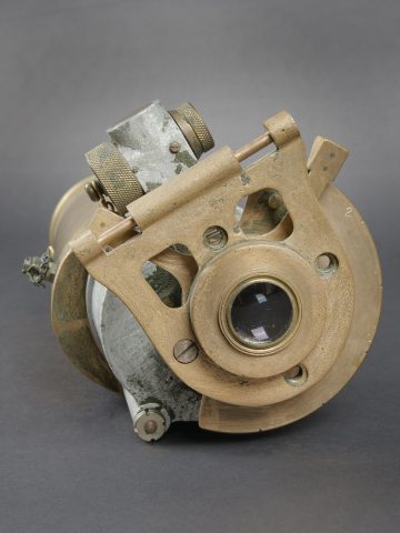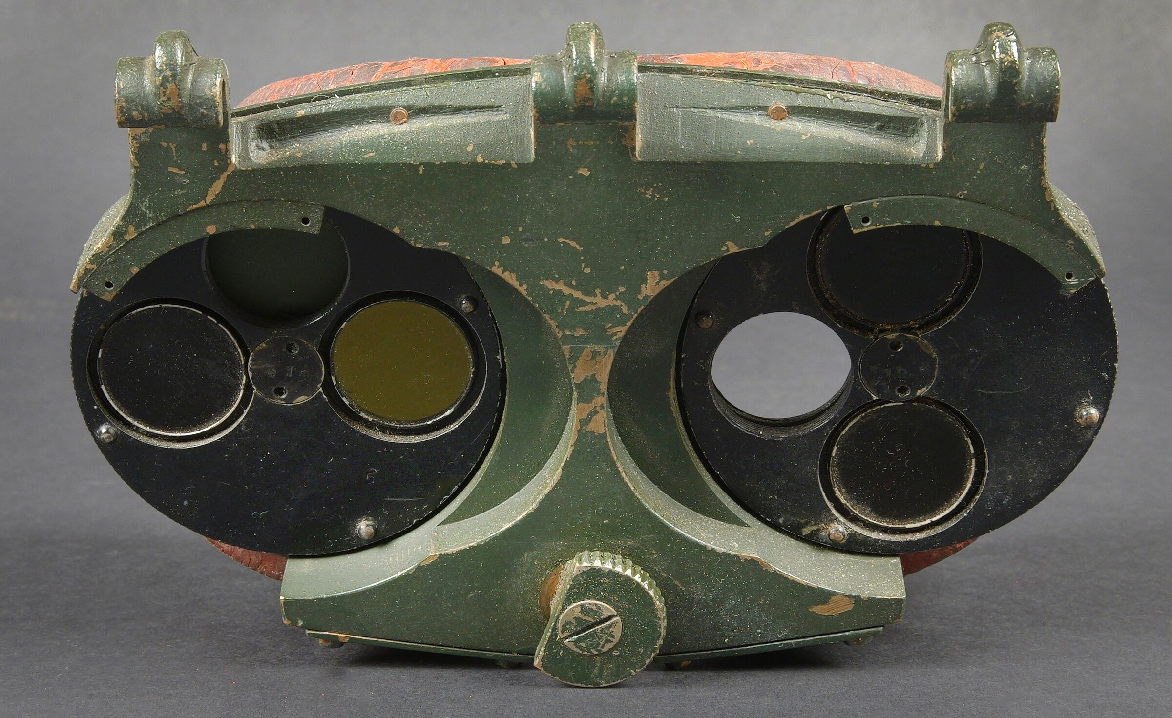7 x 50 monocular gunsight britannique. G353AH 7 X 50 Naval Turret Gunsight. Modèle pour la Royal Navy britannique. Visée en laiton et en métal. Marquages 7 x 50 Monocular Gunsight Patt G 353A Ross London numéro 116177 WAT, daté 1941 avec broad arrow. Toute les pièces mobiles sont fonctionnelles. Optique claire et graduée présentant des tâches. Protège front en caoutchouc marron, celui-ci est fortement usé et sec. Les filtres sont présents et réglables. belle caisse en bois. Les marquages sur le couvercles sont partiellement illisibles. La sangle de fermeture en cuir est absente. Les crochets du couvercle sont fonctionnels. Les cales interne sont présentes et recouvertes d’un tissu vert. A noter une certaine usure et patine de la pièce. Etat II+. La clé de fermeture est absente. Utilisés par la Royal Navy dans les années 1940, spécialement conçus pour les destroyers et les cuirassés, de tels instruments auraient été montés à l’origine en hauteur sur la tour de conning d’un navire de guerre, et étaient utilisés pour apercevoir les navires ennemis, les avions et les cibles côtières. British 7 × 50 monocular gunsight. G353AH 7 × 50 Naval Turret Gunsight, a model for the British Royal Navy. Sight in brass and metal. Marked 7 × 50 Monocular Gunsight Patt. G353A Ross London No. 116177 WAT, dated 1941 with Broad Arrow. All moving parts are in working order. Clear graduated optics showing some spotting. Brown rubber forehead rest, heavily worn and dried. Filters present and adjustable. Fine wooden transit case, the markings on the lid partially illegible. The leather closing strap is absent. Lid hooks are functional. The internal spacer blocks are present and covered in green cloth. Noteworthy overall wear and an attractive period patina. Condition II+. The locking key is missing. Used by the Royal Navy during the 1940s, specially designed for destroyers and battleships, such instruments were originally mounted in an elevated position on the conning tower of a warship and were employed to detect enemy vessels, aircraft and coastal targets.