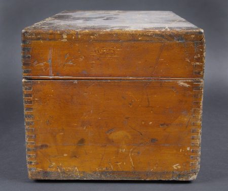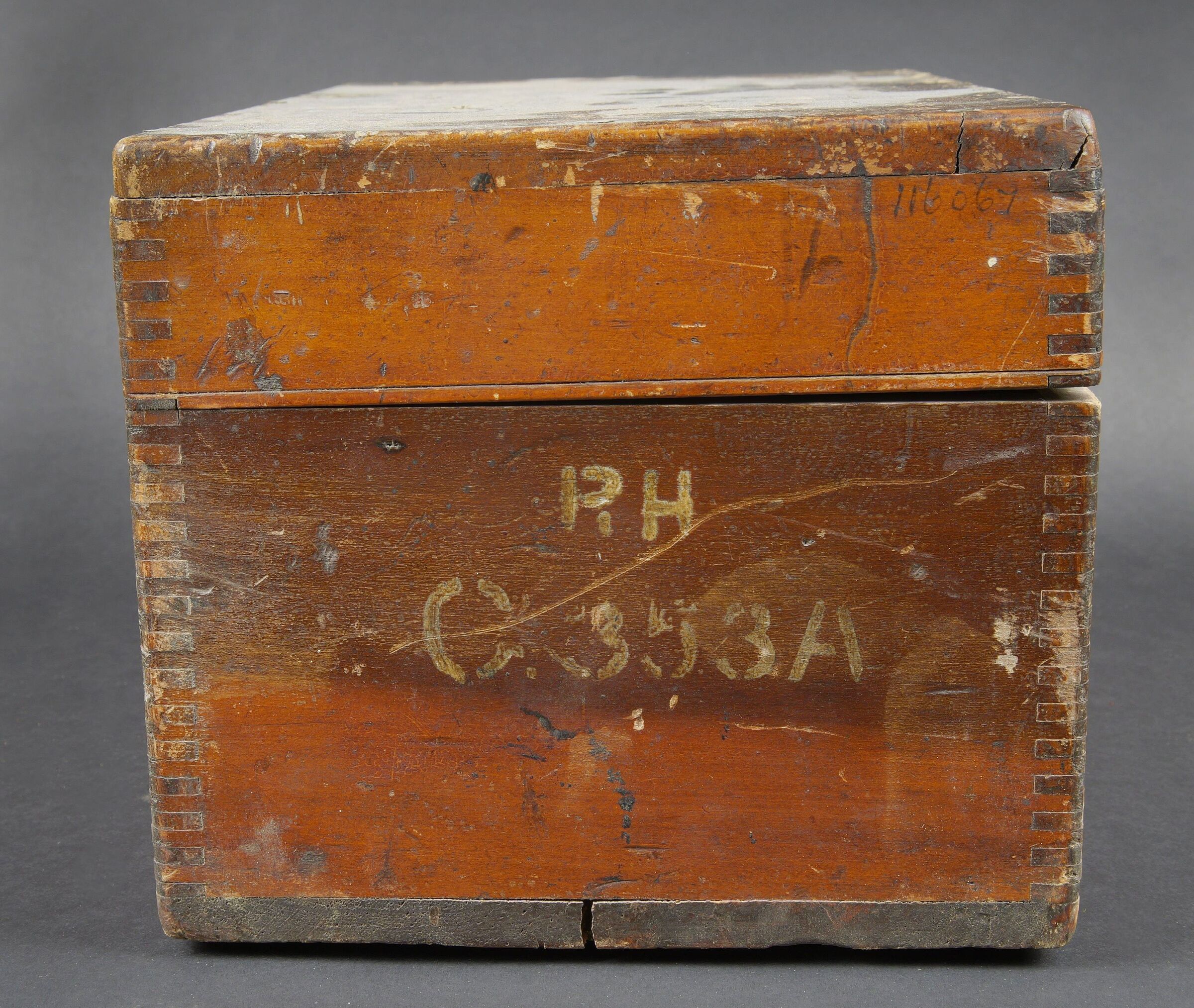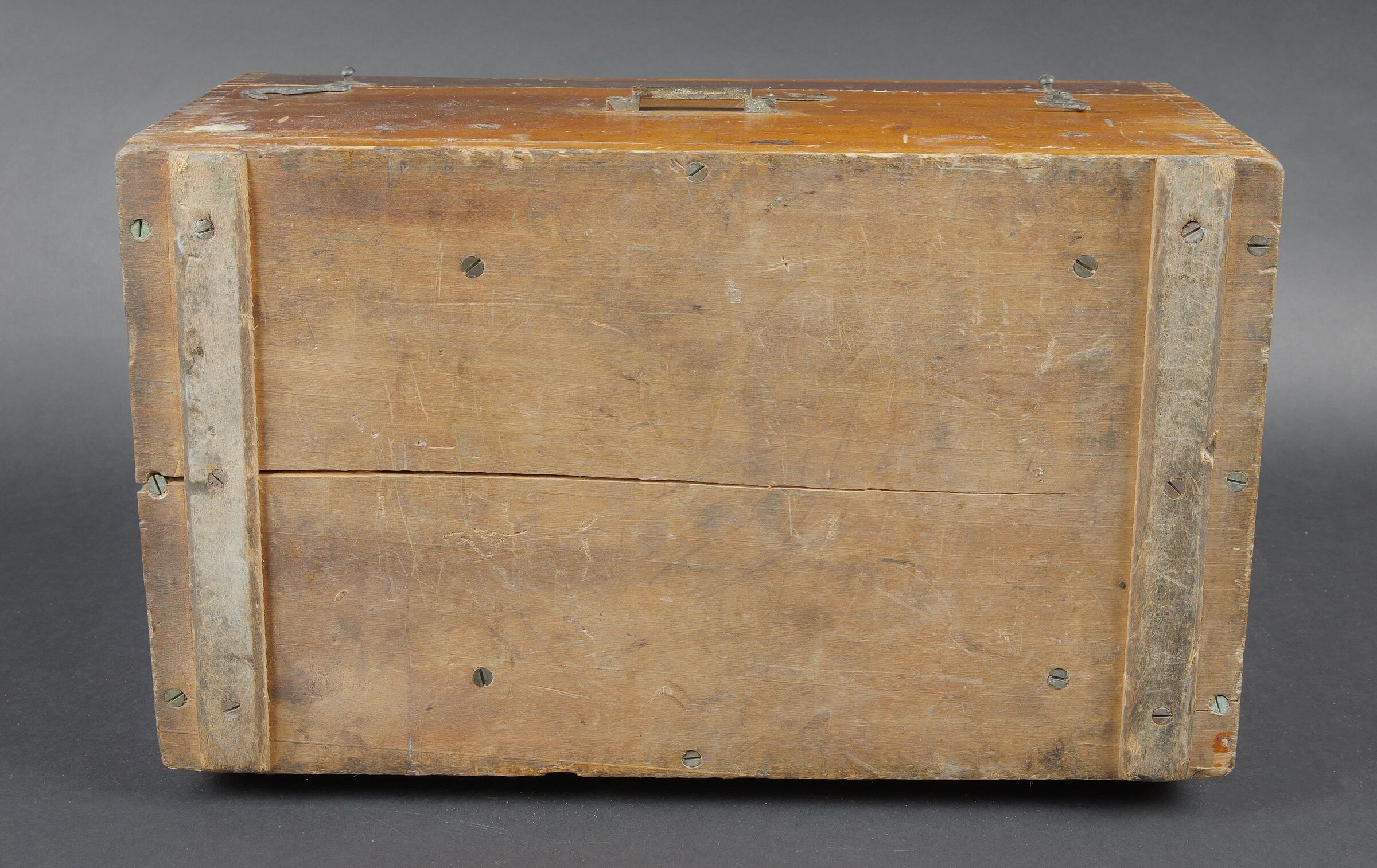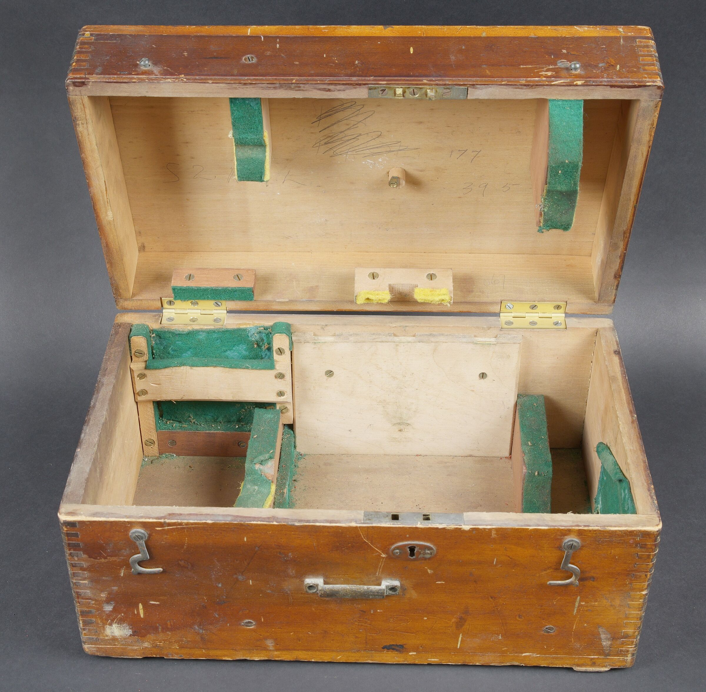 7 x 50 monocular gunsight britannique. G353AH 7 X 50 Naval Turret Gunsight. Modèle pour la Royal Navy britannique. Visée en laiton et en métal. Marquages 7 x 50 Monocular Gunsight Patt G 353A Ross London numéro 116177 WAT, daté 1941 avec broad arrow. Toute les pièces mobiles sont fonctionnelles. Optique claire et graduée présentant des tâches. Protège front en caoutchouc marron, celui-ci est fortement usé et sec. Les filtres sont présents et réglables. belle caisse en bois. Les marquages sur le couvercles sont partiellement illisibles. La sangle de fermeture en cuir est absente. Les crochets du couvercle sont fonctionnels. Les cales interne sont présentes et recouvertes d’un tissu vert. A noter une certaine usure et patine de la pièce. Etat II+. La clé de fermeture est absente. Utilisés par la Royal Navy dans les années 1940, spécialement conçus pour les destroyers et les cuirassés, de tels instruments auraient été montés à l’origine en hauteur sur la tour de conning d’un navire de guerre, et étaient utilisés pour apercevoir les navires ennemis, les avions et les cibles côtières. British 7 × 50 monocular gunsight. G353AH 7 × 50 Naval Turret Gunsight, a model for the British Royal Navy. Sight in brass and metal. Marked 7 × 50 Monocular Gunsight Patt. G353A Ross London No. 116177 WAT, dated 1941 with Broad Arrow. All moving parts are in working order. Clear graduated optics showing some spotting. Brown rubber forehead rest, heavily worn and dried. Filters present and adjustable. Fine wooden transit case, the markings on the lid partially illegible. The leather closing strap is absent. Lid hooks are functional. The internal spacer blocks are present and covered in green cloth. Noteworthy overall wear and an attractive period patina. Condition II+. The locking key is missing. Used by the Royal Navy during the 1940s, specially designed for destroyers and battleships, such instruments were originally mounted in an elevated position on the conning tower of a warship and were employed to detect enemy vessels, aircraft and coastal targets.