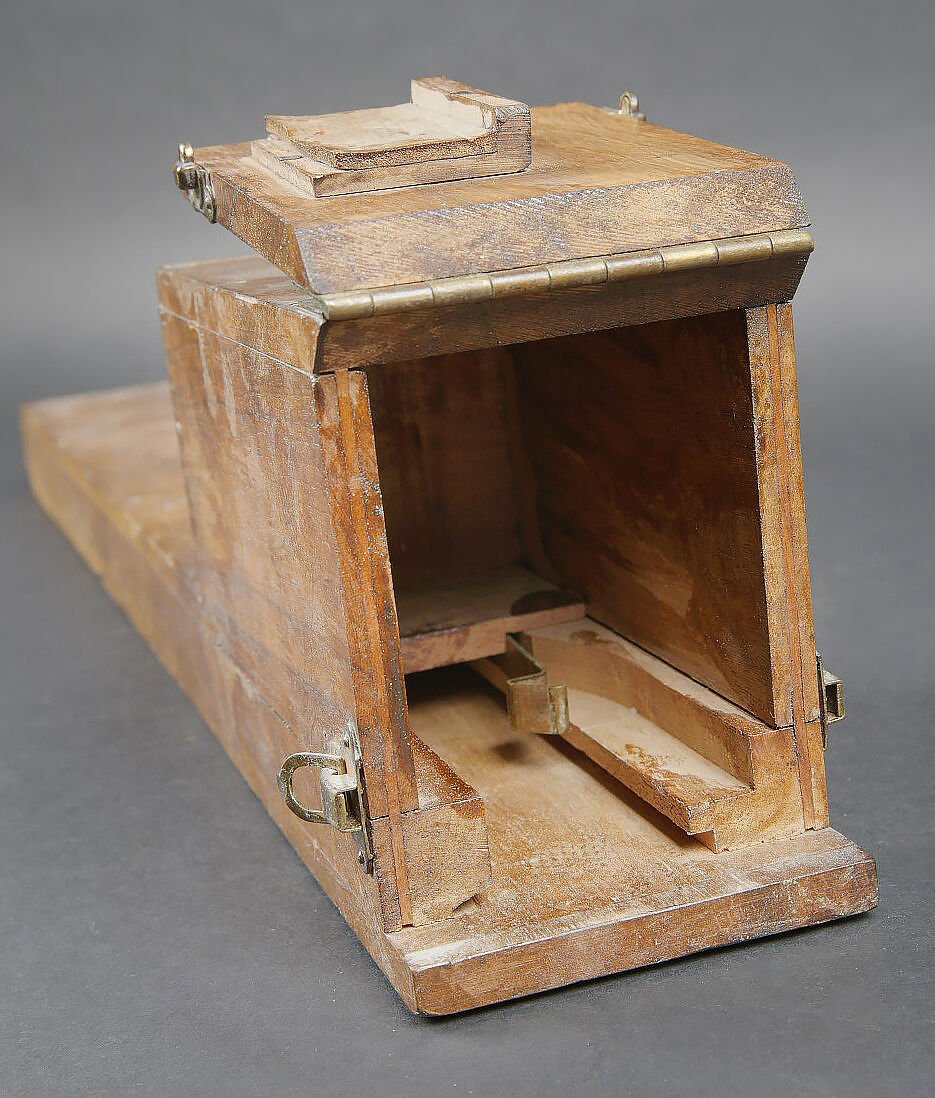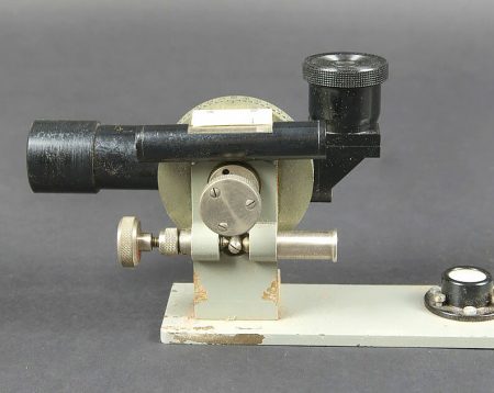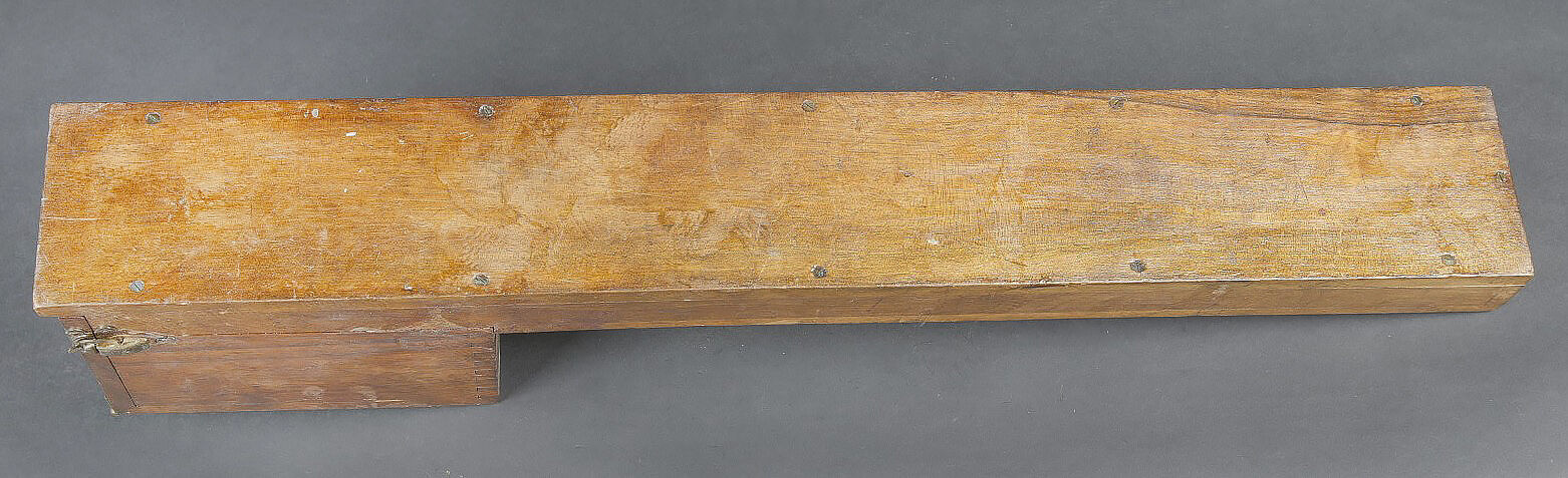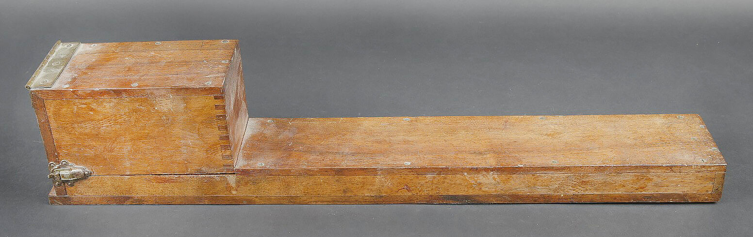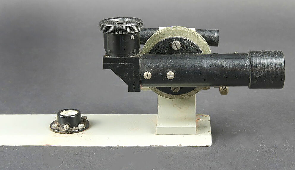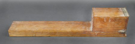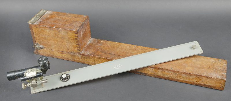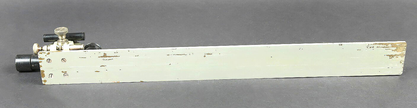 Alidade de visée de l’artillerie. Boitier en bois. Charnière complète. Le système de fermeture est complet. Alidade en métal, peinture grise à 90%. Marquages A Lepetit Montrouge... en savoir plus