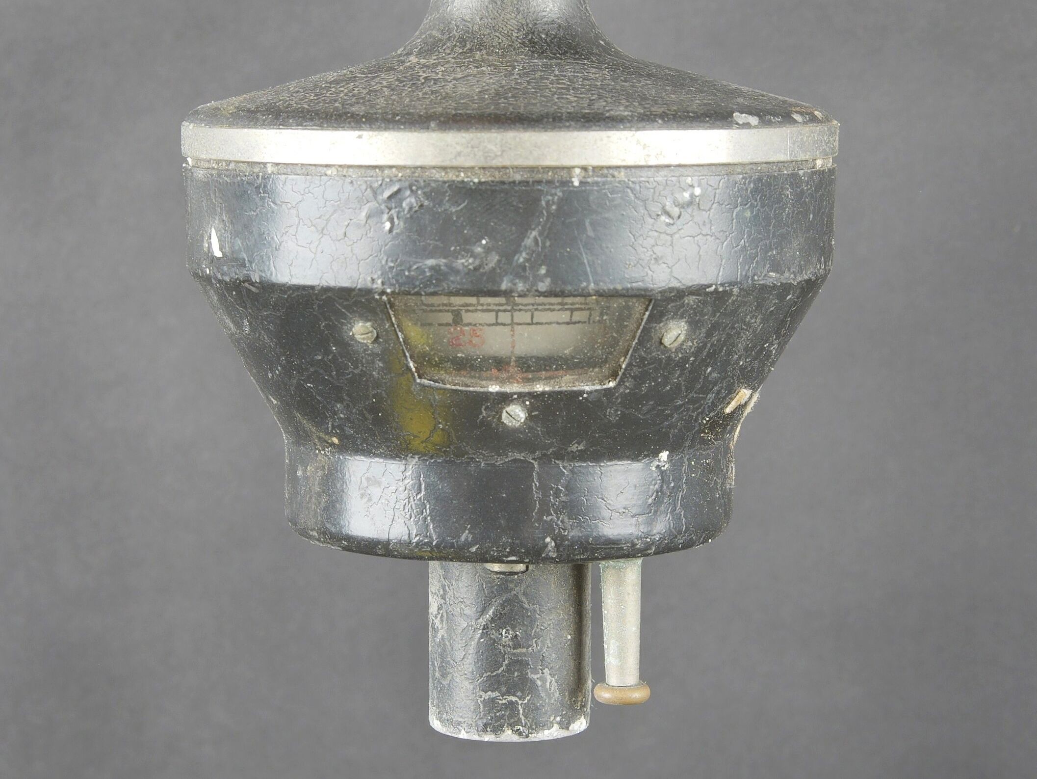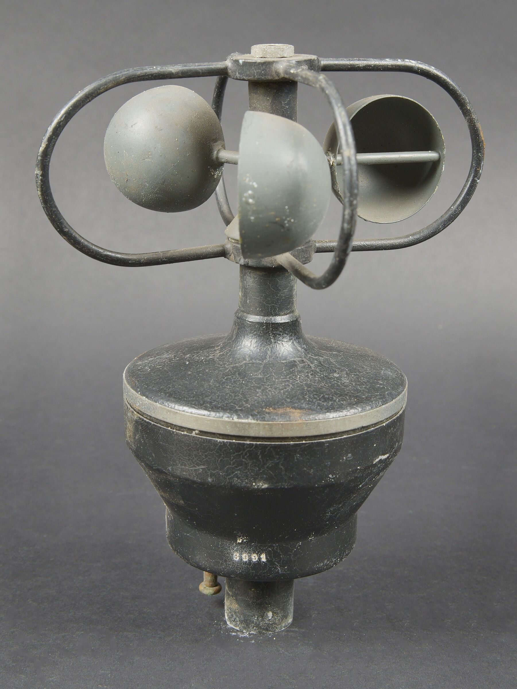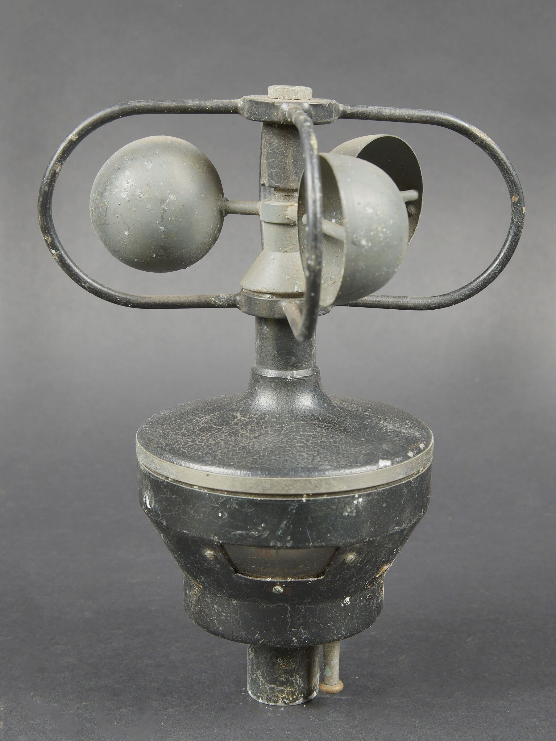 Anémomètre de la Marine Nationale française. Boite en bois. Le couvercle est fortement usé, et décollé par l’humidité. Poignée de transport en métal. Le crochet de fermeture est présent, mais oxydé. Les cales internes sont présentes et recouverte d’un velours vert incomplet. Appareil complet, numéro 3991. La notice d’utilisation est présente et datée 1962. A noter une certaine usure et patine de la pièce. Etat II+. Un anémomètre est un instrument de mesure essentiel pour quantifier la vitesse, la pression et parfois la direction du vent ou d’un flux de gaz. French Navy anemometer. Wooden case with heavily worn lid loosened by humidity, metal carrying handle and oxidised closing hook. Internal spacers present and lined with incomplete green velvet. Complete instrument No. 3991 with instruction manual dated 1962. Noteworthy overall wear and an attractive period patina. Condition II+. An anemometer is an essential instrument for measuring wind speed, pressure and sometimes direction.