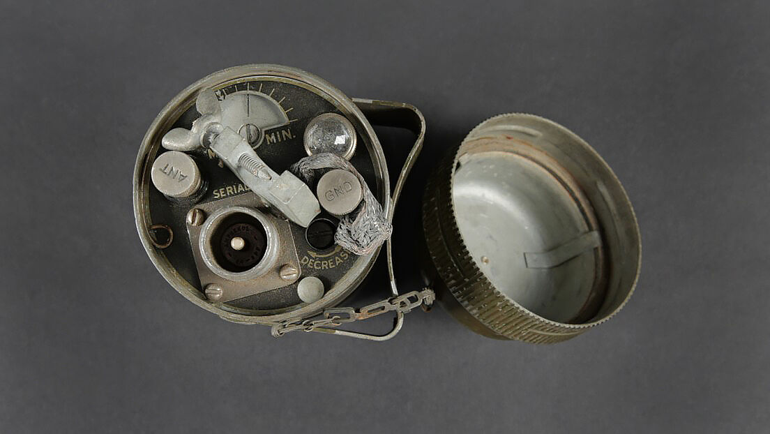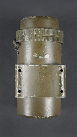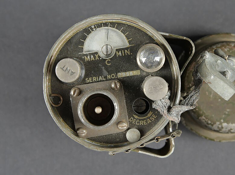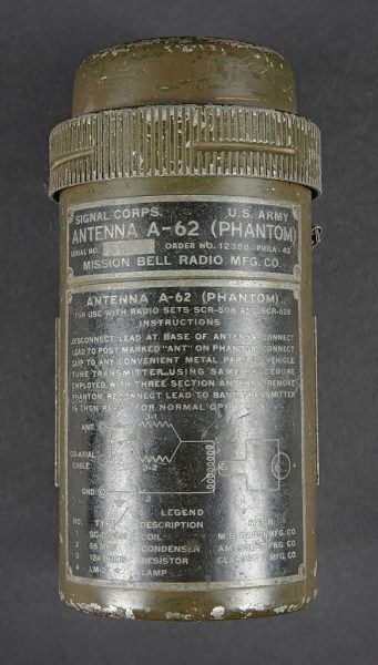 Antenne A-62 Phantom. Boitier en métal. Peinture kaki à 70%. Plaquette marquée Signal Corps US ARMY Antenna A-2 Phantom. Datée 1943. Toutes les pièces mobiles sont fonctionnelles. Couvercle complet avec sa chainette. Support de fixation présent. A noter une certaine usure et patine de la pièce. Etat II+. Antenna A-62 Phantom Metal housing with khaki paint 70% preserved. Plate marked Signal Corps US Army Antenna A-2 Phantom dated 1943. All moving parts functional. Complete lid with retaining chain. Mounting bracket present. Note some wear and patina to the piece. Condition II+.