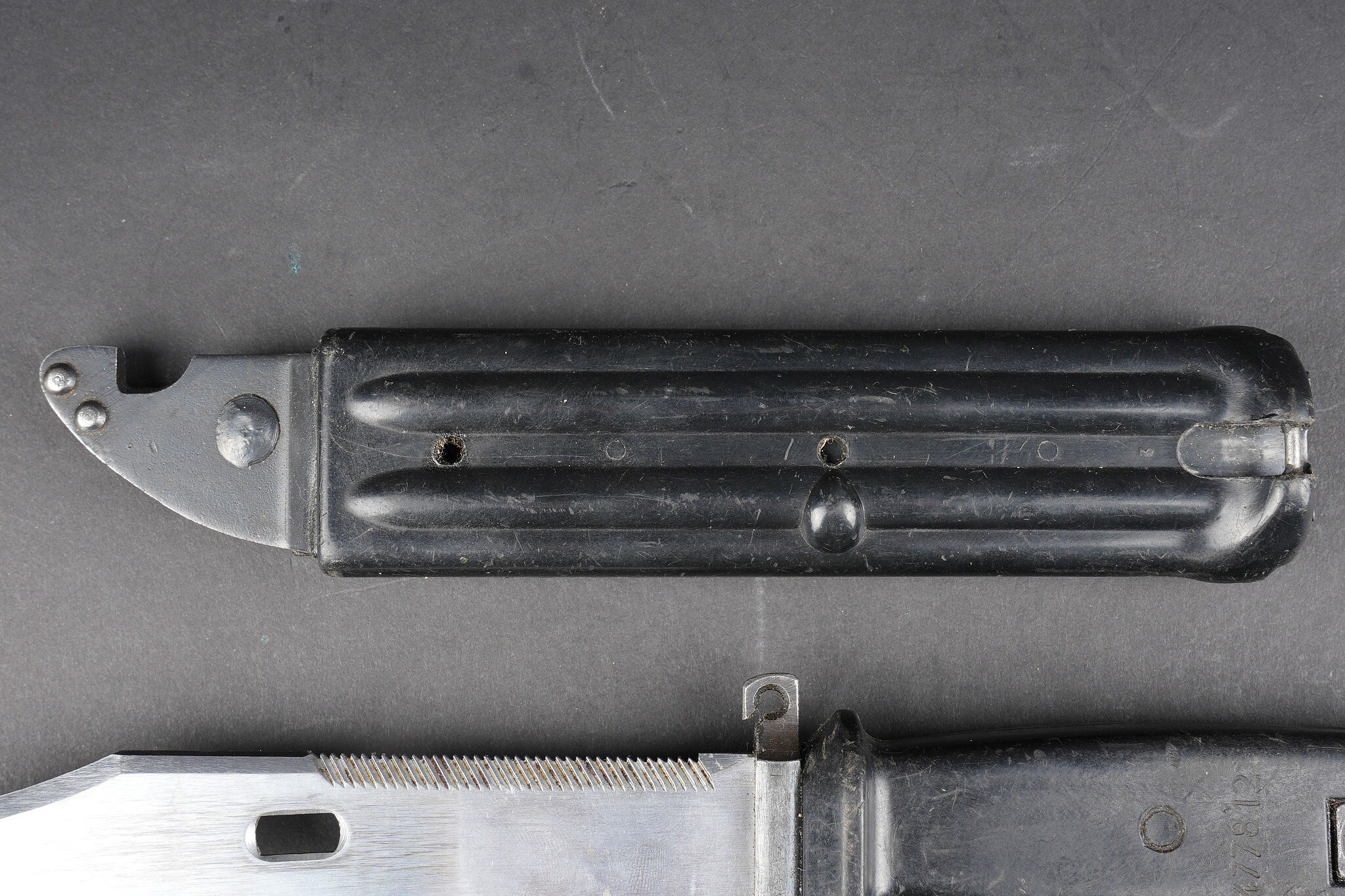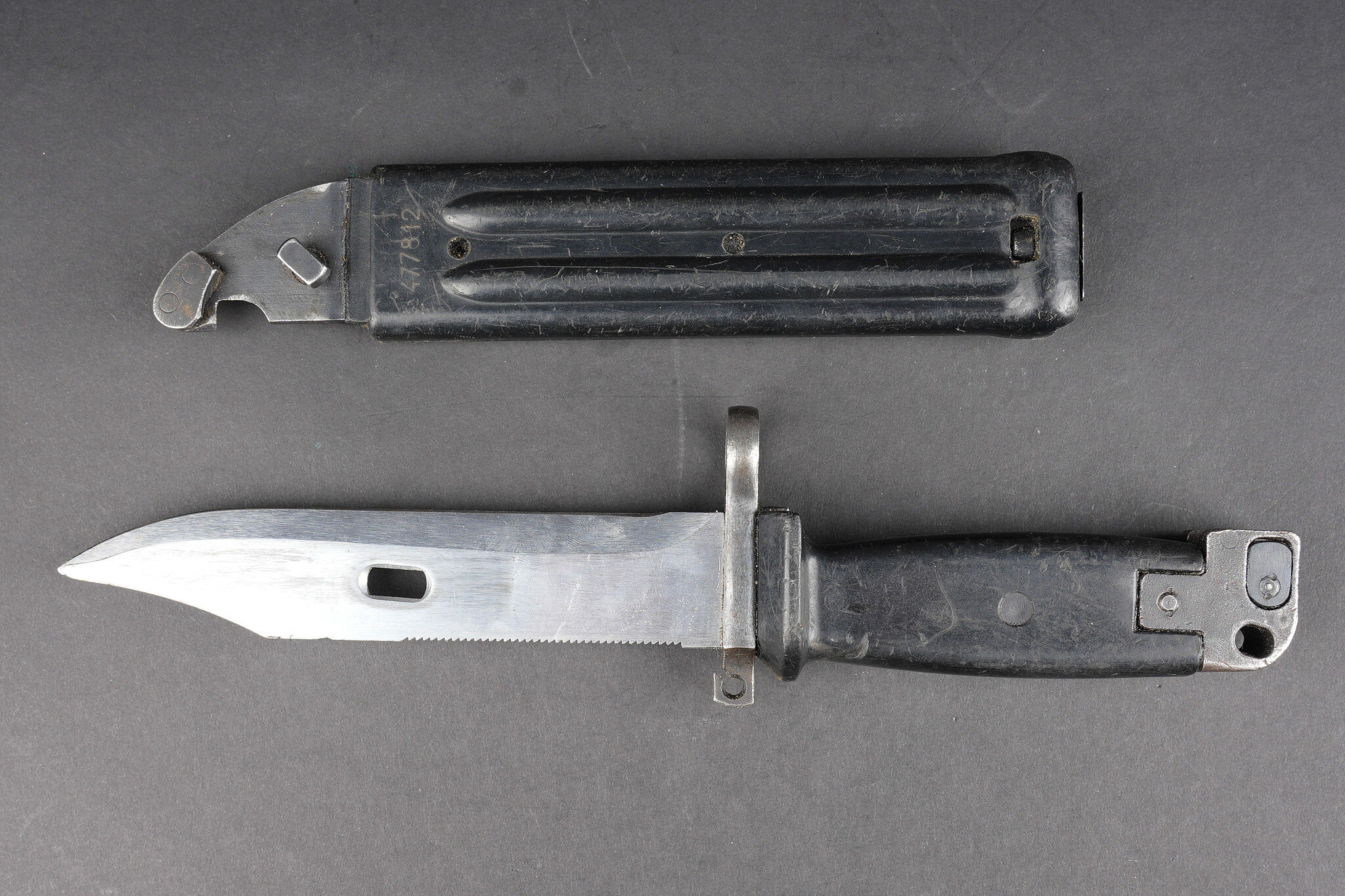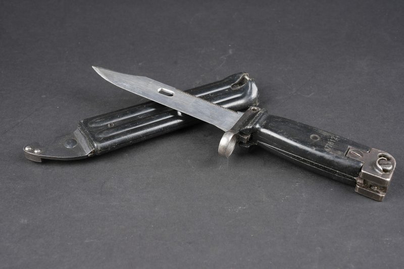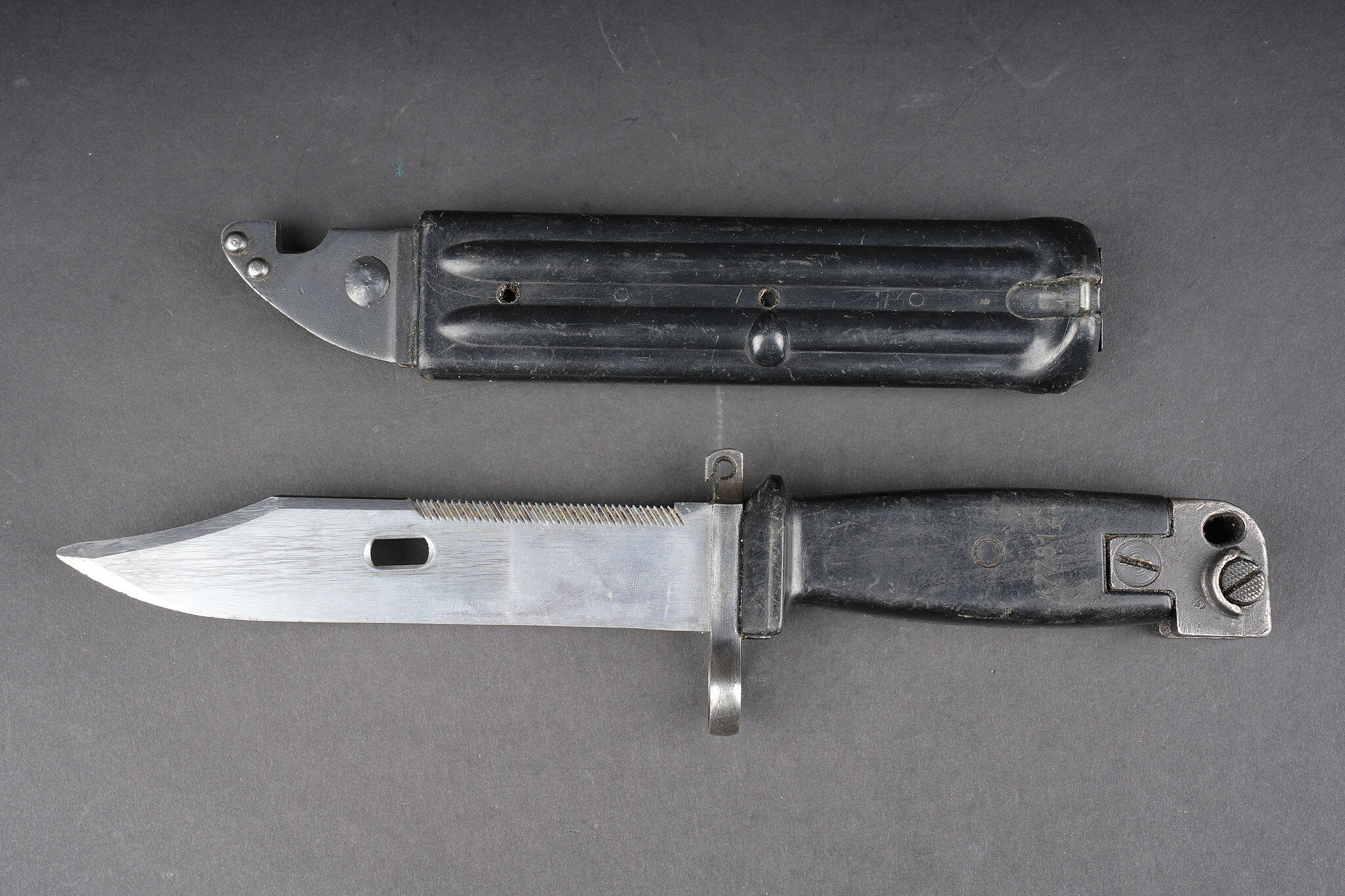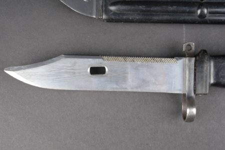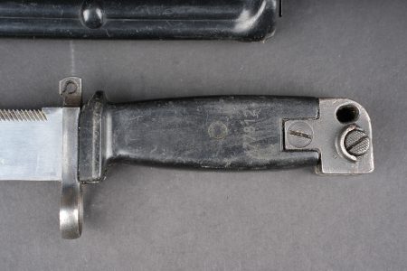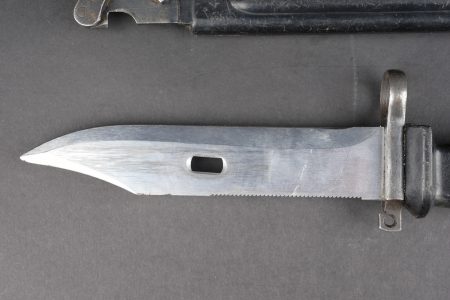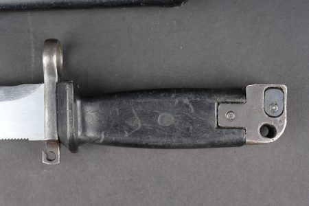 Baïonnette Yougoslave AKM. Avec son fourreau. Usure d’usage. Yugoslav AKM bayonet. Complete with scabbard. Service wear.
