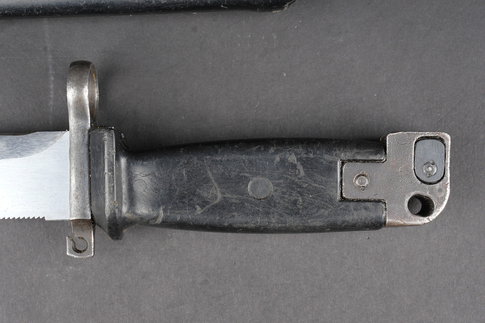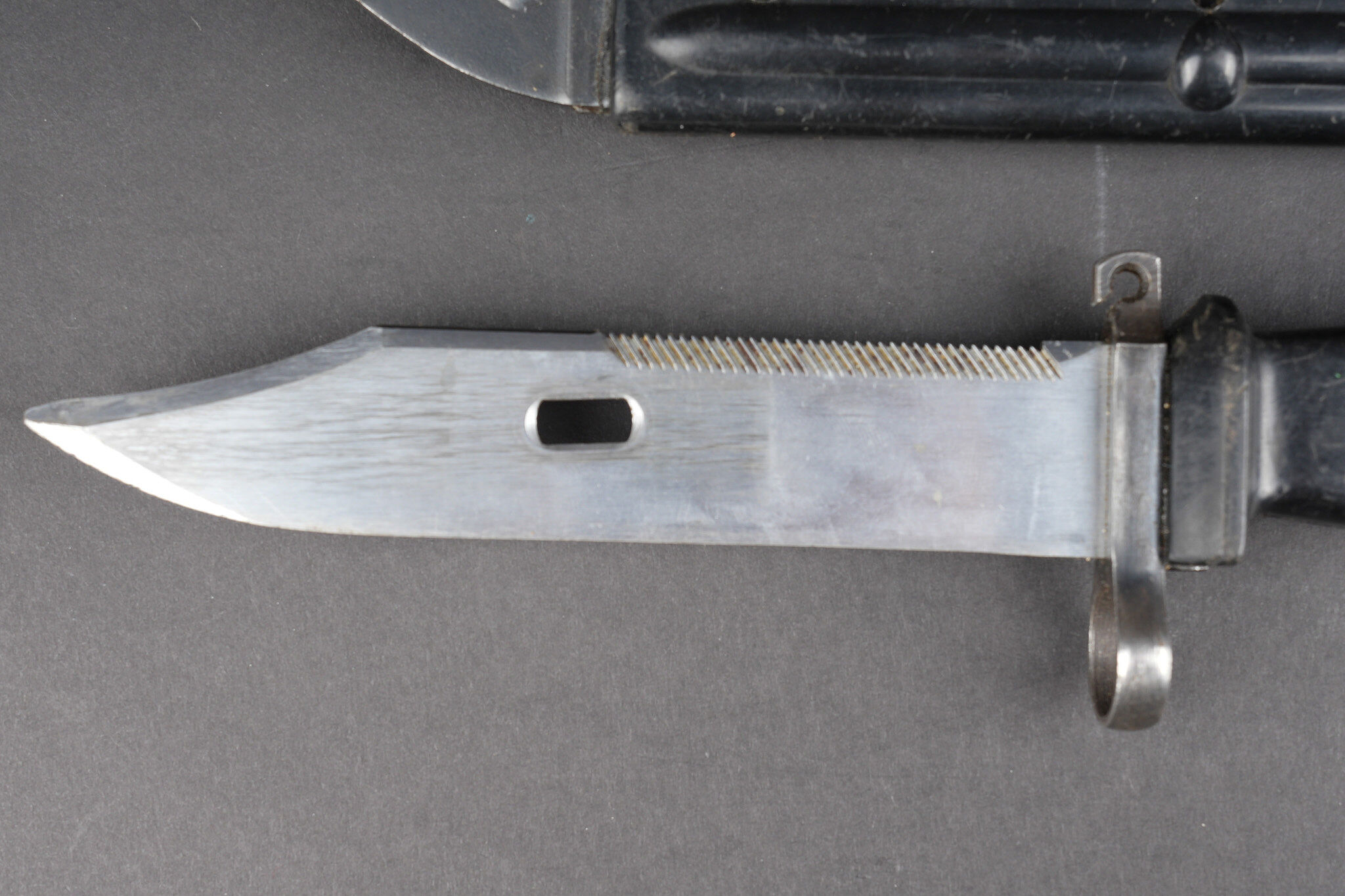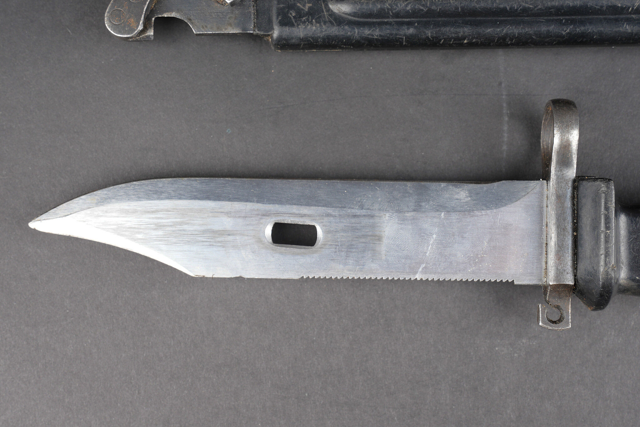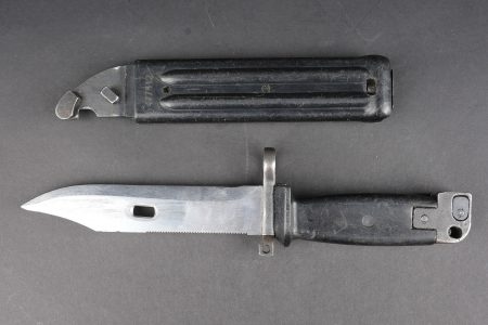 Détails de la vente >Baïonnette Yougoslave AKM. Avec son fourreau. Usure d’usage. Yugoslav AKM bayonet. Complete with scabbard. Service wear.