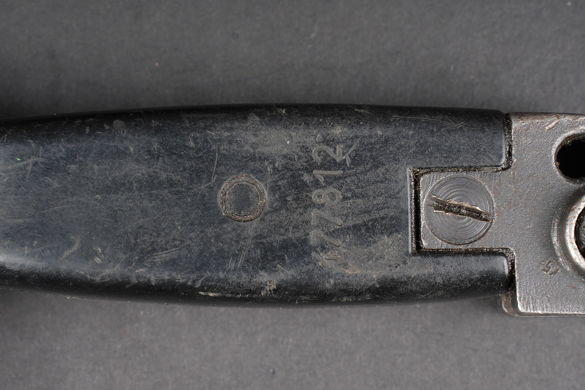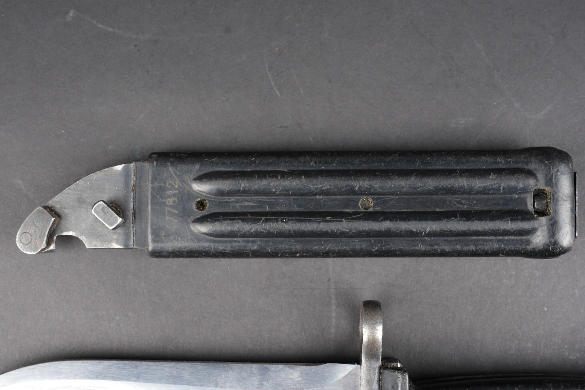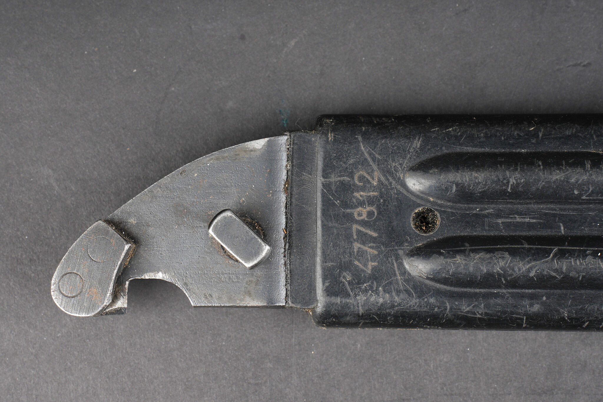 Détails de la vente >Baïonnette Yougoslave AKM. Avec son fourreau. Usure d’usage. Yugoslav AKM bayonet. Complete with scabbard. Service wear.