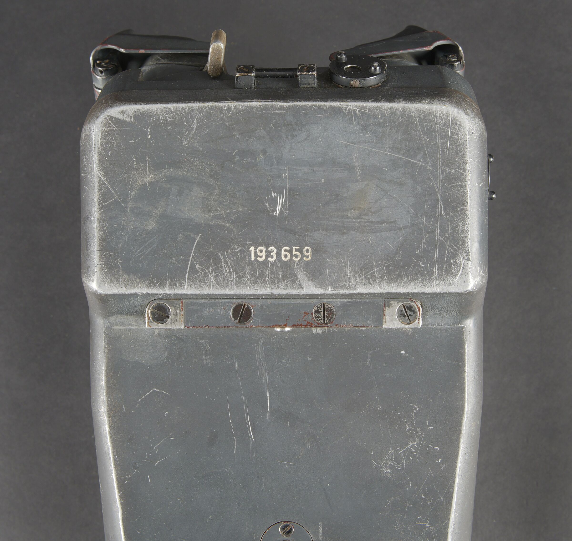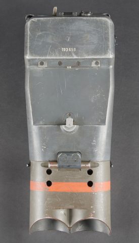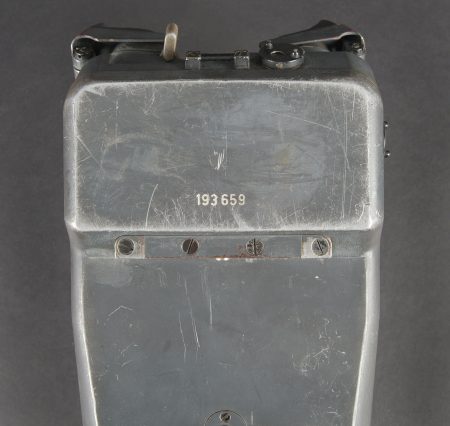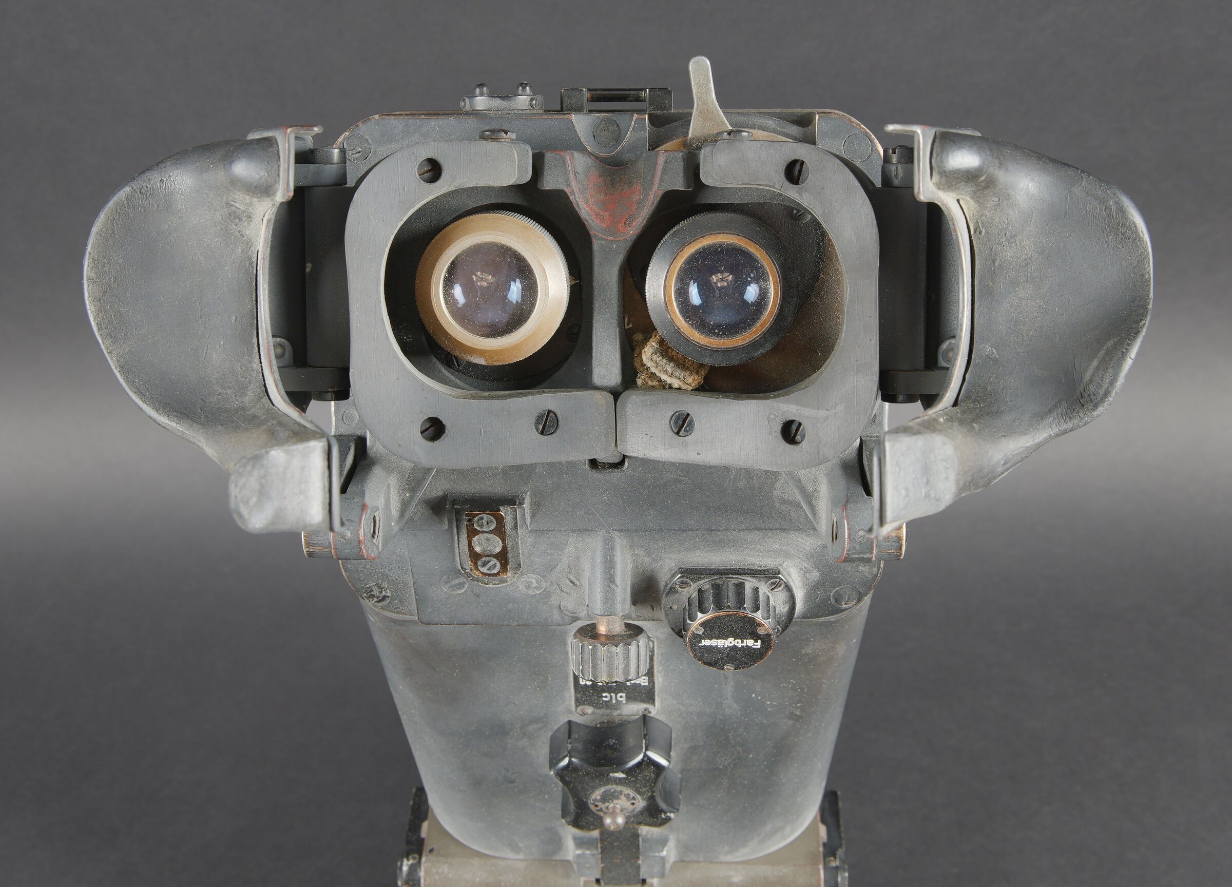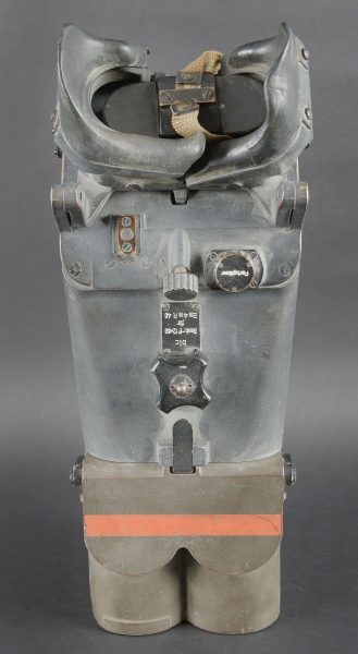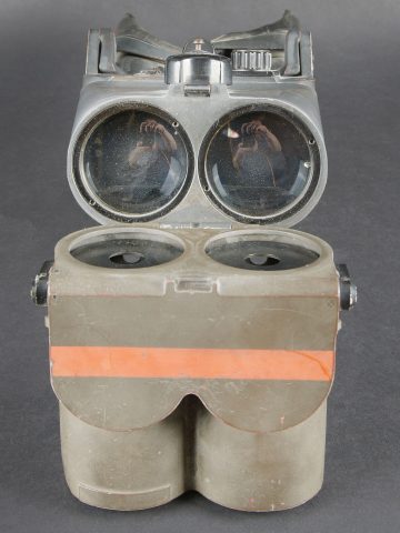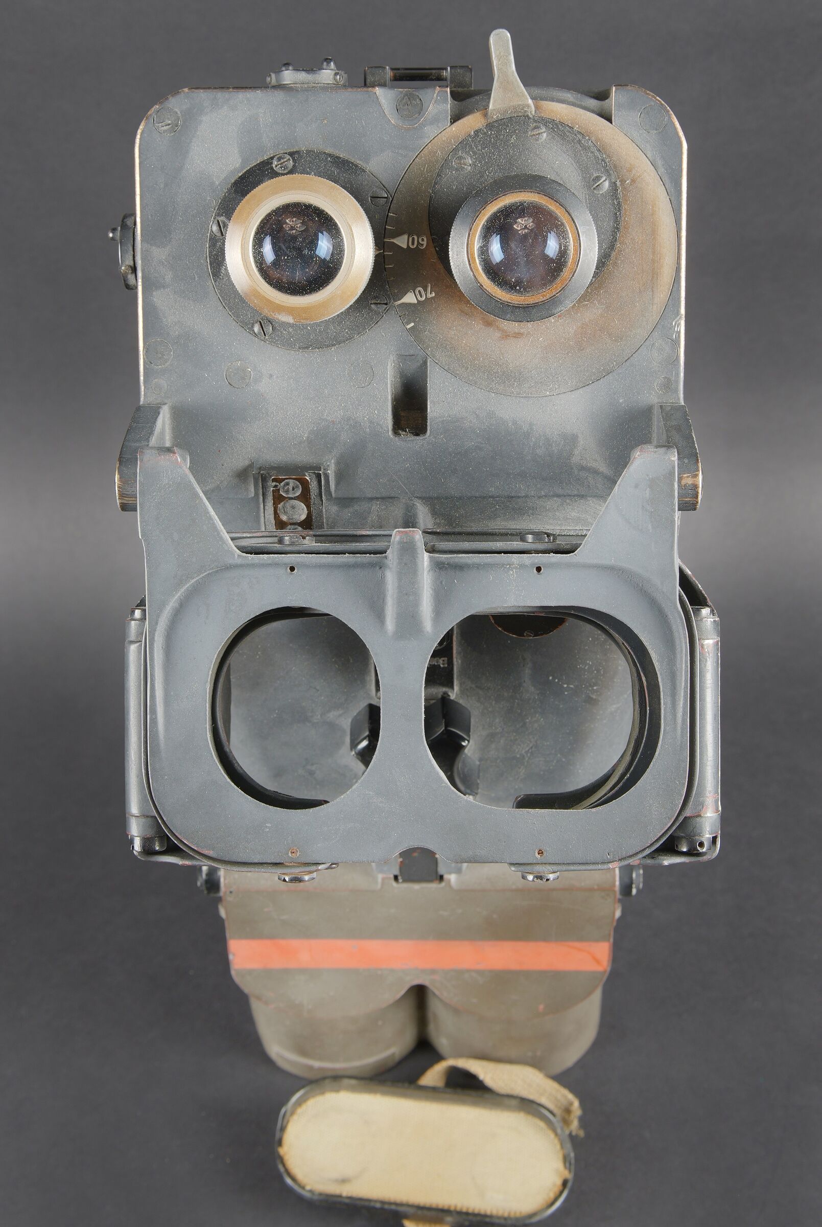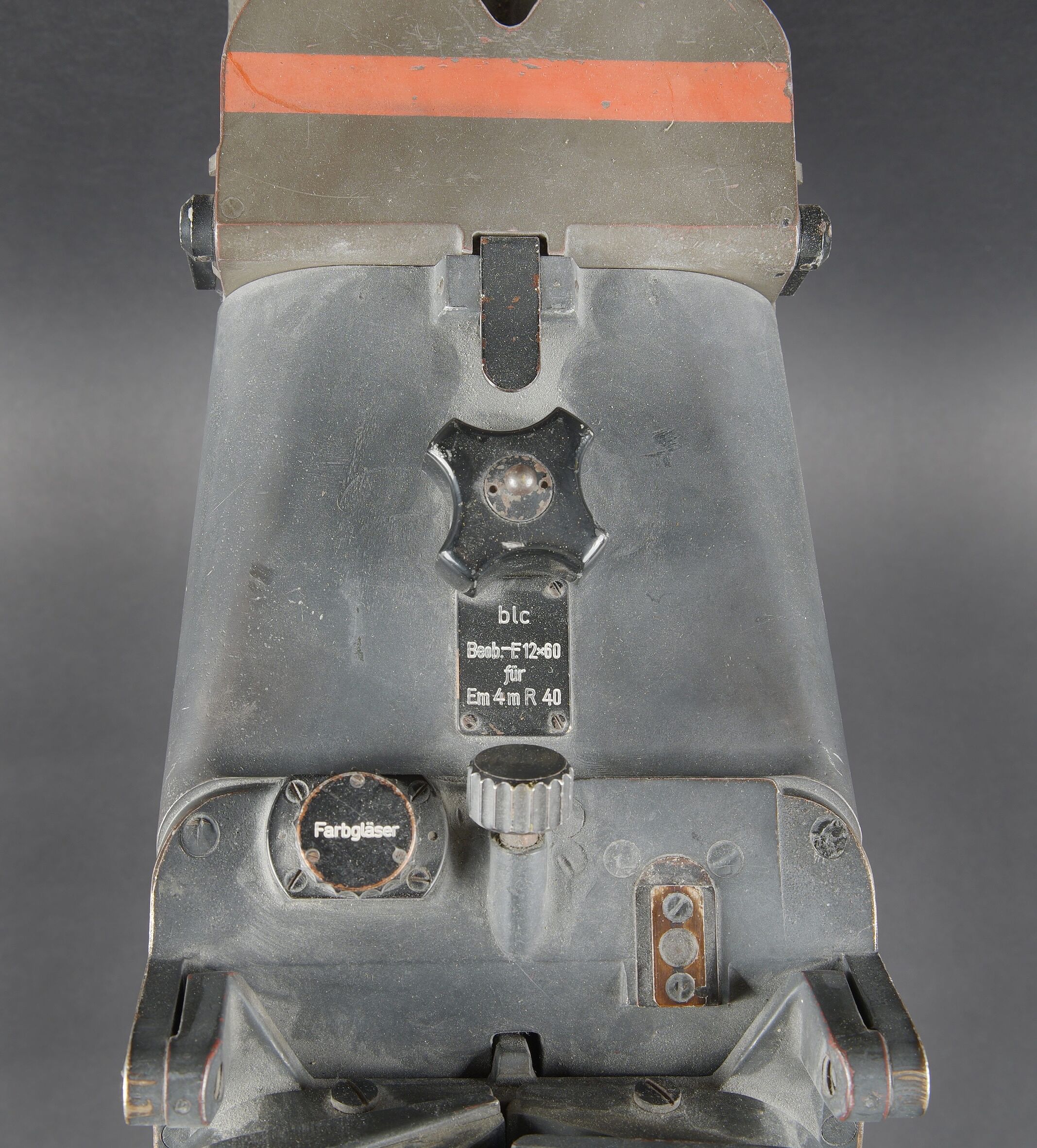 Binoculaire d’observation WH 12 x 60. Ces jumelles ont été utilisées avec le télémètre 4m R40 dans les batteries anti-aérienne lourde. En métal. Peinture Feldgrau d’origine à 80%. Très belle bande rouge faisant le tour des pares soleil. Toutes les pièces mobiles sont fonctionnelles. Plaquettes en bakélite marquée BLC Beob F 12 x 60 für Em 4mR40. Appui tête en caoutchouc noir. Le cache protège optique en bakélite est présent. Les sangles de fixation sont incomplètes. Optique claire et graduée en parfait état. A noter une certaine usure et patine de la pièce. Etat II+. WH 12 × 60 observation binoculars. These binoculars were used in conjunction with the 4 m R40 rangefinder in heavy anti aircraft batteries. All metal construction. Original Feldgrau finish approximately 80 percent remaining. Very fine red band around the sunshades. All moving parts fully operational. Bakelite plates marked blc Beob F 12 × 60 für Em 4mR40. Black rubber headrest present. Bakelite optical cover present. Fixing straps incomplete. Clear graticuled optics in perfect condition. Noticeable overall wear and patina. Condition II+.