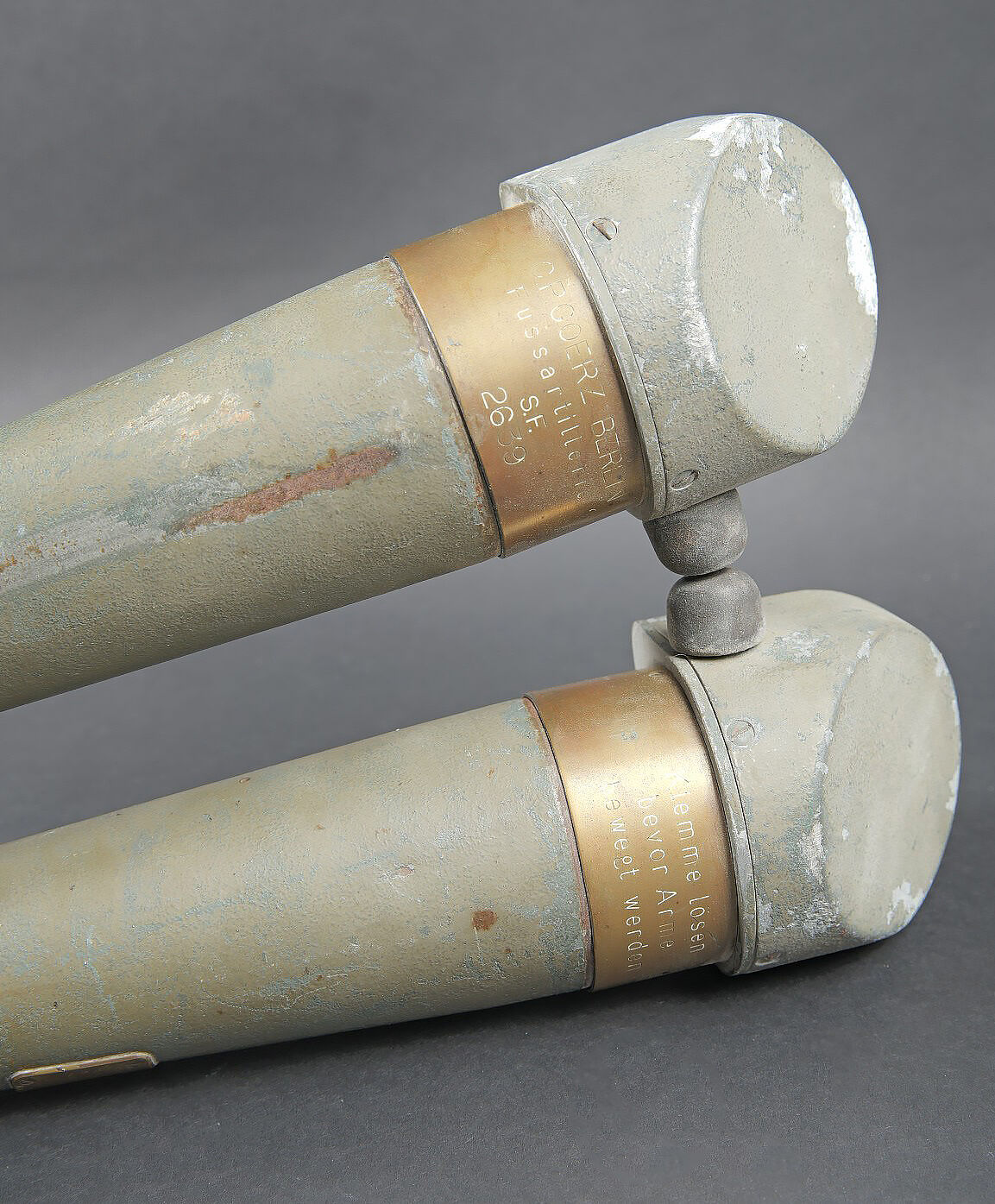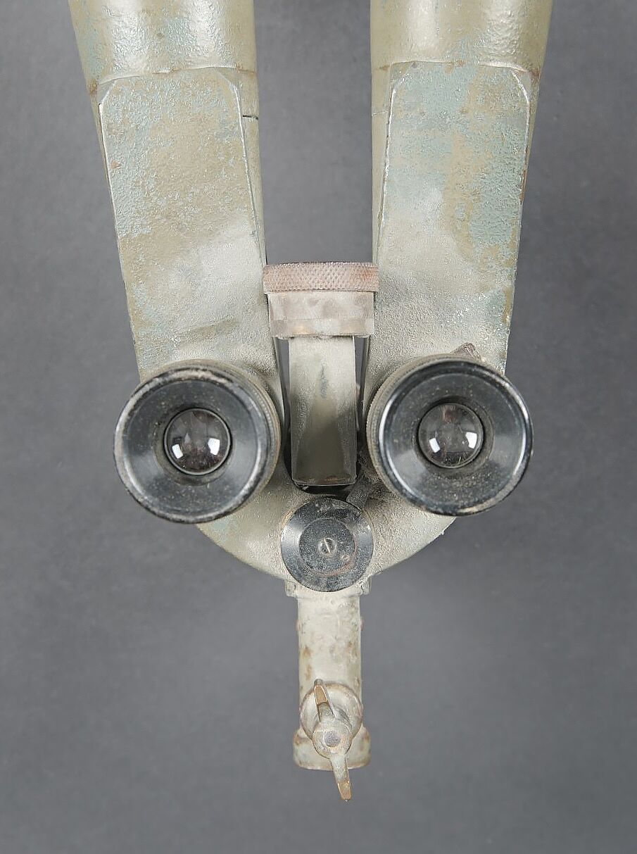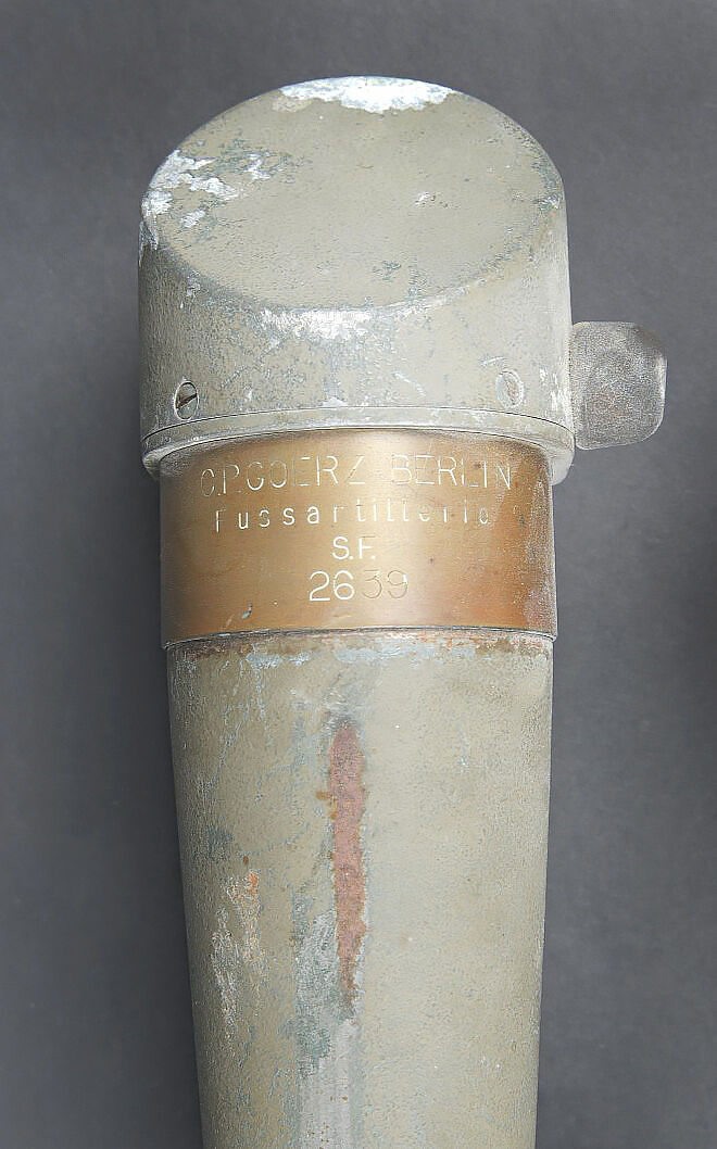 Binoculaire Fussartillerie SF 14. En métal. Peinture grise à 70%. Plaques en laiton marquées CP Goerz Berlin Fussartillerie SF 2639 Kiemme Lösen bevor Arme Br west Werden. Une lentille est fendue. Optique claire et gradué présentant quelques tâches. L’objet a reçu un impact sur le côté et a été réparé par l’ajout d’une plaque en laiton. Toutes les pièces mobiles sont fonctionnelles. A noter une certaine usure et patine de la pièce. Etat II+. Fussartillerie SF 14 binoculars. Metal construction. Grey paint 70% preserved. Brass plates marked “CP Goerz Berlin Fussartillerie SF 2639 Kiemme Lösen bevor Arme Br west Werden.” One lens is cracked. Clear, graduated optics with some spotting. The item has received a side impact and was repaired by the addition of a brass plate. All moving parts are functional. Note some wear and patina to the piece. Condition II+.