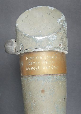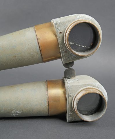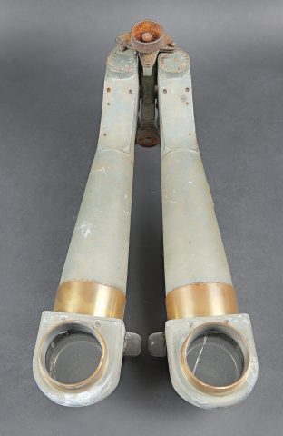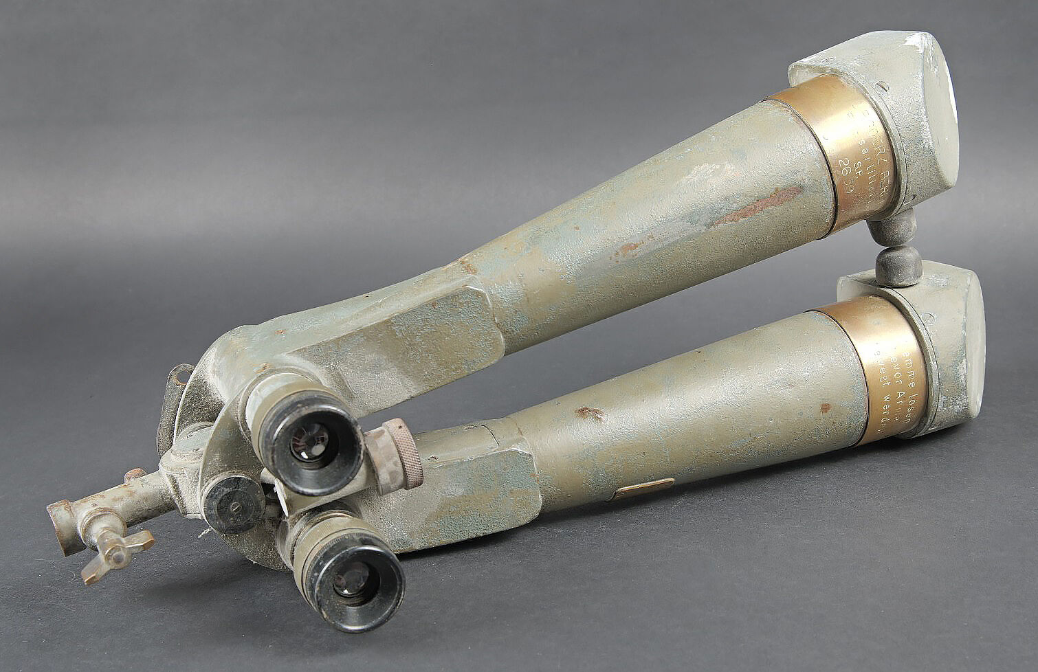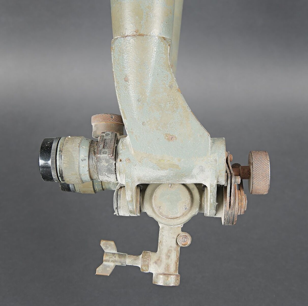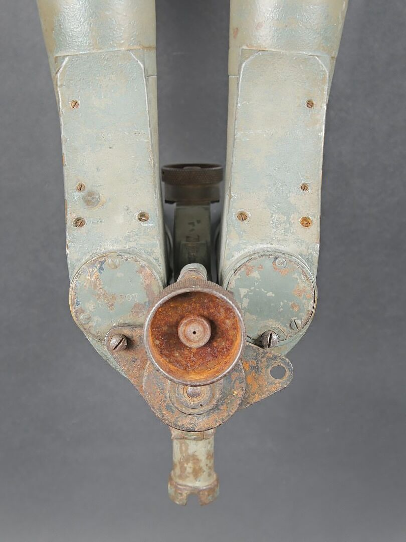 Binoculaire Fussartillerie SF 14. En métal. Peinture grise à 70%. Plaques en laiton marquées CP Goerz Berlin Fussartillerie SF 2639 Kiemme Lösen bevor Arme Br west Werden. Une lentille est fendue. Optique claire et gradué présentant quelques tâches. L’objet a reçu un impact sur le côté et a été réparé par l’ajout d’une plaque en laiton. Toutes les pièces mobiles sont fonctionnelles. A noter une certaine usure et patine de la pièce. Etat II+. Fussartillerie SF 14 binoculars. Metal construction. Grey paint 70% preserved. Brass plates marked “CP Goerz Berlin Fussartillerie SF 2639 Kiemme Lösen bevor Arme Br west Werden.” One lens is cracked. Clear, graduated optics with some spotting. The item has received a side impact and was repaired by the addition of a brass plate. All moving parts are functional. Note some wear and patina to the piece. Condition II+.