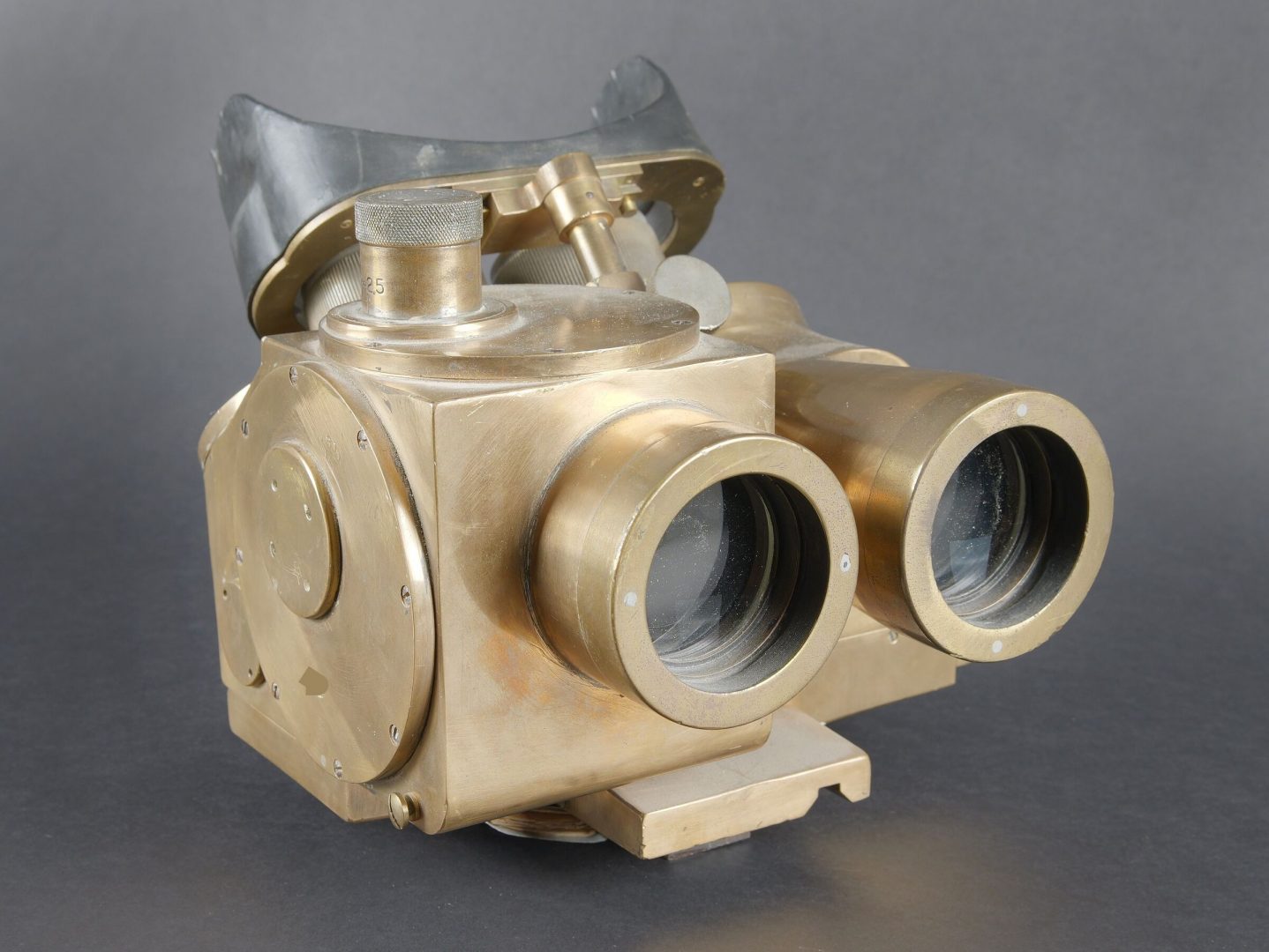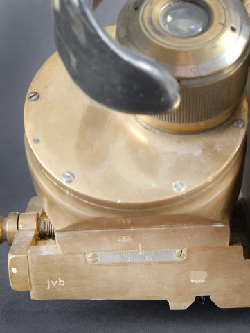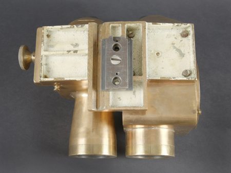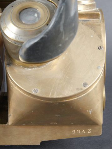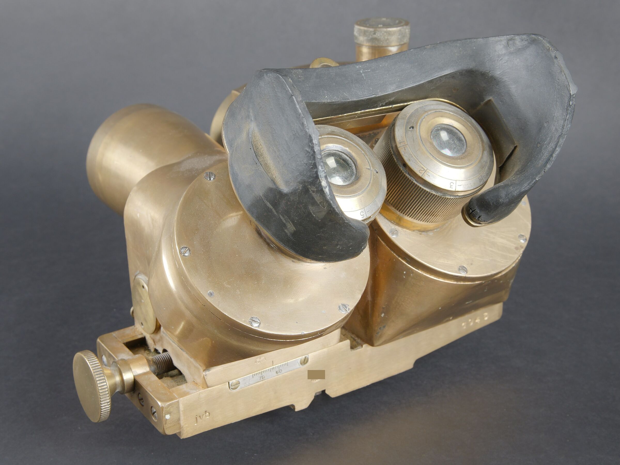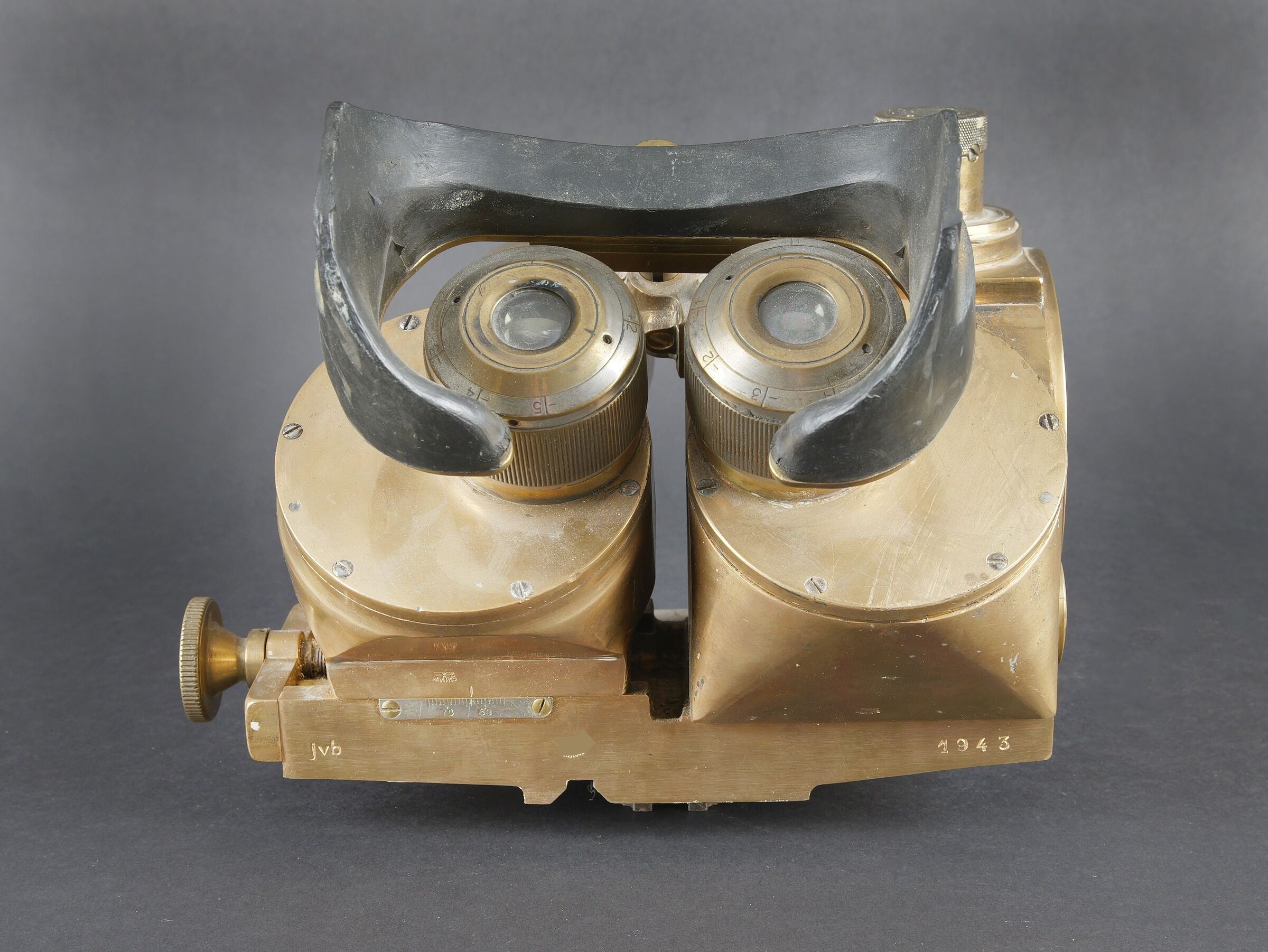 Binoculaire JVB 1943. En laiton. Toutes les pièces mobiles sont fonctionnelles. Fabrication JVB 1943. Beau marquages Waa. Appui tête en caoutchouc complet, mais présentant quelques petits manques sur les bordures. Deux indications de grossissement 2,5 et 8. Optiques graduées en parfait état. A noter une certaine usure et patine de la pièce. Etat II+. JVB binocular viewer, 1943. Brass construction. All moving parts fully operational. Maker marked JVB 1943. Fine Waffenamt acceptance markings. Rubber headrest complete, with minor losses along the edges. Dual magnification settings 2.5× and 8×. Graticuled optics in perfect condition. Noticeable overall wear and patina. Condition II+.