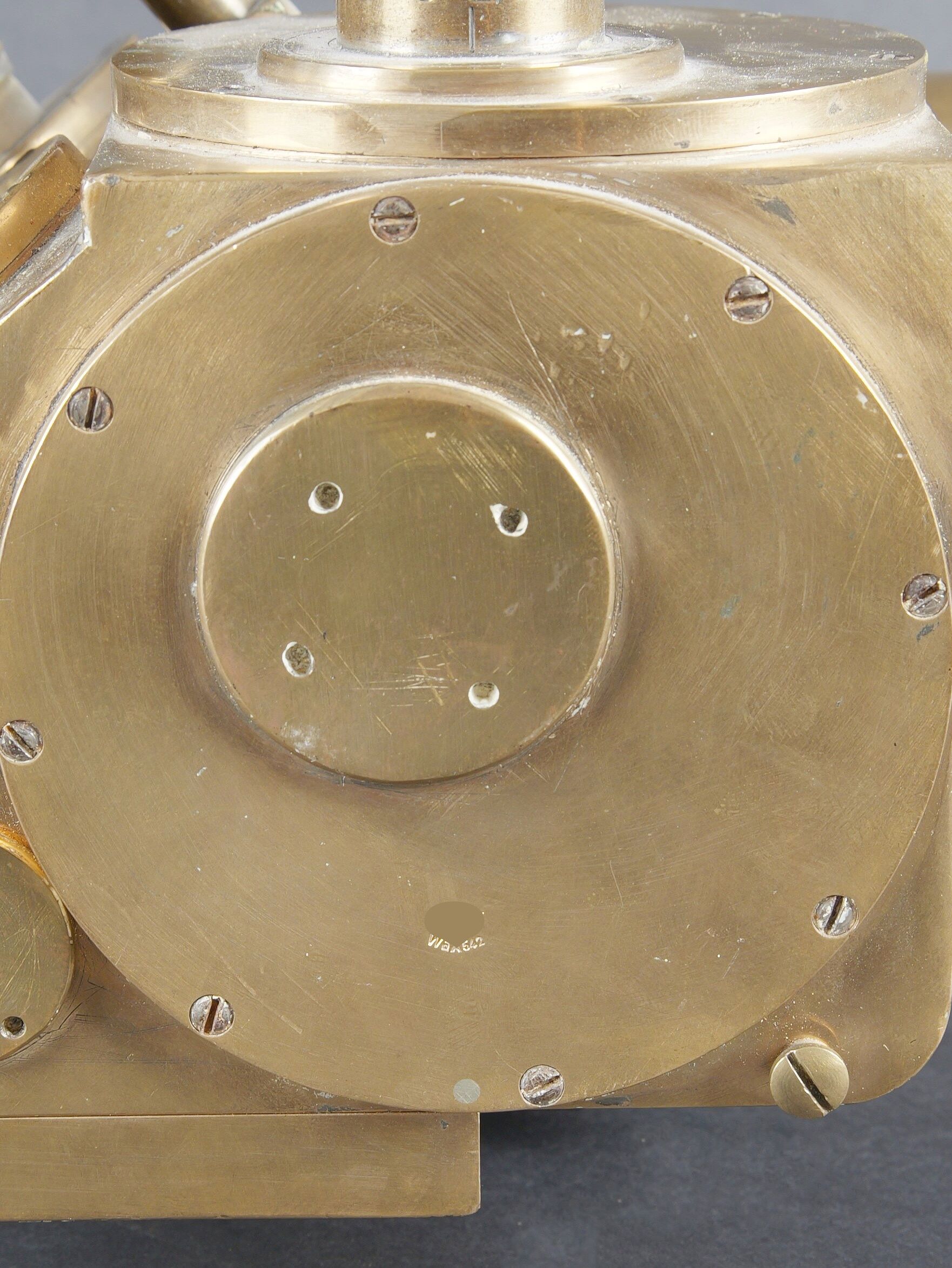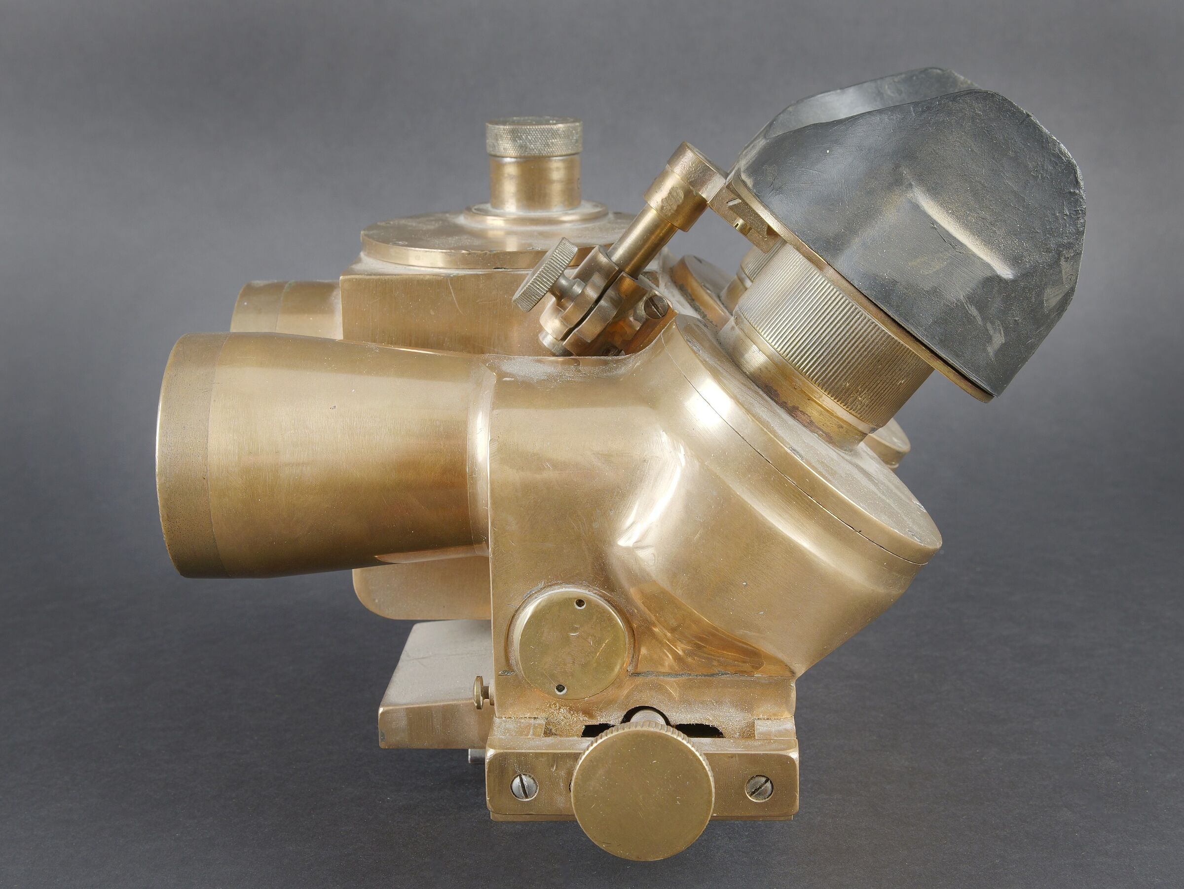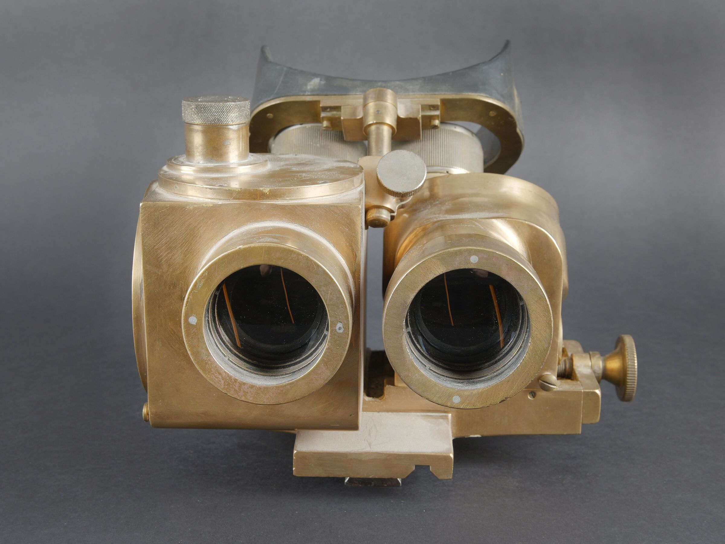 Binoculaire JVB 1943. En laiton. Toutes les pièces mobiles sont fonctionnelles. Fabrication JVB 1943. Beau marquages Waa. Appui tête en caoutchouc complet, mais présentant quelques petits manques sur les bordures. Deux indications de grossissement 2,5 et 8. Optiques graduées en parfait état. A noter une certaine usure et patine de la pièce. Etat II+. JVB binocular viewer, 1943. Brass construction. All moving parts fully operational. Maker marked JVB 1943. Fine Waffenamt acceptance markings. Rubber headrest complete, with minor losses along the edges. Dual magnification settings 2.5× and 8×. Graticuled optics in perfect condition. Noticeable overall wear and patina. Condition II+.