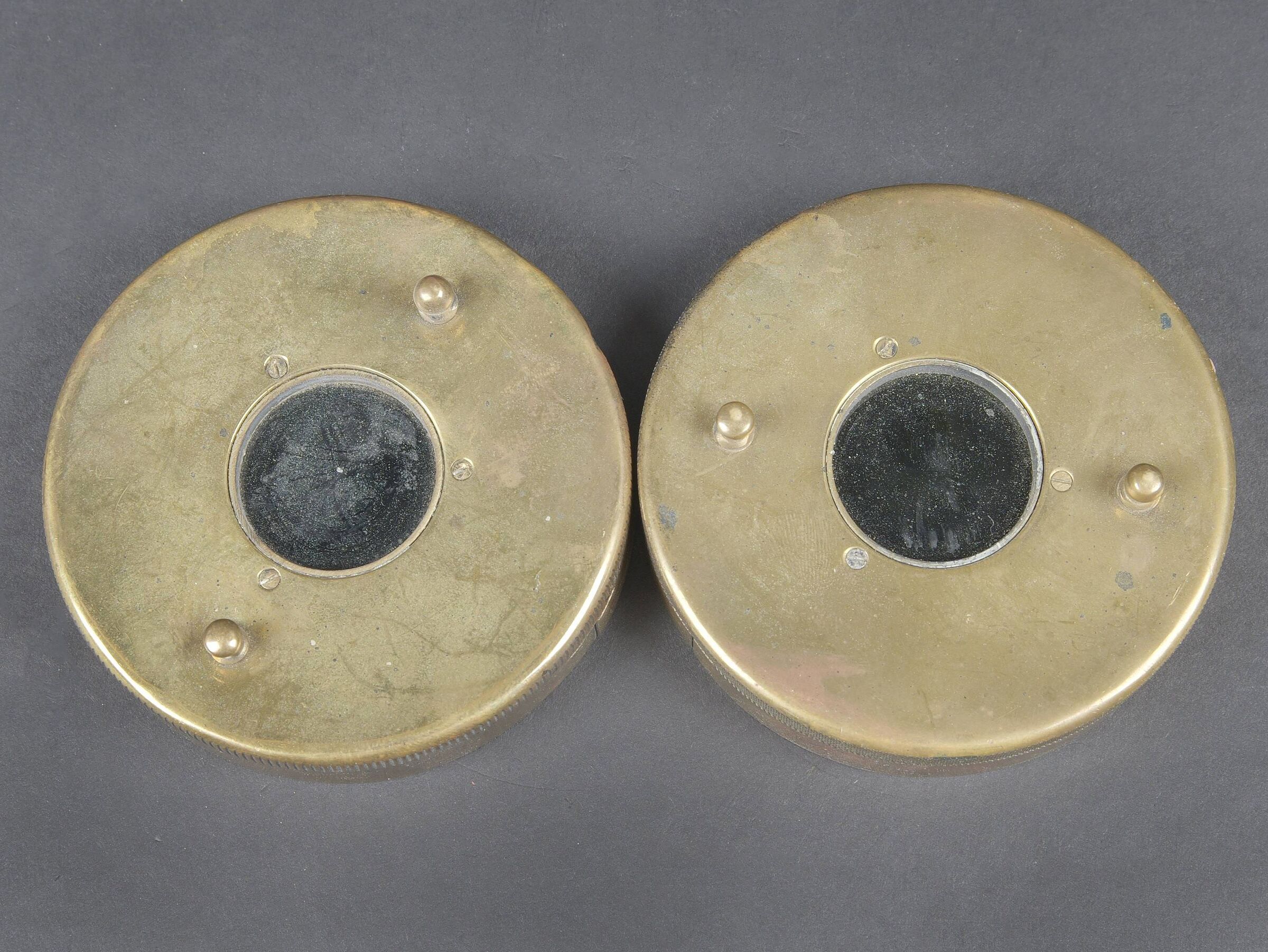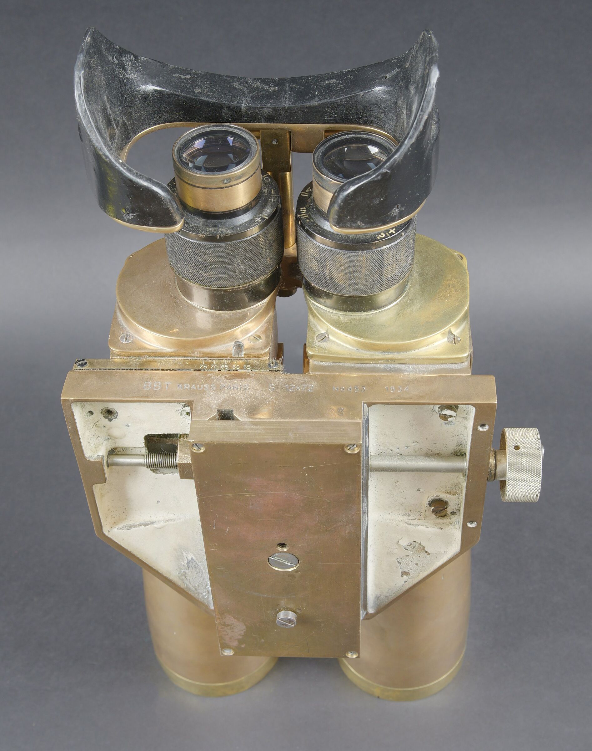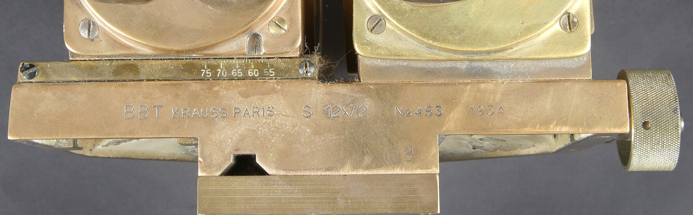 Binoculaire M1934 français. En laiton. Quelques bosses visibles. Toutes les pièces mobiles sont fonctionnelles. Protège front complet, mais présentant quelques marques d’usures. Marquages BBT Krauss Paris S 12×72 N°453 1934. Les caches avec les filtres sont présents. Optiques claires présentant quelques tâches. A noter une certaine usure et patine de la pièce. Etat II+. Elles étaient principalement utilisées par les officiers, sous-officiers et observateurs de l’armée française pour scruter le front, repérer les mouvements ennemis et ajuster les tirs. French M1934 binoculars. Brass construction with a few visible dents. All moving parts functional. Forehead rest complete but showing wear. Marked BBT Krauss Paris S 12 × 72 No. 453 1934. Covers with filters present. Clear optics with a few spots. Noteworthy overall wear and an attractive period patina. Condition II+. Primarily used by officers, NCOs and observers to scan the battlefield, detect enemy movement and adjust fire.