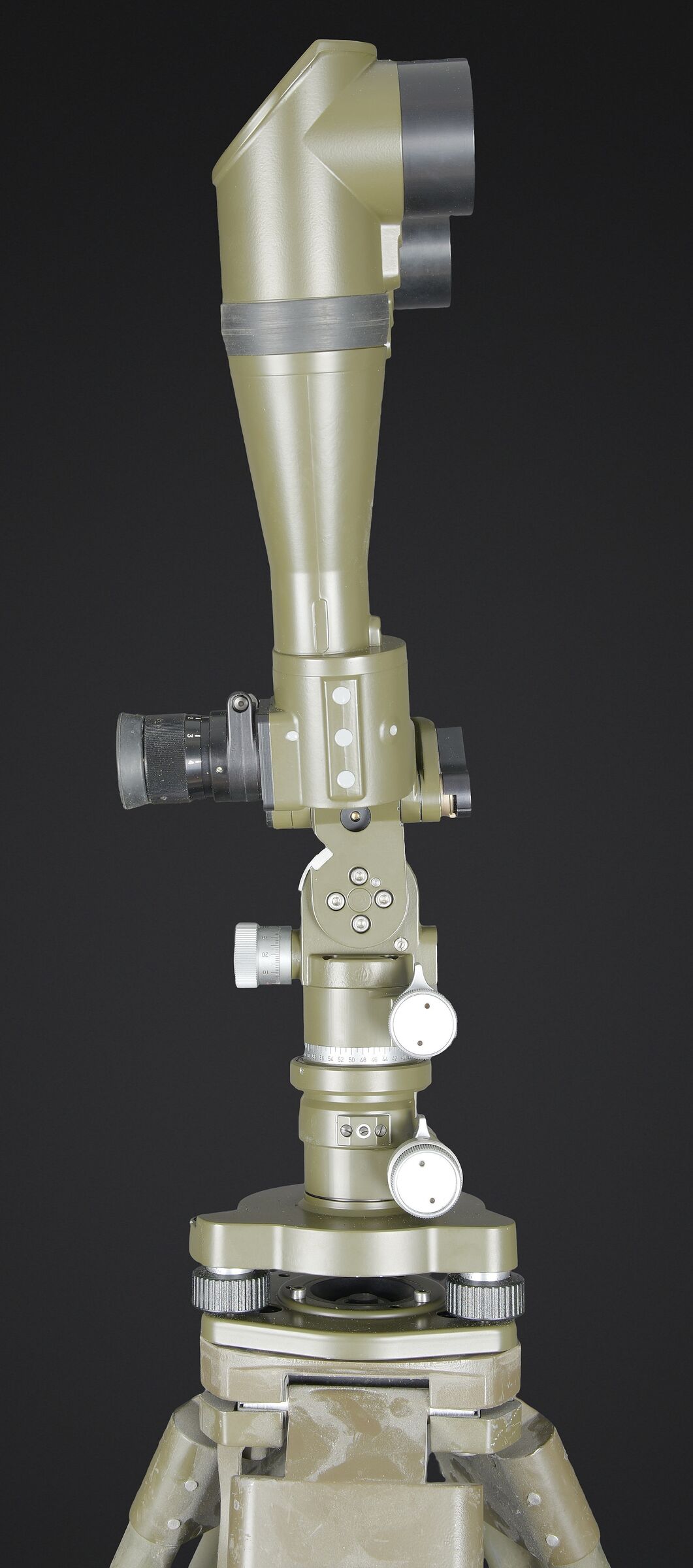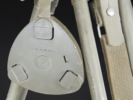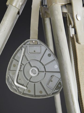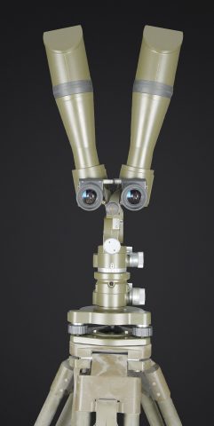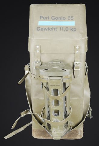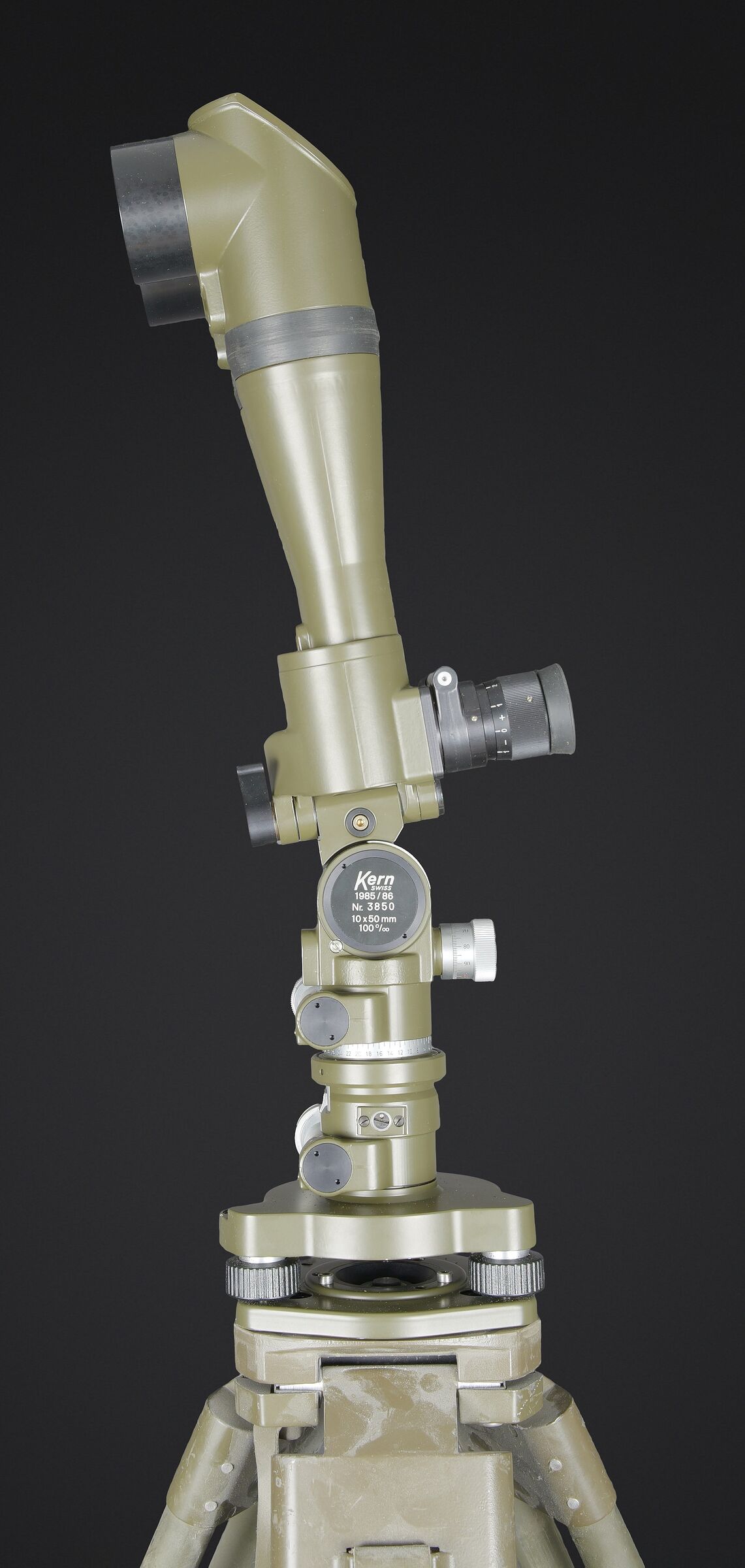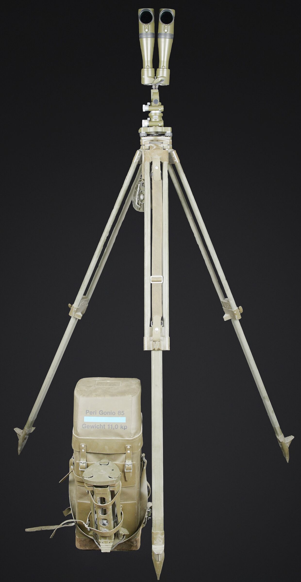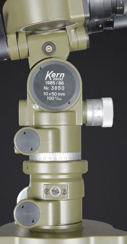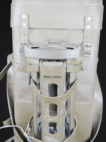 Binoculaire suisse Kern. Housse en toile caoutchouté. Toutes les sangle sont présentes. Couvercle portant le marquage Peri Gonio 85 Gewicht 11KG. Certains accessoires sont manquants. Intérieur doublé en d’une épaisse mousse noir. Certains accessoires sont manquants. Binoculaire complet. Toutes les pièces mobiles sont fonctionnelles. Marquages Kern Suiss 1985/86 Nr 3850 10 x 50 mm. Petit trépied métallique présent et fixé sur la sacoche principale. Grand trépied en aluminium. La sangle de transport est présente. Trois pointes d’ancrage au sol. Marquages Wild. A noter une certaine usure et patine de la pièce. Etat II+. Swiss Kern binoculars Rubberised canvas case with all straps present. Lid marked Peri Gonio 85 Gewicht 11 kg. Interior lined with thick black foam. Some accessories missing. Complete binoculars with all moving parts functional. Marked Kern Swiss 1985/86 Nr 3850 10 × 50. Small metal tripod present and attached to the main carrying case. Large aluminium tripod with carrying strap and three ground anchoring spikes. Marked Wild. Note some wear and patina to the piece. Condition II+.