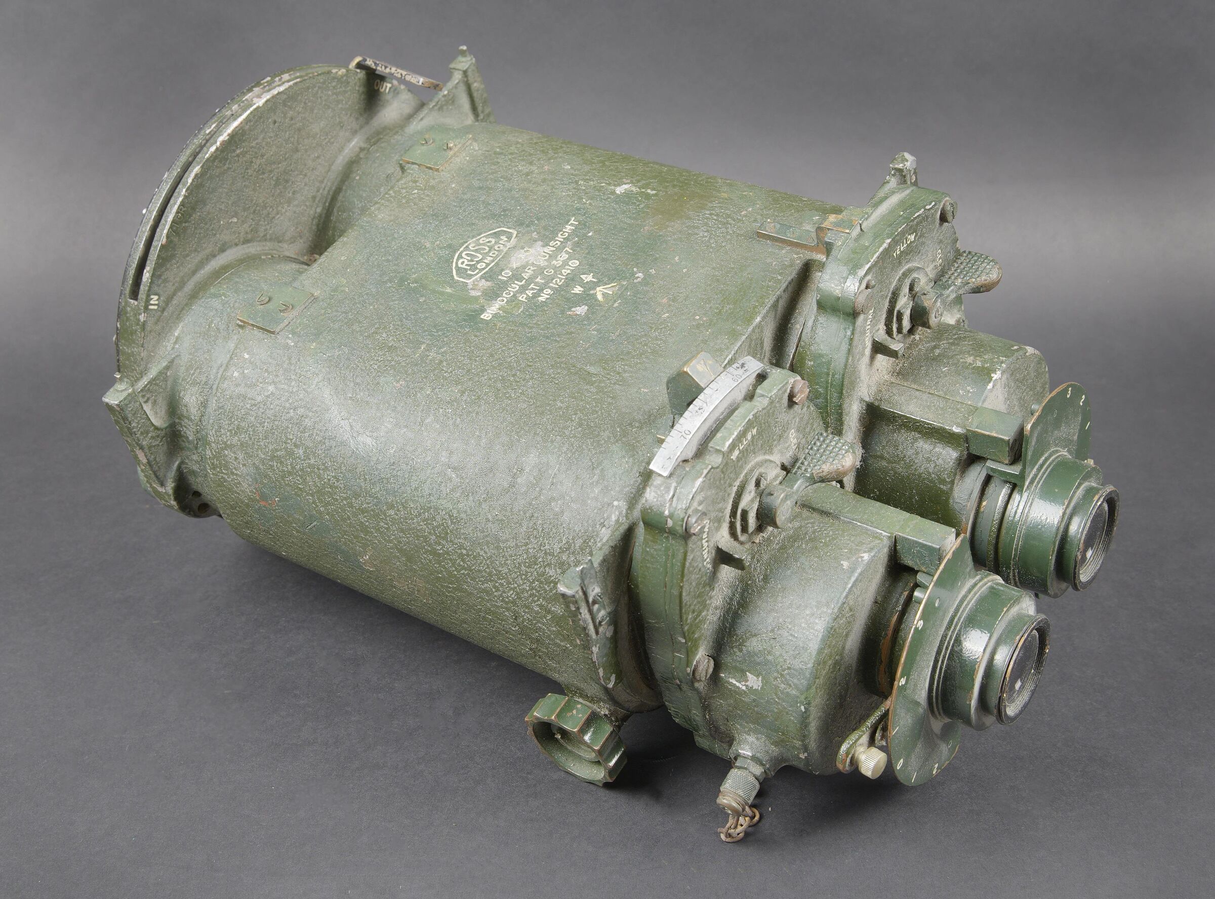 Détails de la vente >Binocular Gunsight 10 x 70 britannique. En métal. Peinture verte à 80%. Marquages ROSS London 10 x 70 Binocular gunsight Partt G367 N121410 WAT avec broad arrow. Toutes les pièces mobiles sont... en savoir plus