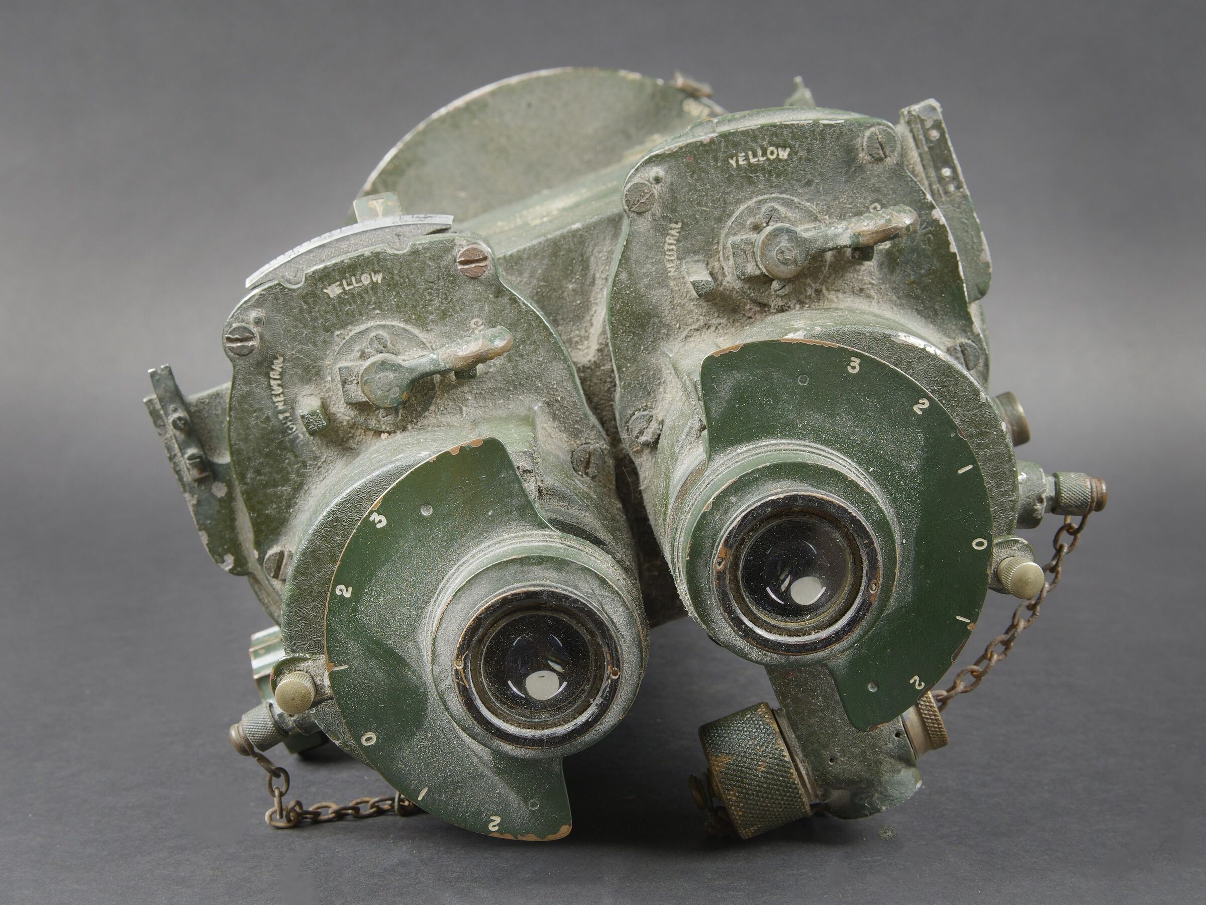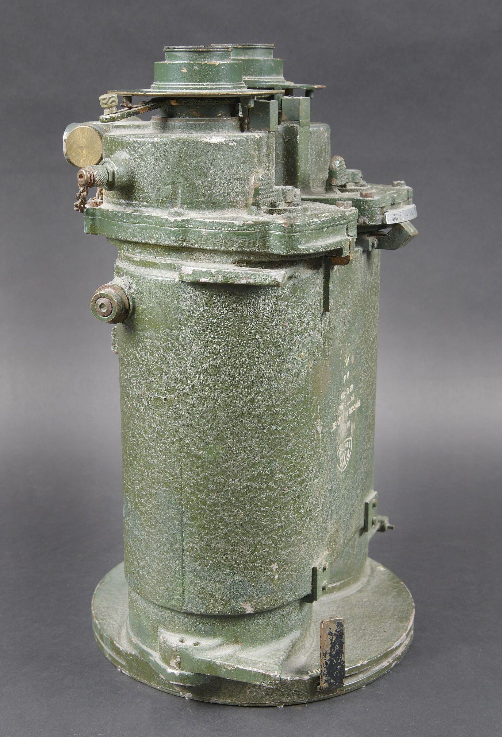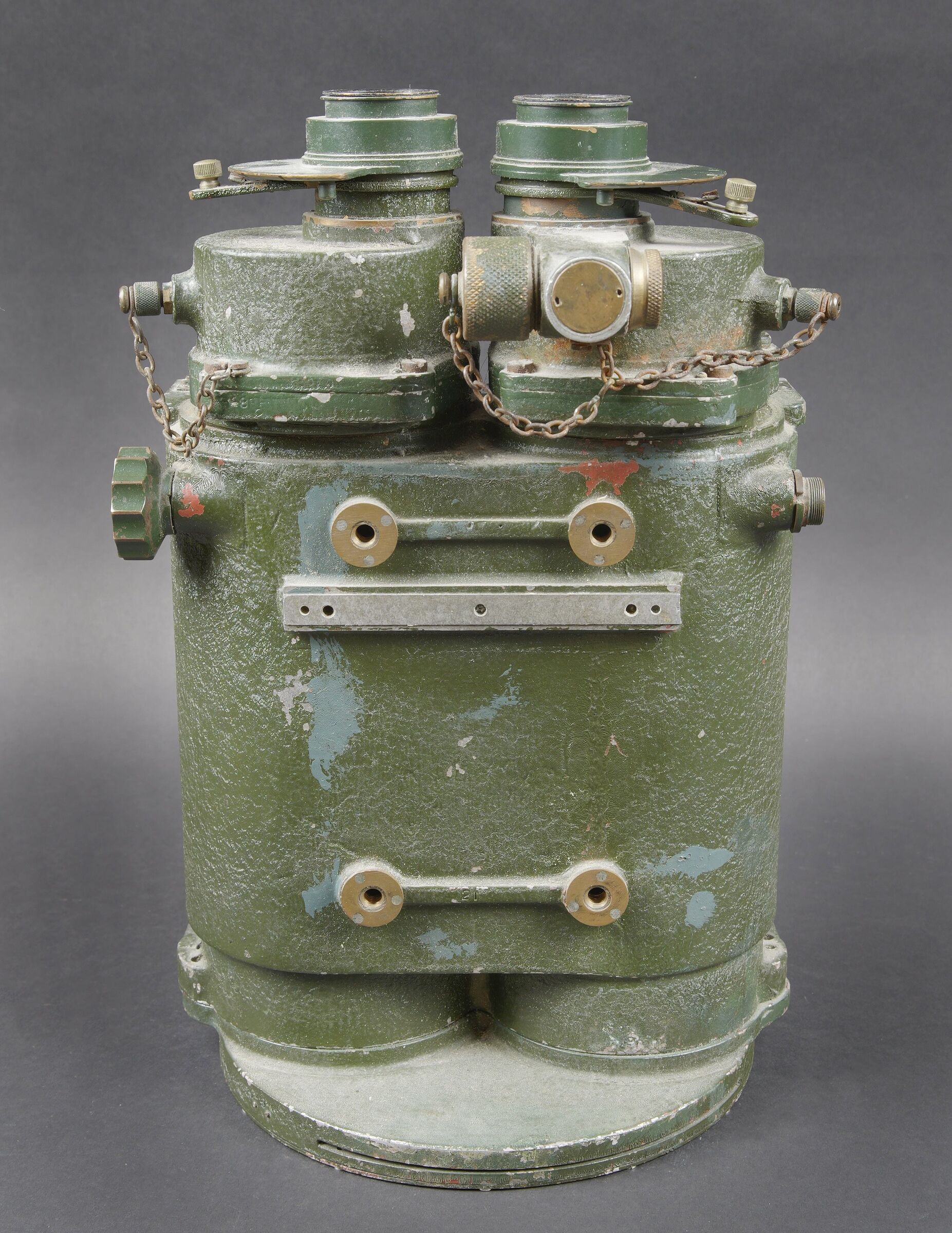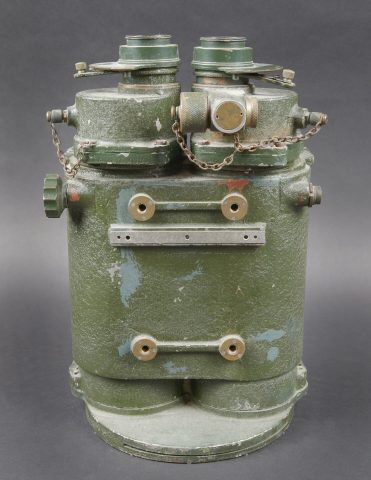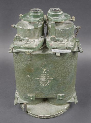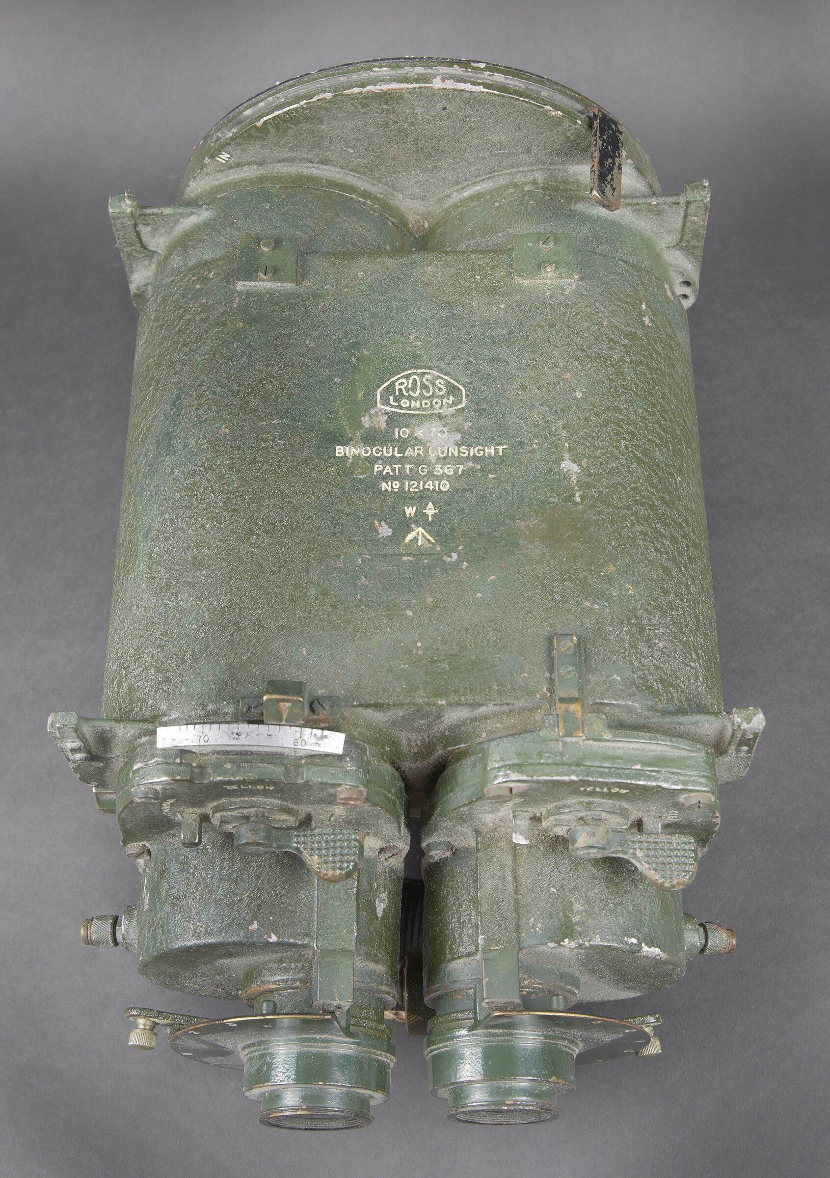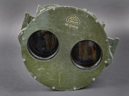 Binocular Gunsight 10 x 70 britannique. En métal. Peinture verte à 80%. Marquages ROSS London 10 x 70 Binocular gunsight Partt G367 N121410 WAT avec broad arrow. Toutes les pièces mobiles sont fonctionnelles. Toutes les chainettes sont présentes. Les filtres sont fonctionnels. Optique claire et graduée présentant quelques tâches. A noter une certaine usure et patine de la pièce. Etat II+. Utilisé sur les navires de guerre britanniques pendant la Seconde Guerre mondiale. British Binocular Gunsight 10 × 70. Metal body retaining approximately 80% of its green paint. Marked ROSS London 10 × 70 Binocular Gunsight Patt. G367 No. 121410 WAT with Broad Arrow. All moving parts are in working order. All retaining chains are present and the filters are functional. Clear graduated optics showing a few spots. Noteworthy overall wear and an attractive period patina. Condition II+. Used aboard British warships during the Second World War.
