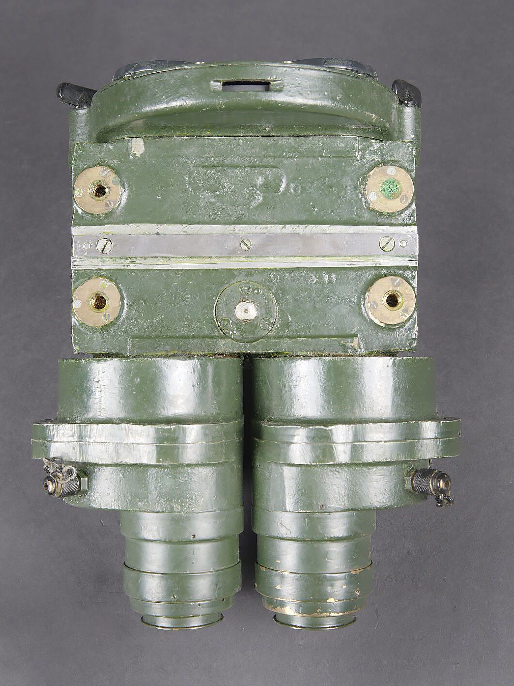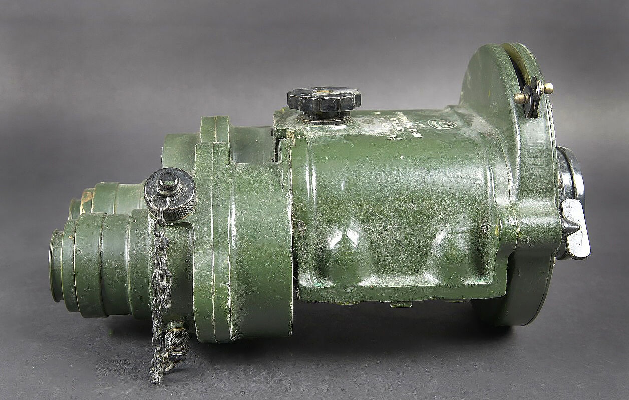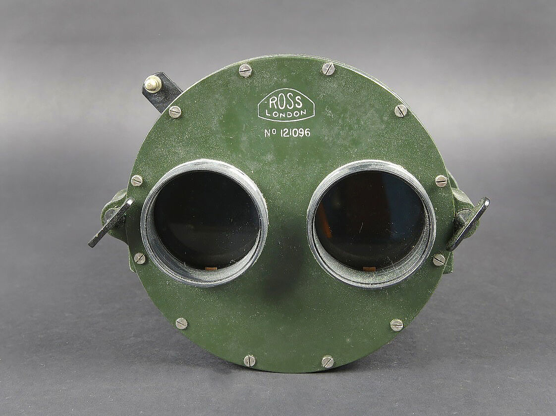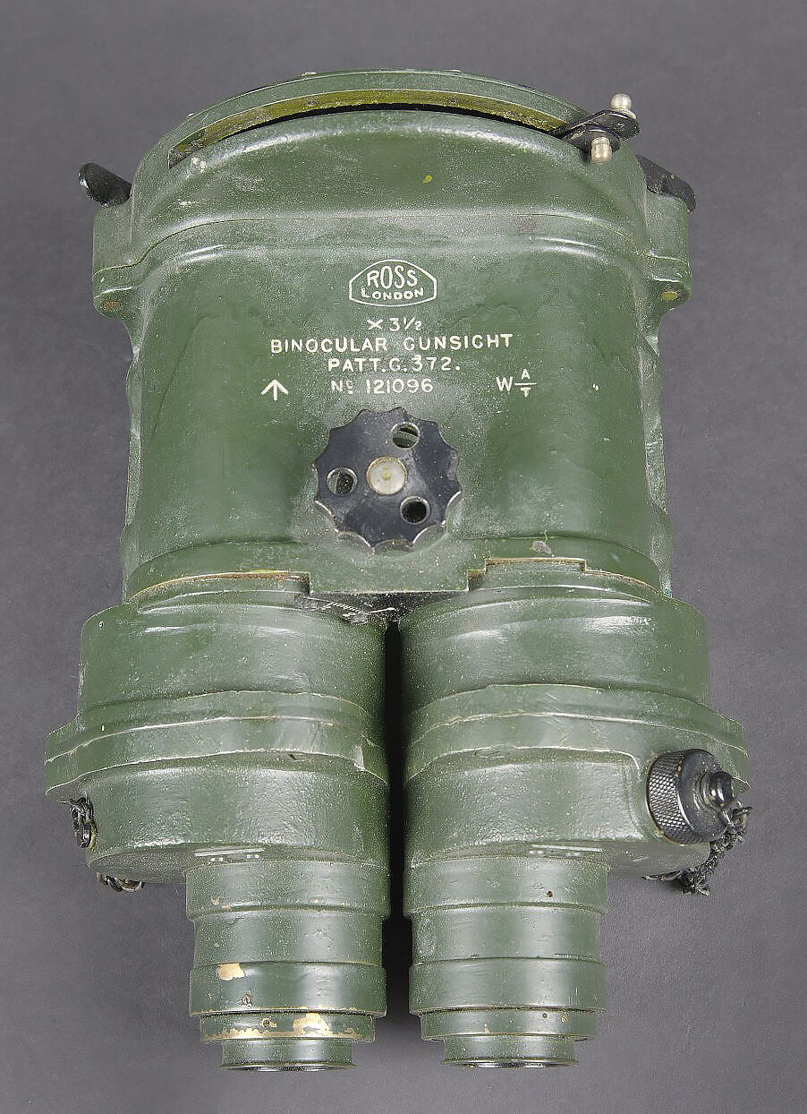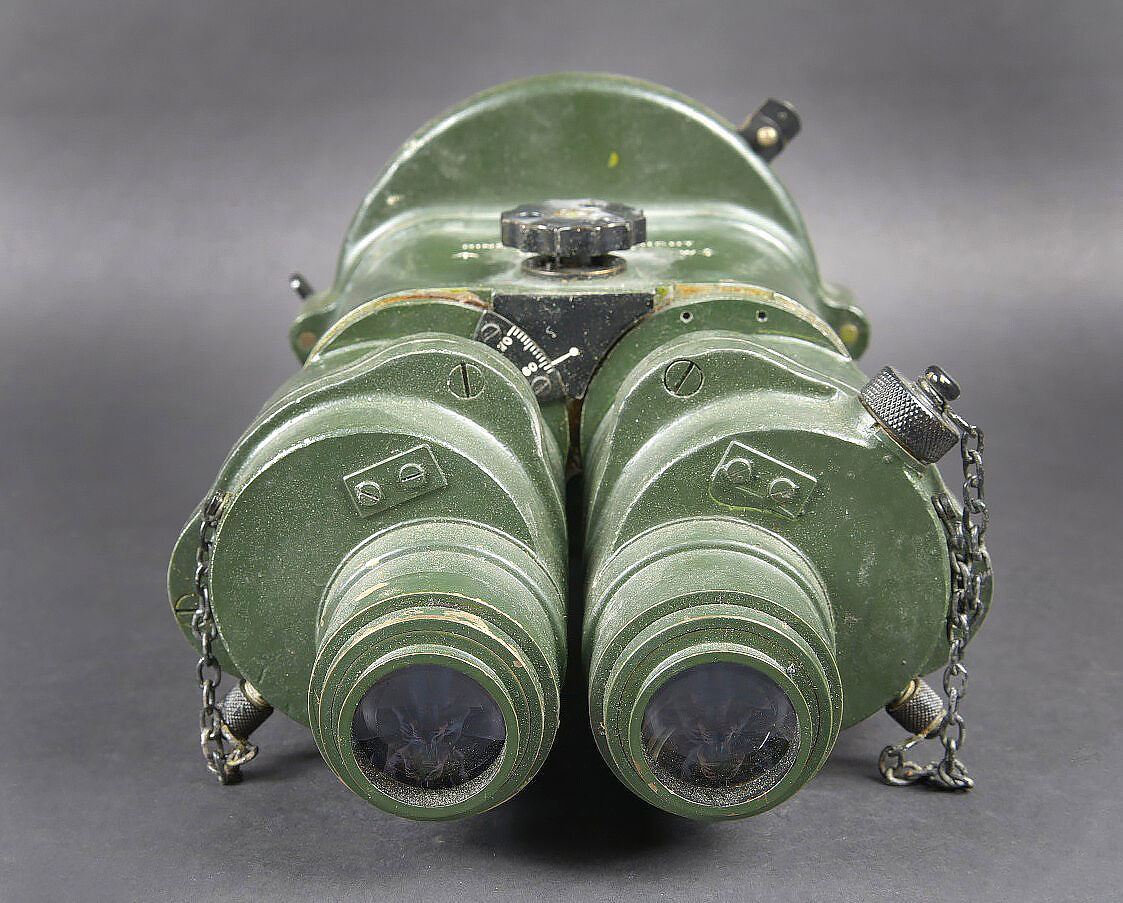 Binocular Gunsight X3 1/2 britannique. Très belle boite en bois, présentant quelques marques d’usures. Le côté du couvercle porte le numéro 121096. Les crochets de fermeture sont fonctionnels. Couvercle marqué Binocular Sight Patt G 372 F Ross London avec broad Arrow. La clé de fermeture de la boite est présente. les cales interne sont présentes et recouvertes d’un tissu vert foncé. Optique en métal, couleur vert foncé. Fabrication Ross London. marqué X 3 1/2 Binocular Gunsight Patt G372 N 121096 WAT. Broad Arrow présent. Les chaînette sont présentes. Toutes les pièces mobiles sont fonctionnelles. Les filtres sont fonctionnels. Optique claire et graduée en excellent état. La sangle de fermeture en cuir pour la caisse est manquante, ainsi que le protège front en mousse. Pendant la Seconde Guerre mondiale, les viseurs binoculaires G372 produits par Ross de Londres ont été utilisés par diverses forces militaires. Ces jumelles étaient principalement utilisées sur des pièces d’artillerie, des canons anti-aériens et d’autres systèmes d’armes pour fournir des capacités de ciblage et de visée précis. Les G372 étaient connus pour leur optique et leur précision de haute qualité. Ils comportaient généralement un système de portée de grossissement et de réticule qui permettait aux artilleurs de suivre et d’engager avec précision des cibles à différentes distances. A noter une certaine usure et patine de la pièce. Etat II+. British Binocular Gunsight X3½. Very fine wooden transit case showing minor signs of wear, the side of the lid bearing the number 121096. The closing latches remain fully functional. Lid stencilled Binocular Sight Patt. G 372 F Ross London with the Broad Arrow. The case locking key is present. The internal spacer blocks survive and are covered in dark green cloth. The optical unit in metal with a dark green finish is of Ross, London manufacture and marked X3½ Binocular Gunsight Patt. G372 N°121096 WAT with Broad Arrow. The retaining chains are present. All moving parts function correctly and the filters remain operational. The optics are clear with sharply defined graduations and in excellent condition. The leather closing strap for the case is missing, as is the foam forehead rest. During the Second World War the G372 binocular sights produced by Ross of London were employed by various military forces, primarily on artillery pieces, anti-aircraft guns and other weapon systems, providing precise aiming and target-tracking capabilities. Renowned for the high quality of their optics and accuracy, they generally feature a magnification and reticle system allowing gunners to engage targets at varying ranges with great precision. Overall showing honest service wear and an attractive period patina. Condition II+.