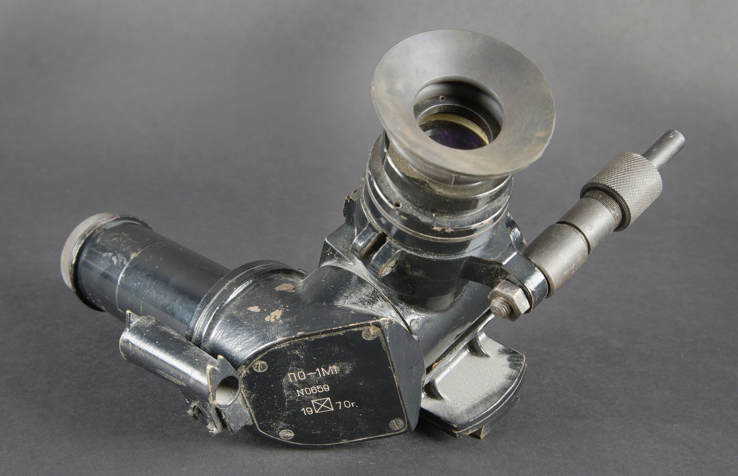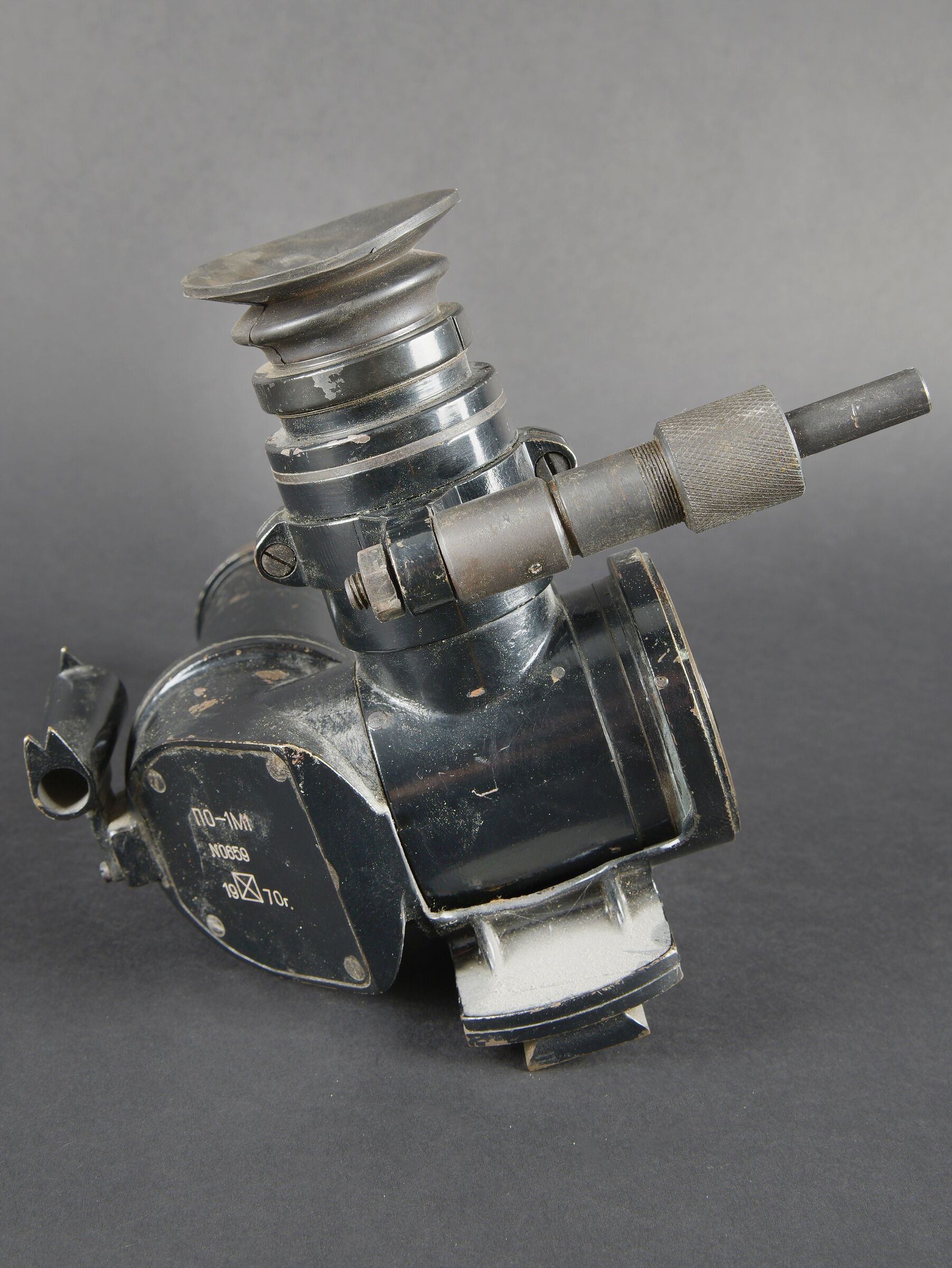 Détails de la vente >Binocular prismatic. Marquages en lettrages cyrilliques. Numéro N0659, daté 1970. En métal, peinture noire à 80%. Bonnette en caoutchouc complète. Toutes les pièces mobiles sont... en savoir plus