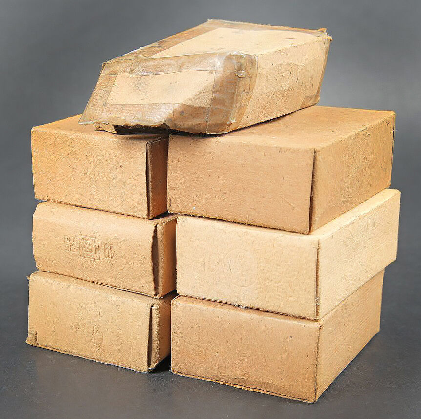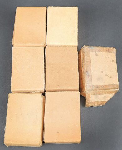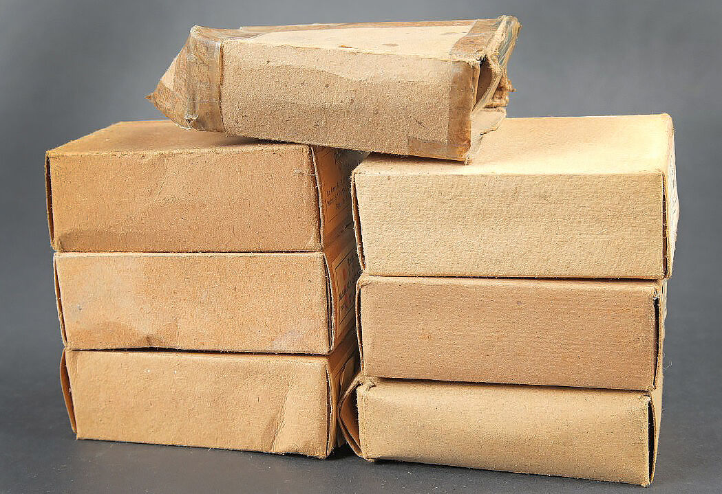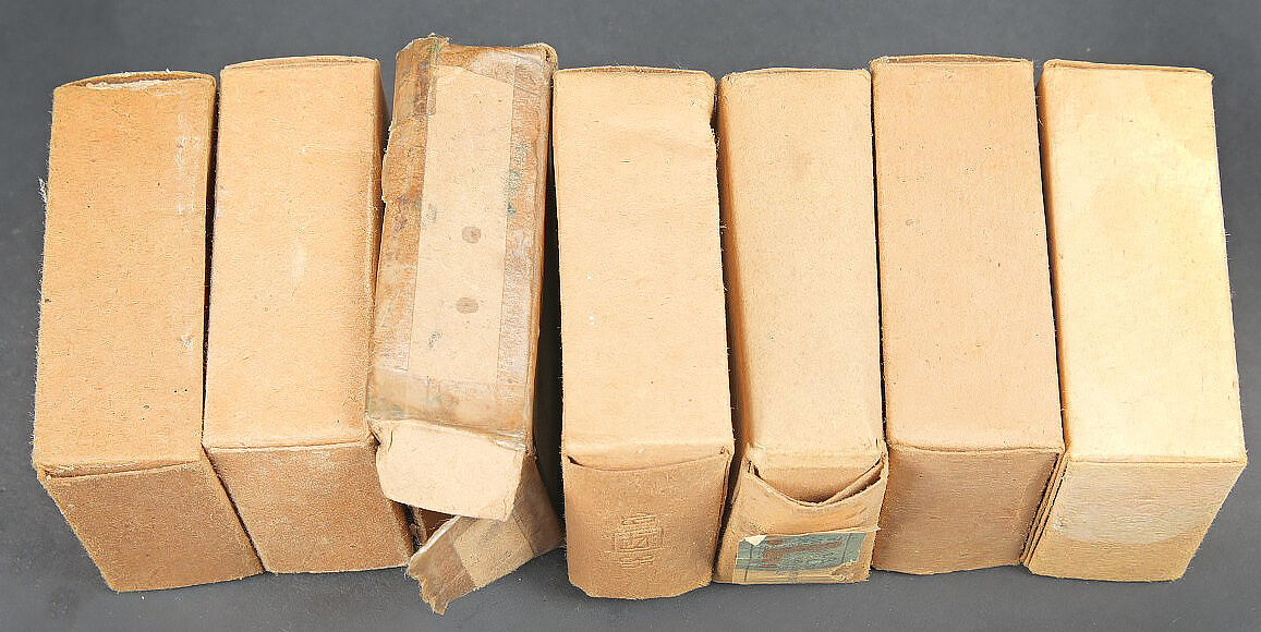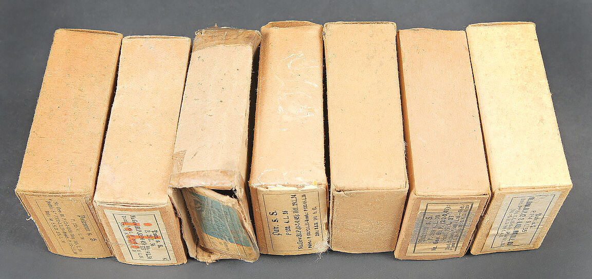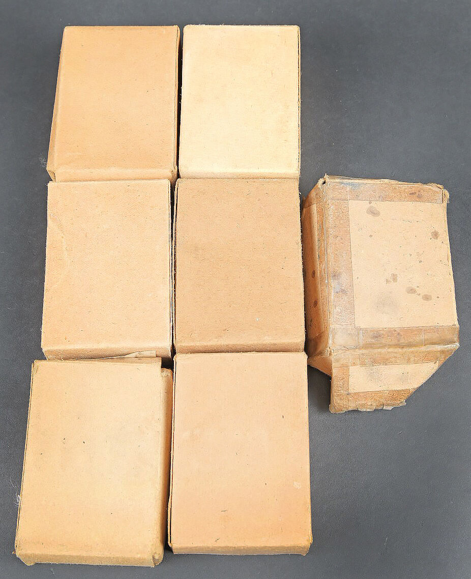 Boites pour cartouches de Mauser. Vides. Comprenant une boite en carton ouverte, étiquette marquée Patronen SS P 369 4 L 39. Une boite en carton, ouverte, étiquette marquée Patr SS P 154 9 L 35. Une boite en carton, ouverte, étiquette marquée Patronen SS P 132-4 L39. Une boite en carton ouverte, étiquette marquée Patr SS P132 4L35. Une boite en carton, ouverte, étiquette marquée Patr SS P25 L 36. Une boite en carton ouverte, étiquette marquée Patr SSK P181 7 1 40, nombreuses réparations au scotch. Une boite en carton ouverte, étiquette marquée Patr SS P181 11 L39. A noter une certaine usure et patine des pièces. Etat II+. Mauser cartridge boxes. Empty. Set consisting of several opened cardboard boxes with labels: Patronen SS P 369 4 L 39; Patr SS P 154 9 L 35; Patronen SS P 132-4 L 39; Patr SS P132 4 L 35; Patr SS P25 L 36; Patr SSK P181 7 1 40 (repaired with tape); Patr SS P181 11 L 39. Notable wear and patina. Condition II+.
