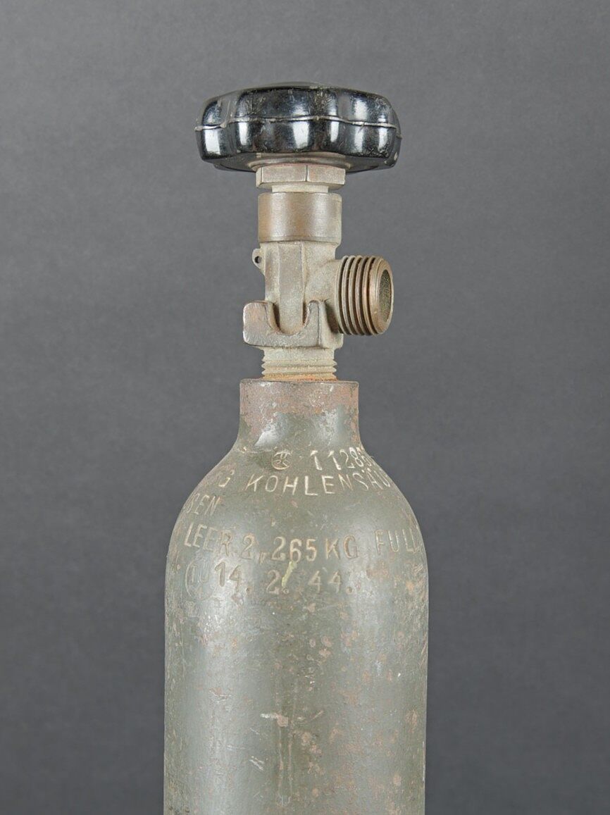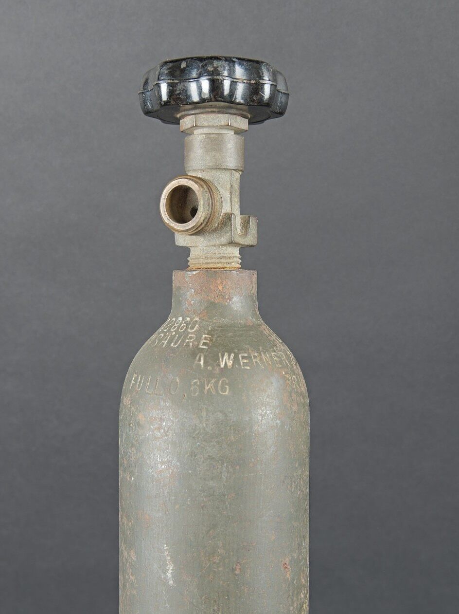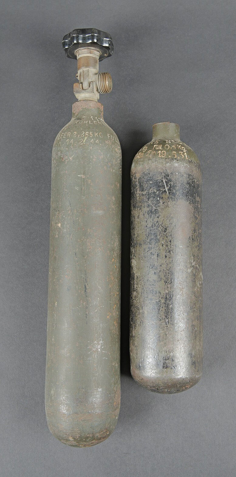Bouteilles d’oxygènes LW. Comprenant une bouteille d’un petit modèle en métal. Peinture à 40%. Partie supérieure absente. Marquages Kohlensäure N 25 Gev 1,9 kg füll 0,5 19 6 31. Reste de marquages illisibles sur le côté de la bouteille. Bouteille d’oxygène en métal, peinture Feldgrau à 70%, la vanne de fermeture est présente. Datée du 14 février 1944. A noter une certaine usure et oxydation de la pièce. Etat II+. Luftwaffe oxygen cylinders. One small metal bottle, upper part missing, partial markings Kohlensäure N 25 etc. One oxygen cylinder in feldgrau paint at 70%, valve present, dated 14 February 1944. Showing wear and oxidation. Condition II+.