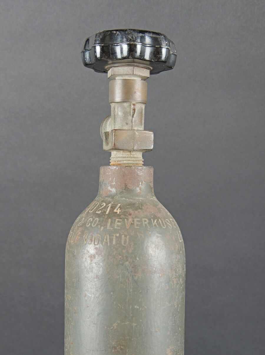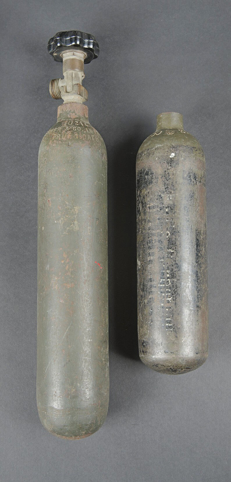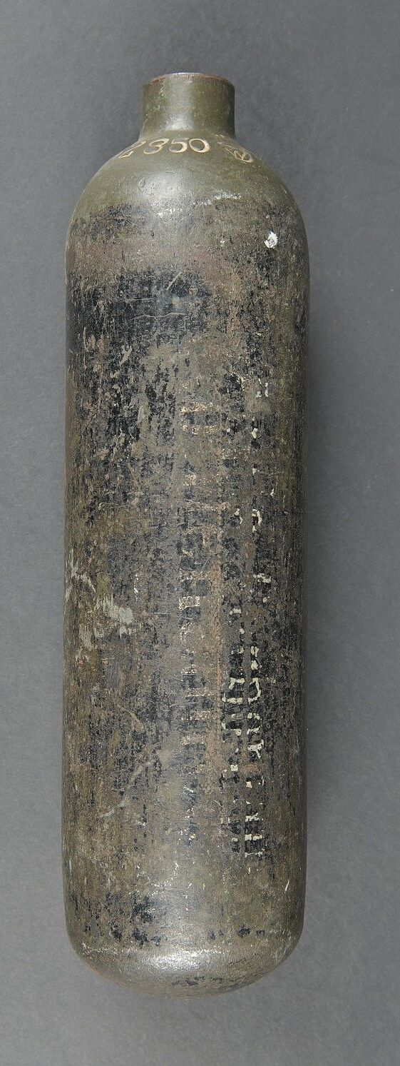 Bouteilles d’oxygènes LW. Comprenant une bouteille d’un petit modèle en métal. Peinture à 40%. Partie supérieure absente. Marquages Kohlensäure N 25 Gev 1,9 kg füll 0,5 19 6 31. Reste de marquages illisibles sur le côté de la bouteille. Bouteille d’oxygène en métal, peinture Feldgrau à 70%, la vanne de fermeture est présente. Datée du 14 février 1944. A noter une certaine usure et oxydation de la pièce. Etat II+. Luftwaffe oxygen cylinders. One small metal bottle, upper part missing, partial markings Kohlensäure N 25 etc. One oxygen cylinder in feldgrau paint at 70%, valve present, dated 14 February 1944. Showing wear and oxidation. Condition II+.