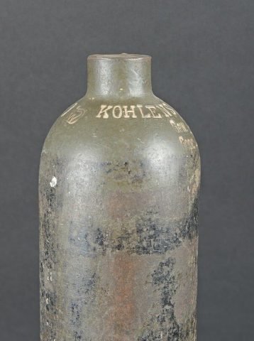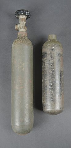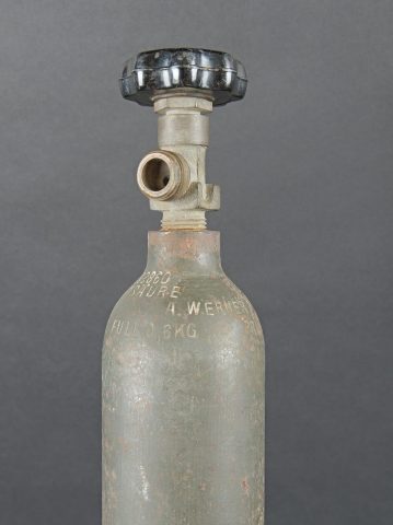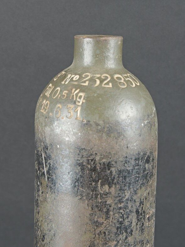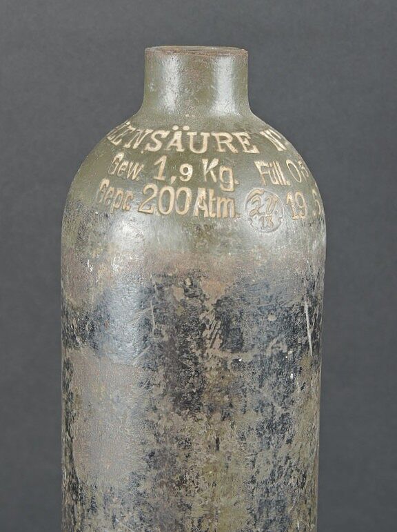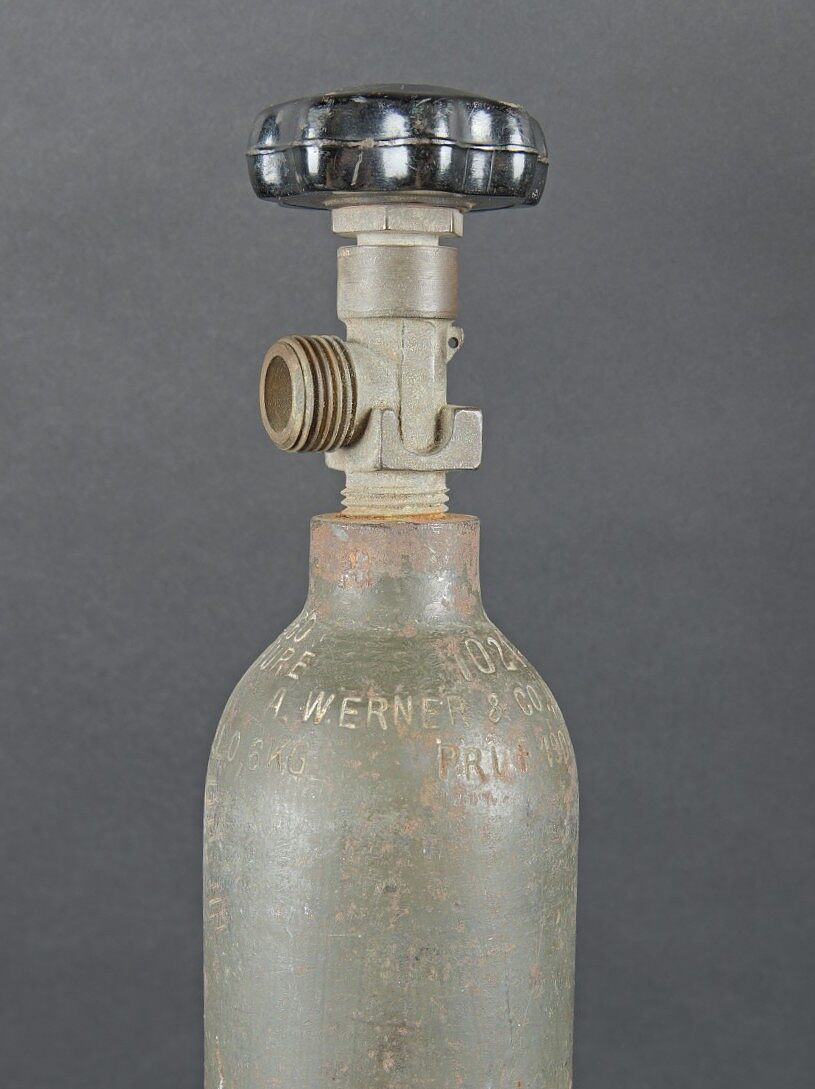 Bouteilles d’oxygènes LW. Comprenant une bouteille d’un petit modèle en métal. Peinture à 40%. Partie supérieure absente. Marquages Kohlensäure N 25 Gev 1,9 kg füll 0,5 19 6 31.... en savoir plus