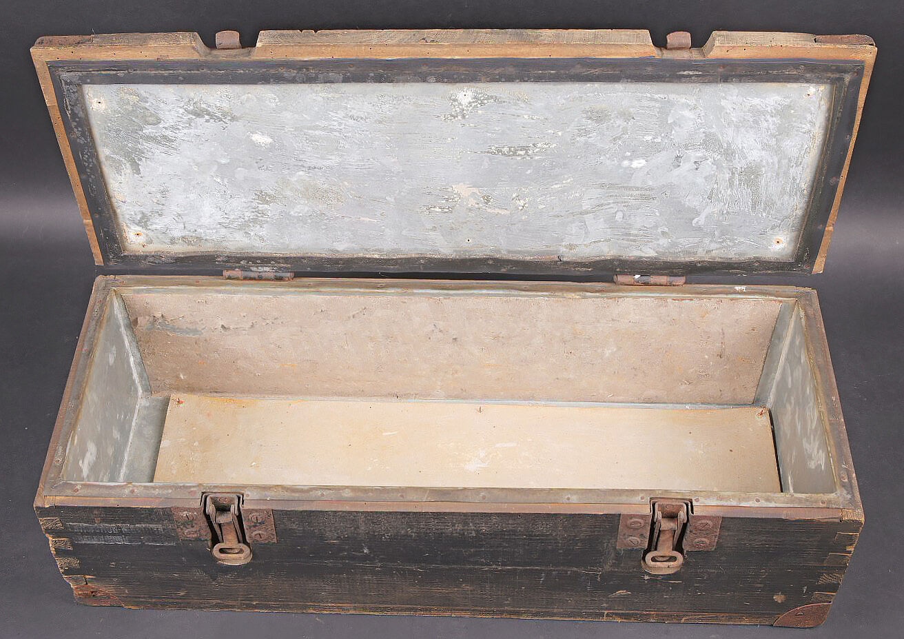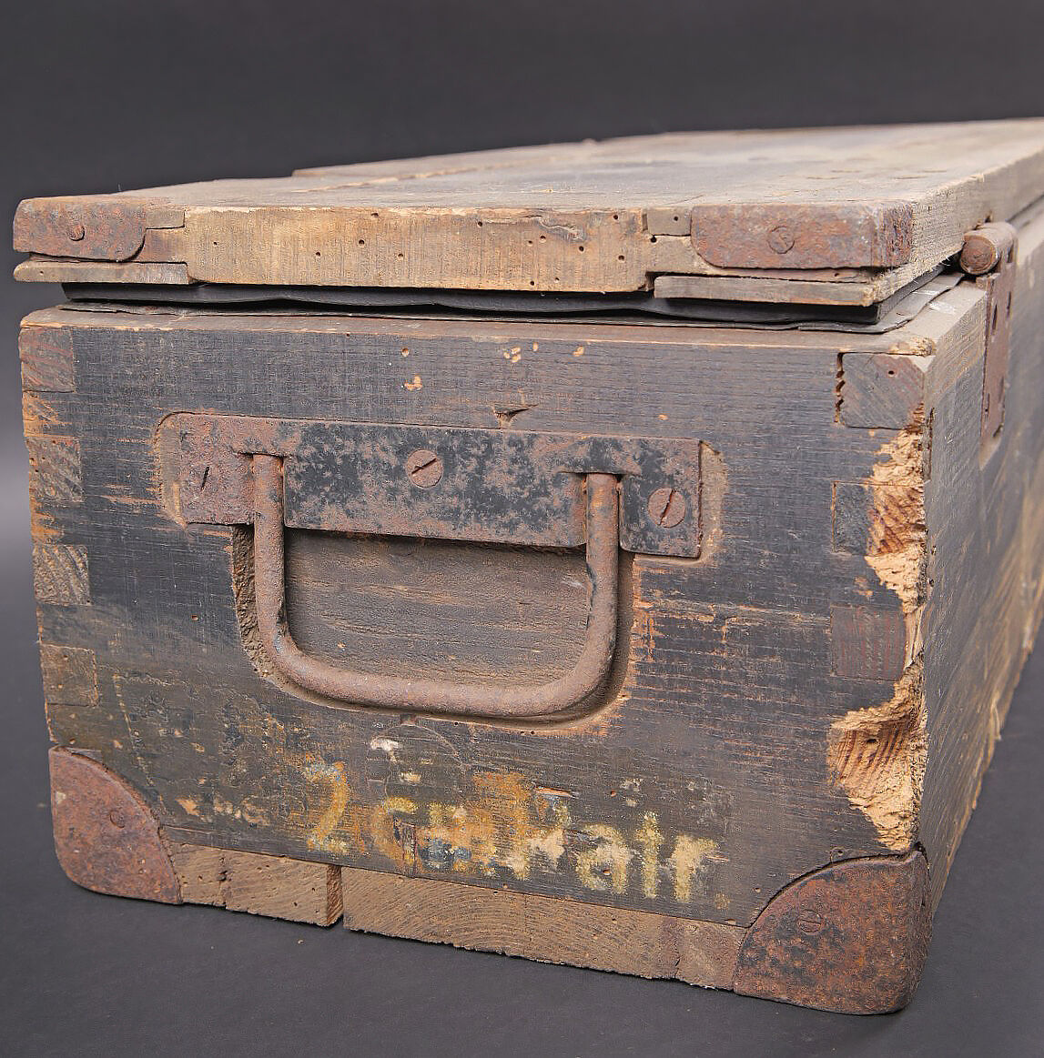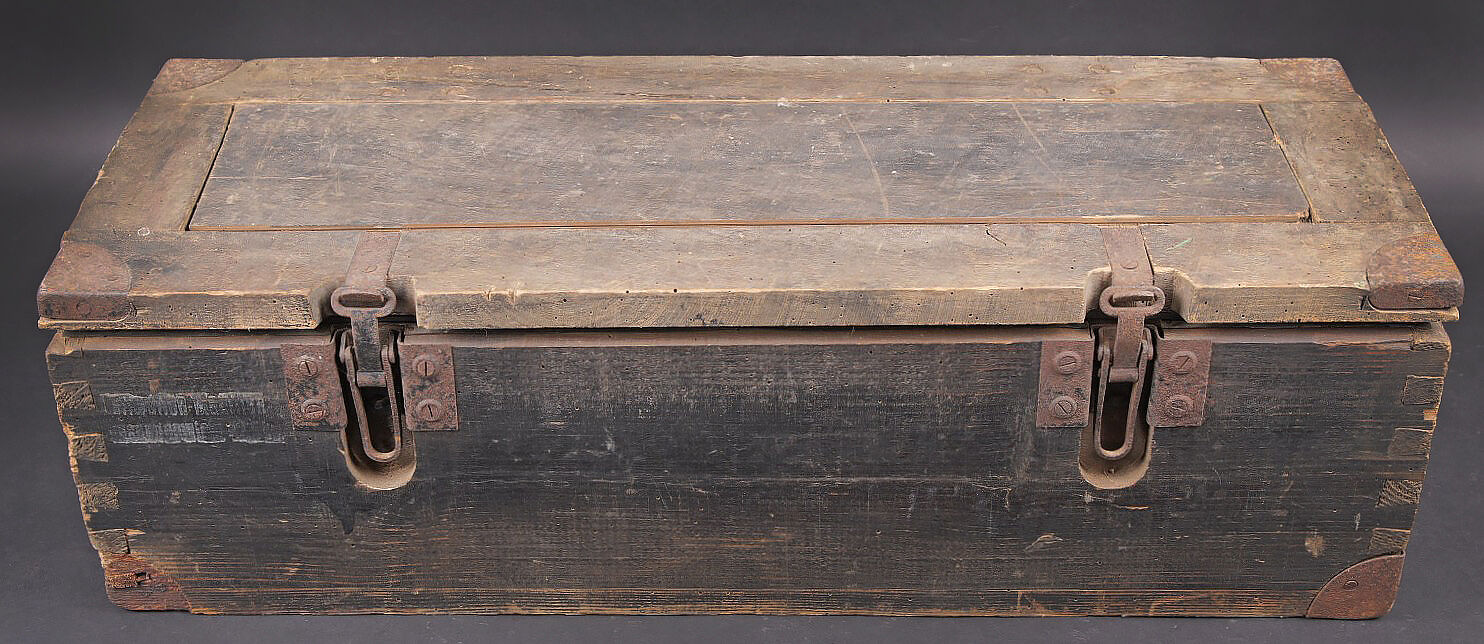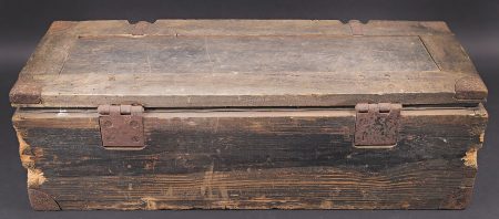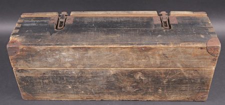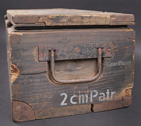 Caisse de 100 cartouches 2 cm Flak 30/38. Caisse en bois. Les poignées métalliques sont présentes. Fermeture par deux crochets fonctionnels. Reste de marquage 2cm Patr sur le côté de la caisse. Peinture Feldgrau à 70%. Reste d’étiquette incomplète sur la face avant de la caisse. Etanchéité assurée par un caisson intérieur en zinc et carton. Dimensions 67 x 26 x 20. A noter une certaine usure et patine de la pièce. Etat II+. Crate for 100 rounds 2 cm Flak.30/38 Wooden crate with metal carrying handles and two functional hook closures. Side marking 2 cm Patr. Feldgrau paint 70%. Remains of incomplete label on the front. Airtight inner liner in zinc and cardboard. Dimensions 67 × 26 × 20 cm. Showing normal wear and patina. Condition II+.