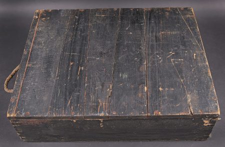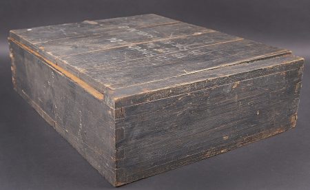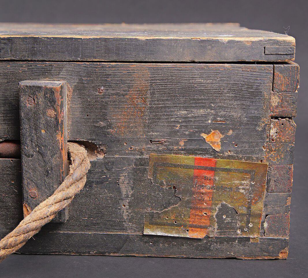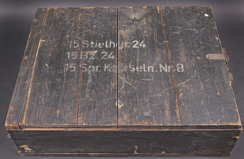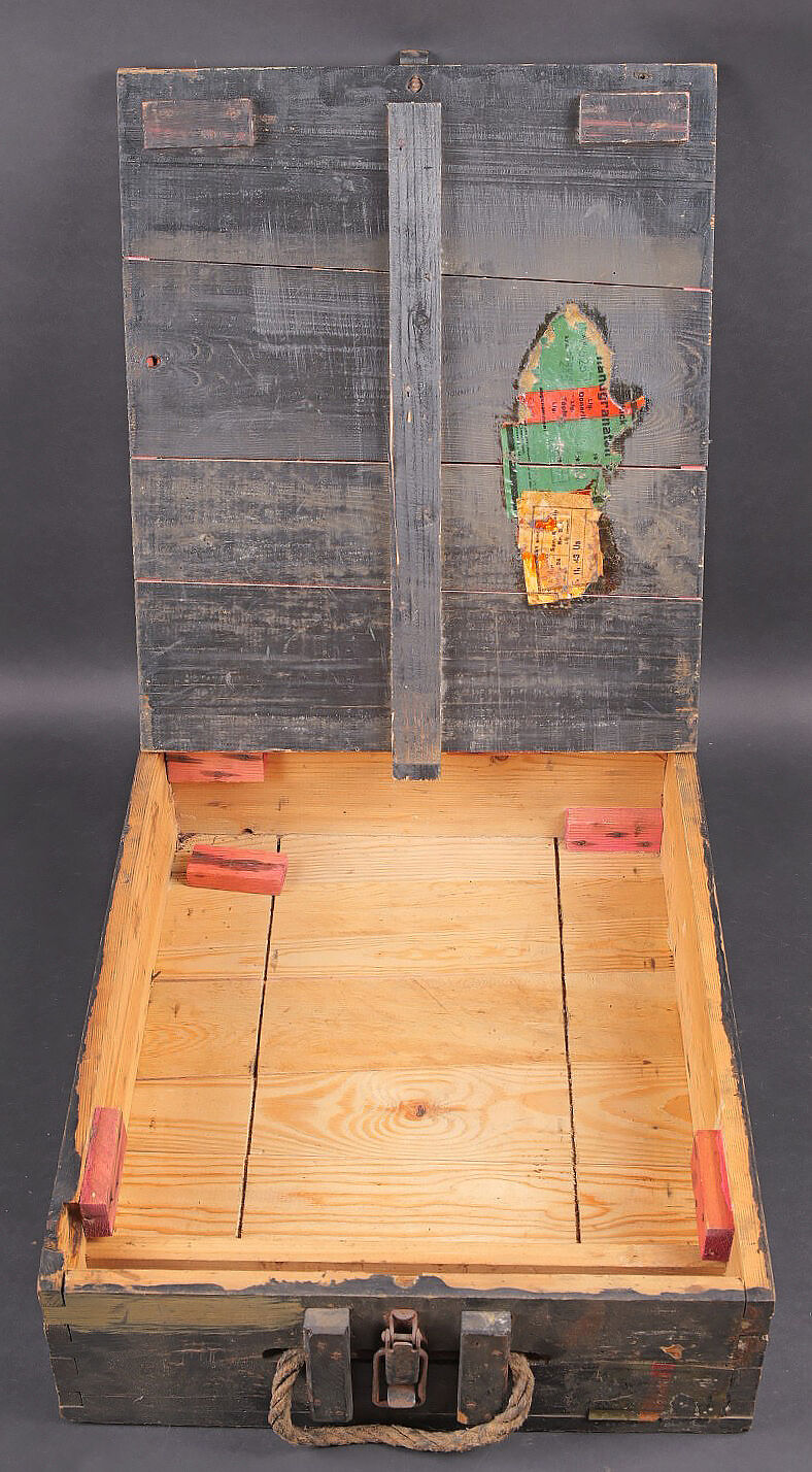 Caisse 15 Stielhandgranaten 24. Caisse en bois pour 15 grenades à manche Mle.24 (Stielhandgranaten 24). Fermeture par un crochet. Charnières par tétons en bois. Une poignée de transport en cordelette. Les grenades étaient logées dans un râtelier en bois. On y trouvait également une boite pour détonateurs et une boite pour allumeurs. Peinture noire à 80%. Couvercle marqué 15 Stielhgr 24 15 BZ 24 15 Spr Kapseln Nr8. Trace d’une étiquette sur la face avant. Les planchettes du couvercle sont partiellement désolidarisées. Rack interne incomplet. Reste d’étiquette présente sous le couvercle. Datée novembre 1943. Dimensions 50 x 39 x 14. A noter une certaine usure et patine de la pièce. Etat II+. Case for 15 Stielhandgranaten 24. Wooden case for 15 M24 stick hand grenades. Hook closure. Wooden peg hinges. Cord carrying handle. Originally fitted with a wooden internal rack for the grenades, with compartments for detonators and igniters. Black paint at 80%. Lid marked 15 Stielhgr 24 15 BZ 24 15 Spr Kapseln Nr 8. Trace of label on the front panel. Lid boards partially loose. Incomplete internal rack. Remains of label under the lid. Dated November 1943. Dimensions 50 × 39 × 14 cm. Showing normal wear and patina. Condition II+.