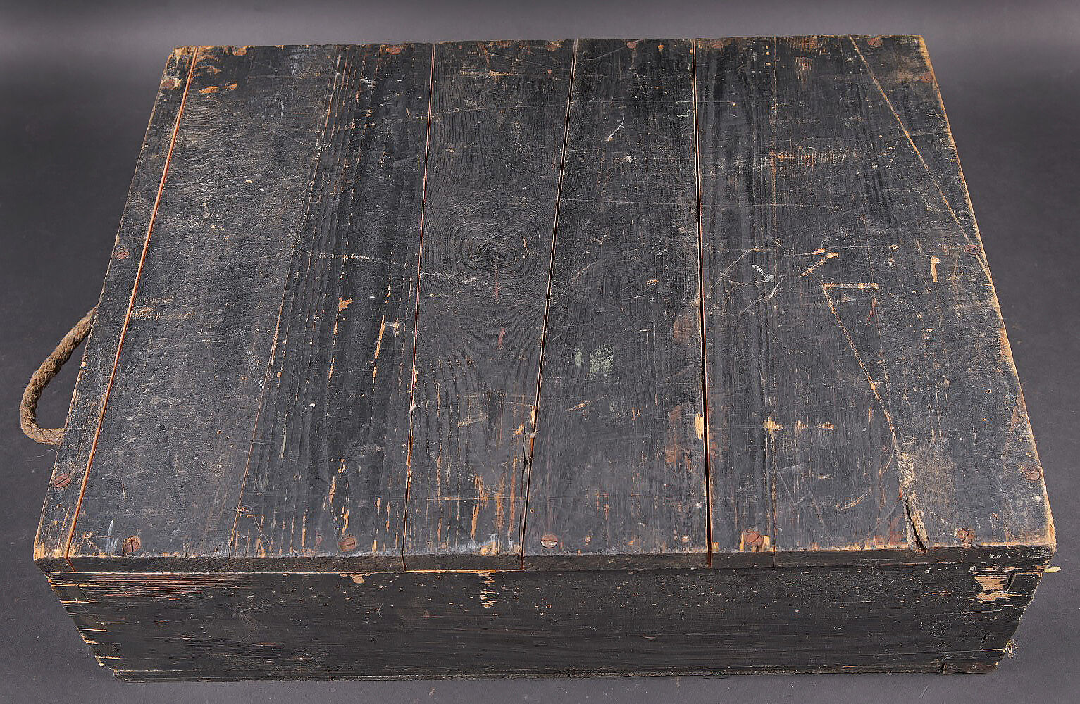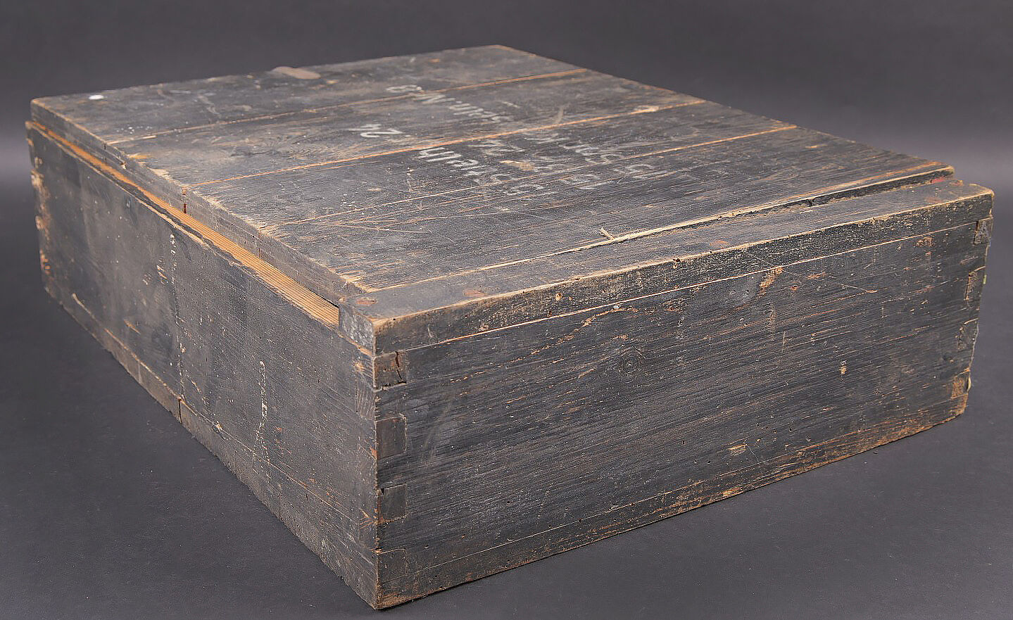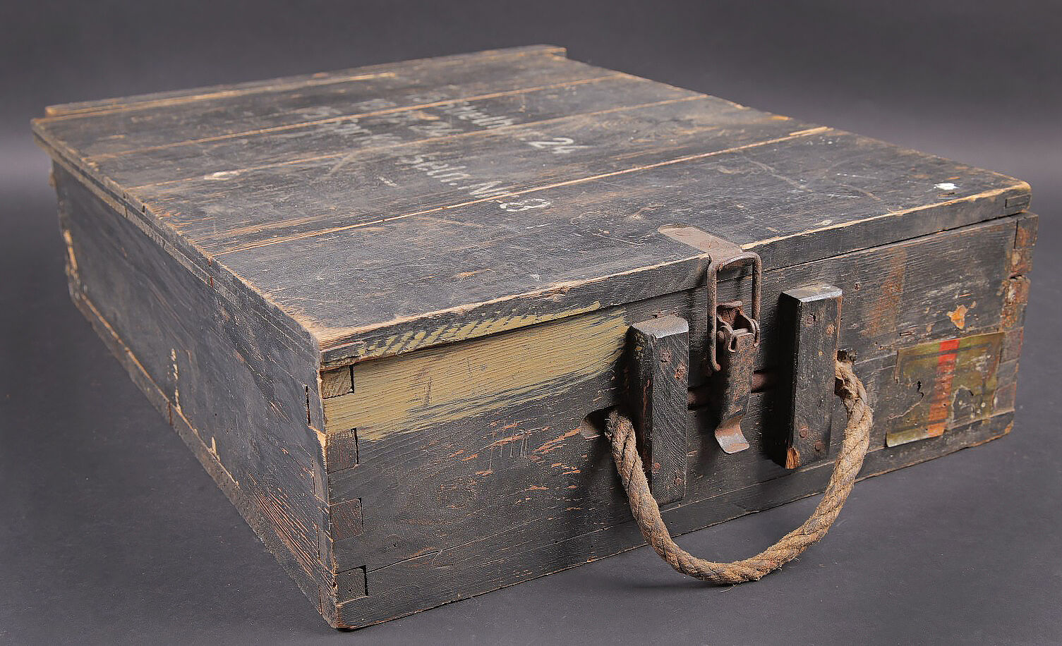 Caisse 15 Stielhandgranaten 24. Caisse en bois pour 15 grenades à manche Mle.24 (Stielhandgranaten 24). Fermeture par un crochet. Charnières par tétons en bois. Une poignée de transport en cordelette. Les grenades étaient logées dans un râtelier en bois. On y trouvait également une boite pour détonateurs et une boite pour allumeurs. Peinture noire à 80%. Couvercle marqué 15 Stielhgr 24 15 BZ 24 15 Spr Kapseln Nr8. Trace d’une étiquette sur la face avant. Les planchettes du couvercle sont partiellement désolidarisées. Rack interne incomplet. Reste d’étiquette présente sous le couvercle. Datée novembre 1943. Dimensions 50 x 39 x 14. A noter une certaine usure et patine de la pièce. Etat II+. Case for 15 Stielhandgranaten 24. Wooden case for 15 M24 stick hand grenades. Hook closure. Wooden peg hinges. Cord carrying handle. Originally fitted with a wooden internal rack for the grenades, with compartments for detonators and igniters. Black paint at 80%. Lid marked 15 Stielhgr 24 15 BZ 24 15 Spr Kapseln Nr 8. Trace of label on the front panel. Lid boards partially loose. Incomplete internal rack. Remains of label under the lid. Dated November 1943. Dimensions 50 × 39 × 14 cm. Showing normal wear and patina. Condition II+.